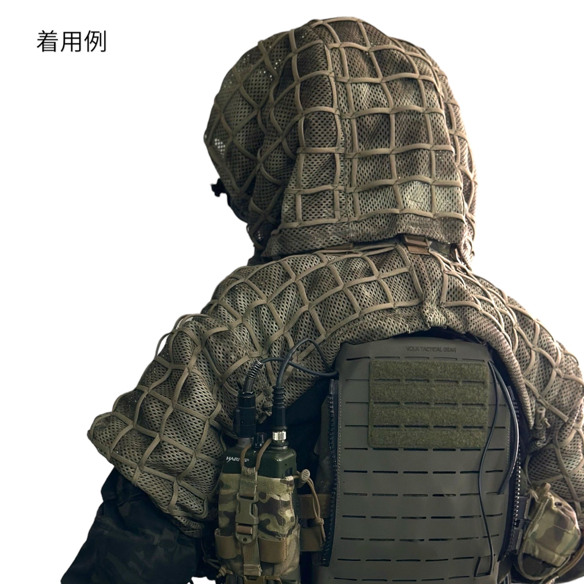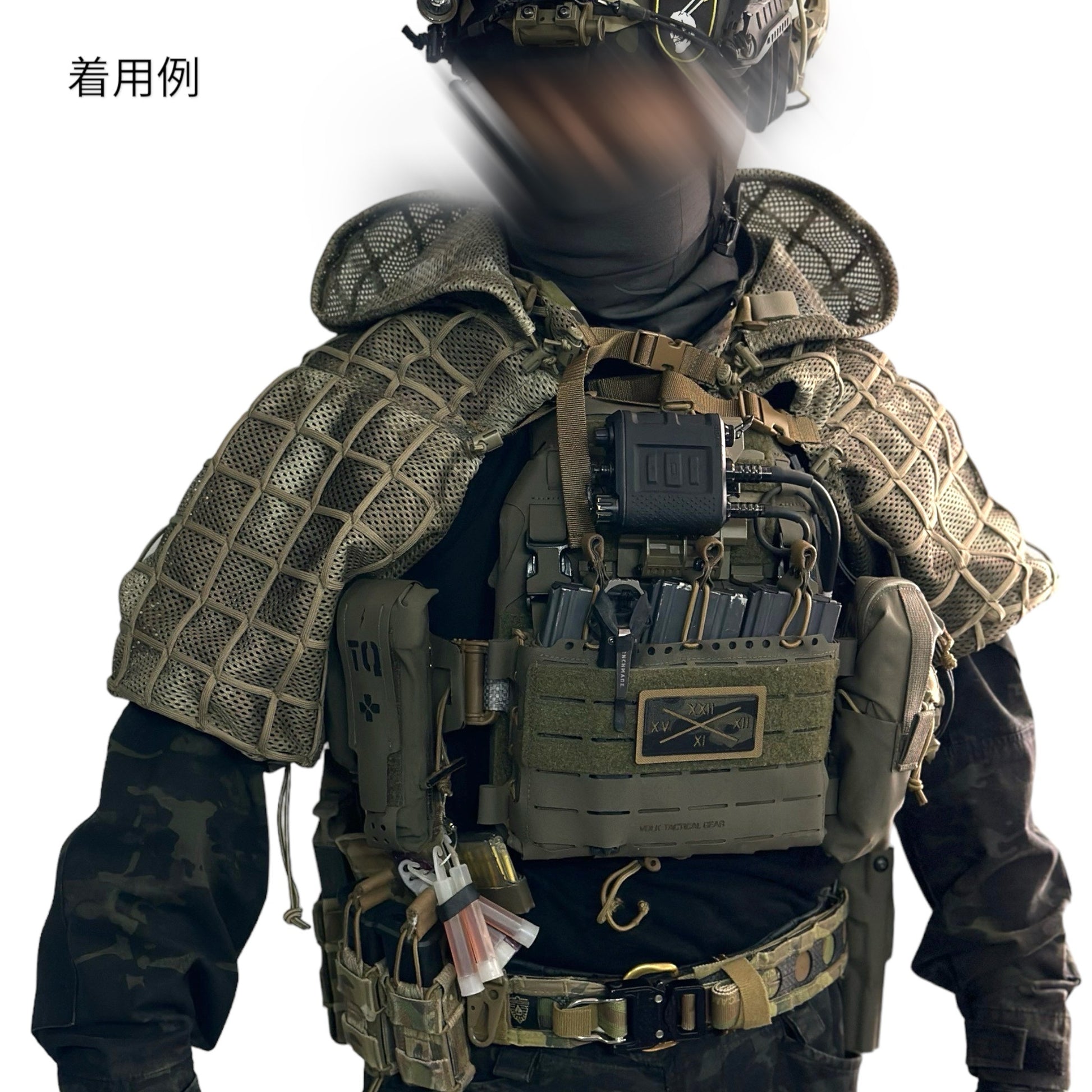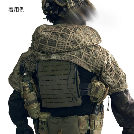 ヘルメットもしくはジャングルハットを着用したまま使用出来るようサイズを調整しました。ショルダー部本体への取り付けはベルクロテープで取り付けていますので、取り付け角度等の状態も調整可能。開閉部の広さもエラスティックコードとロックで調整可能。