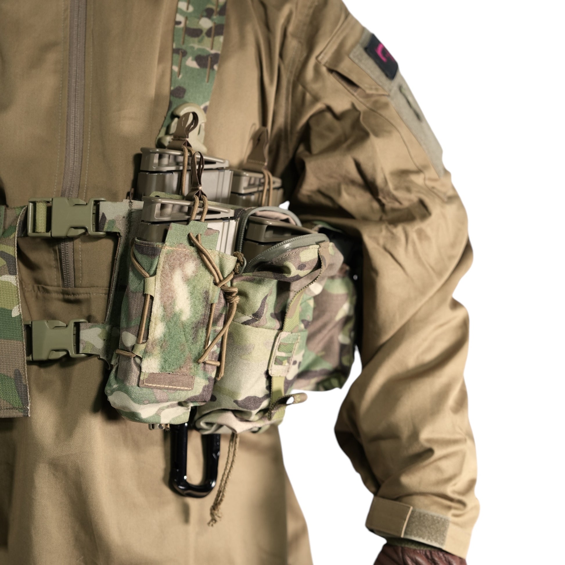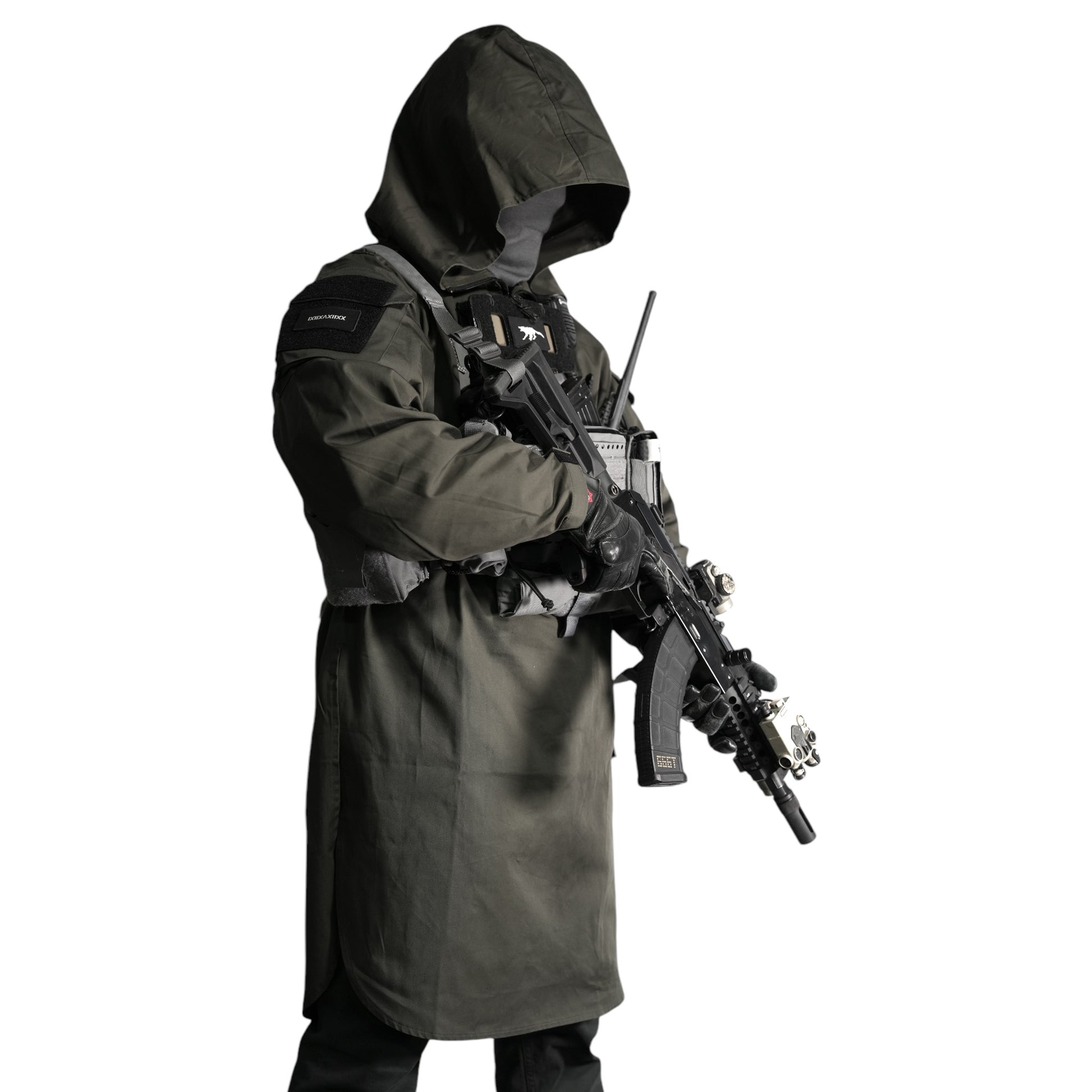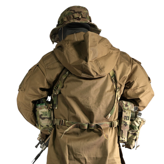 This product is designed to be worn with equipment and a sling, so the shoulder area has double layered fabric and many areas that are expected to be subject to heavy loads, such as the shoulders, arms, pocket flaps, and hood, are double stitched to ensure strength.