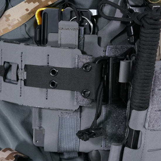 The Tegris core is sewn into Velcro One Wrap tape, which is threaded through the side of the part that is covered with Squadron, which has laser-cut slits on the Tegris plate. Secure the release kit by threading this Velcro One Wrap Tape strap through the cummerbund molding. (*See attached video)