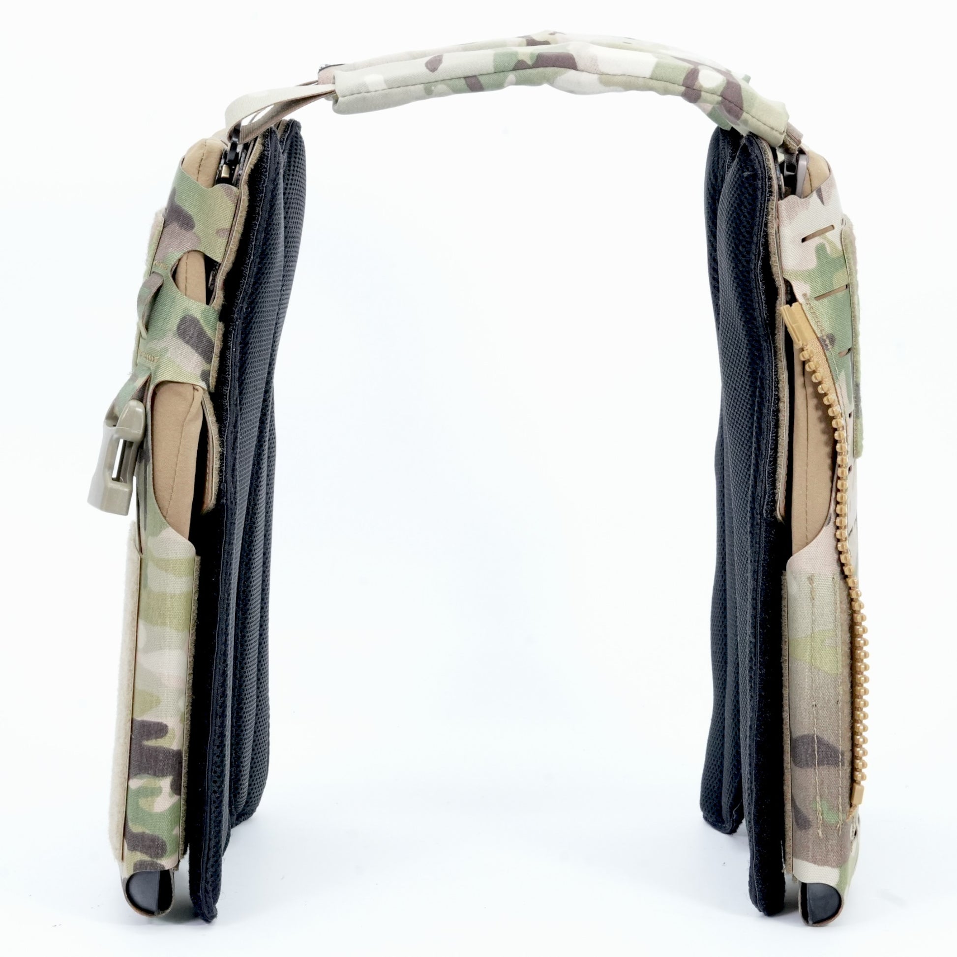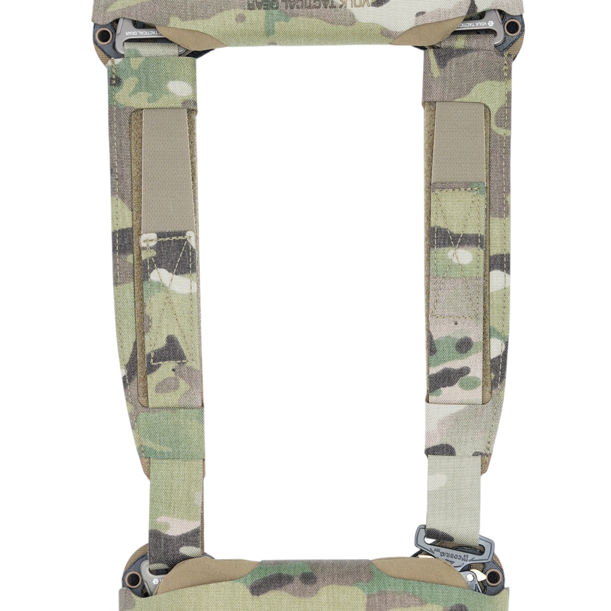 細身(38mm)のショルダーハーネスには柔軟で弾力性の高いパッドが付属しており、細身ながらしっかりと荷重を分散させます。ショルダーハーネスは、プレートバッグ内部のインナーフレームと高強度Dリングで接続されます。前後どちらもフレキシブルに動く仕様で着用者の様々な動きと骨格に追従し、動きを妨げない設計です。