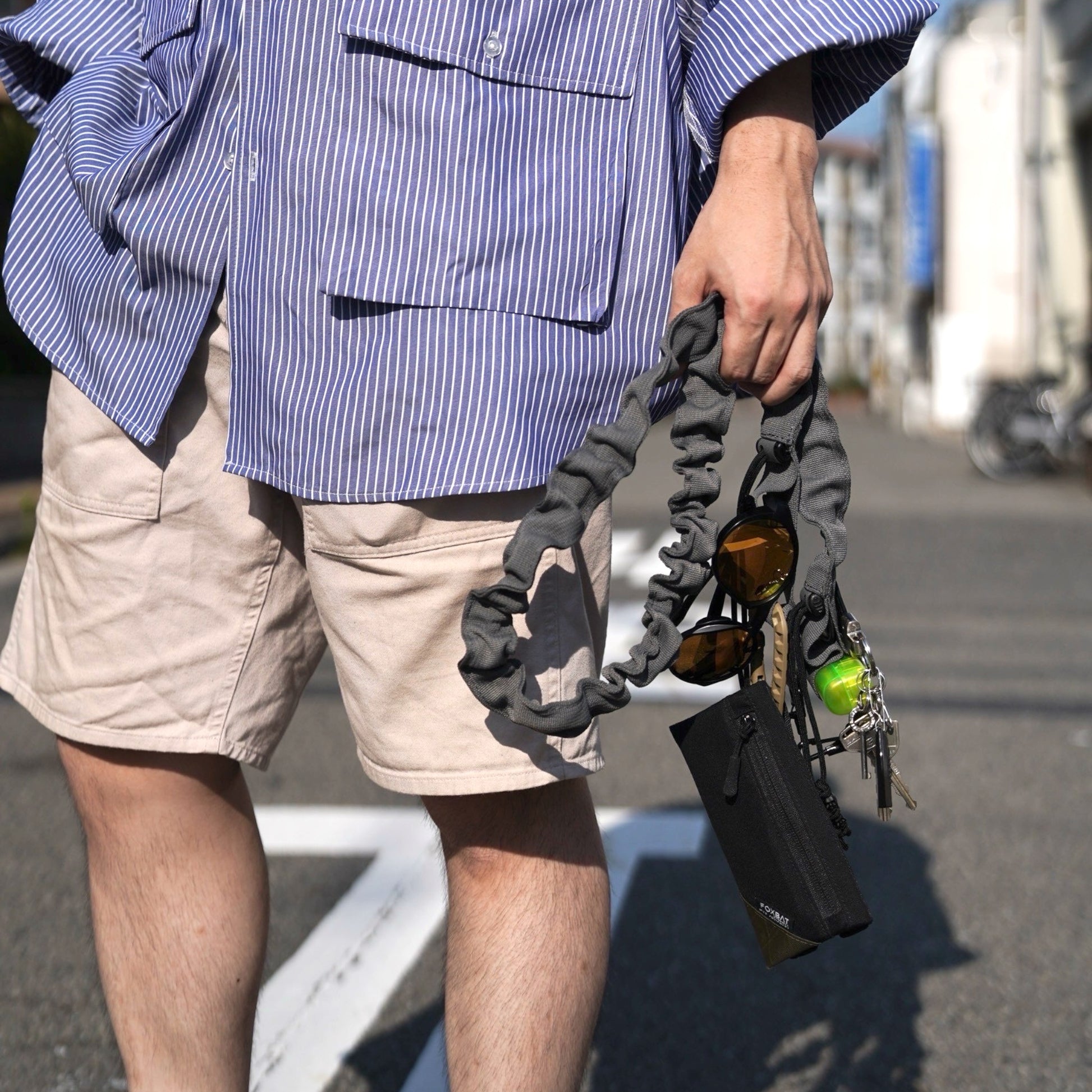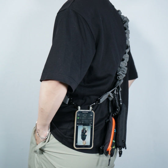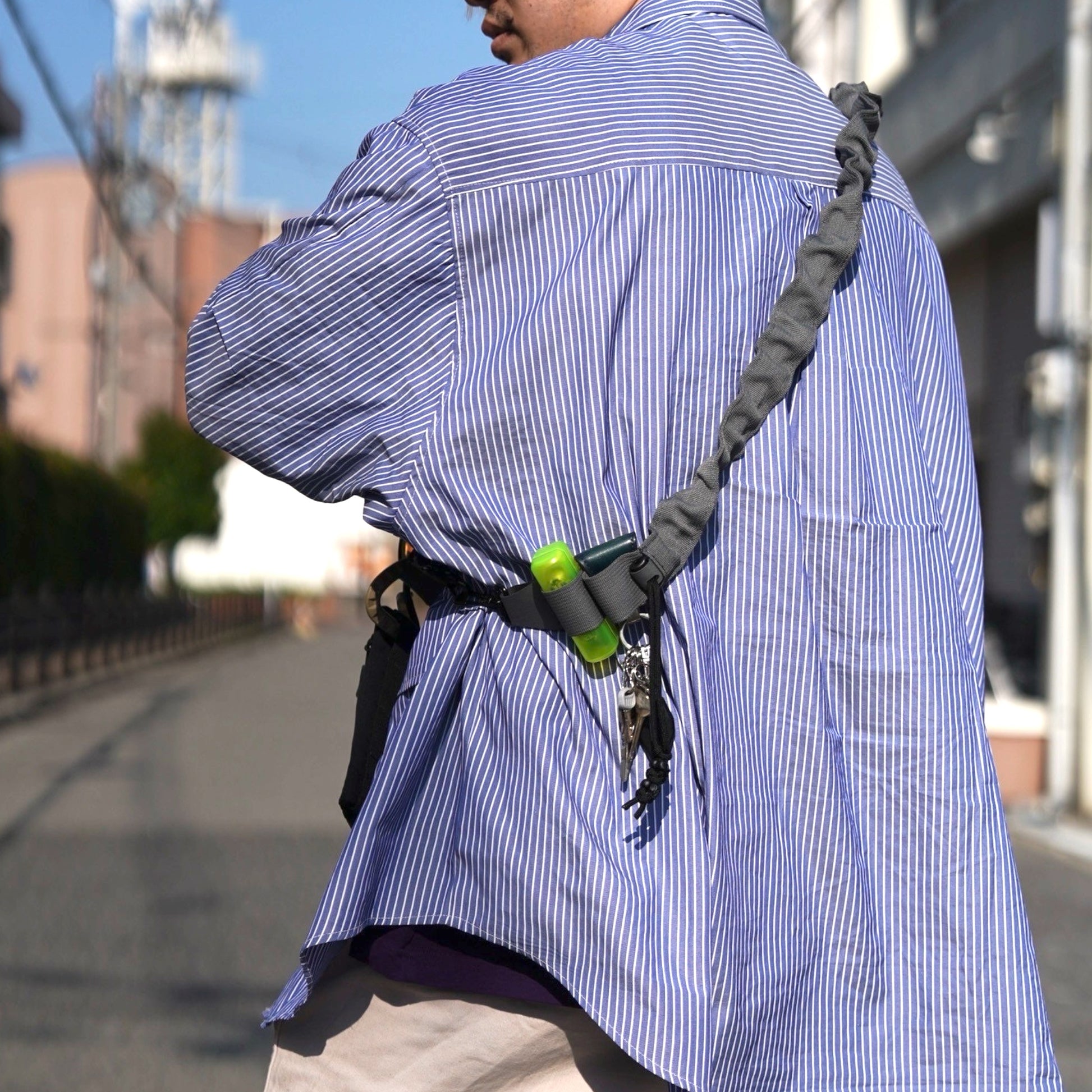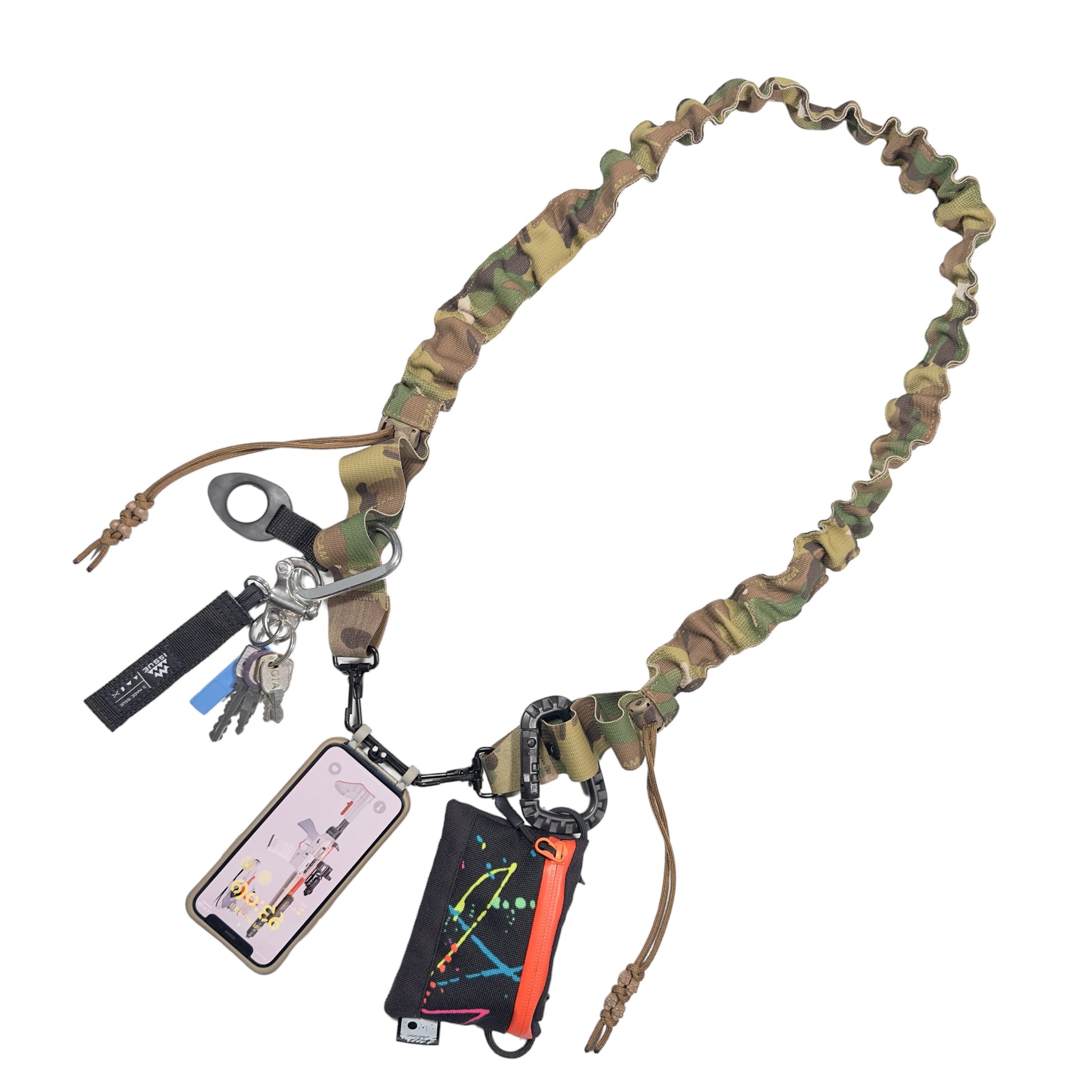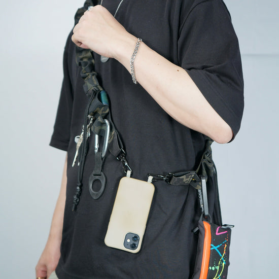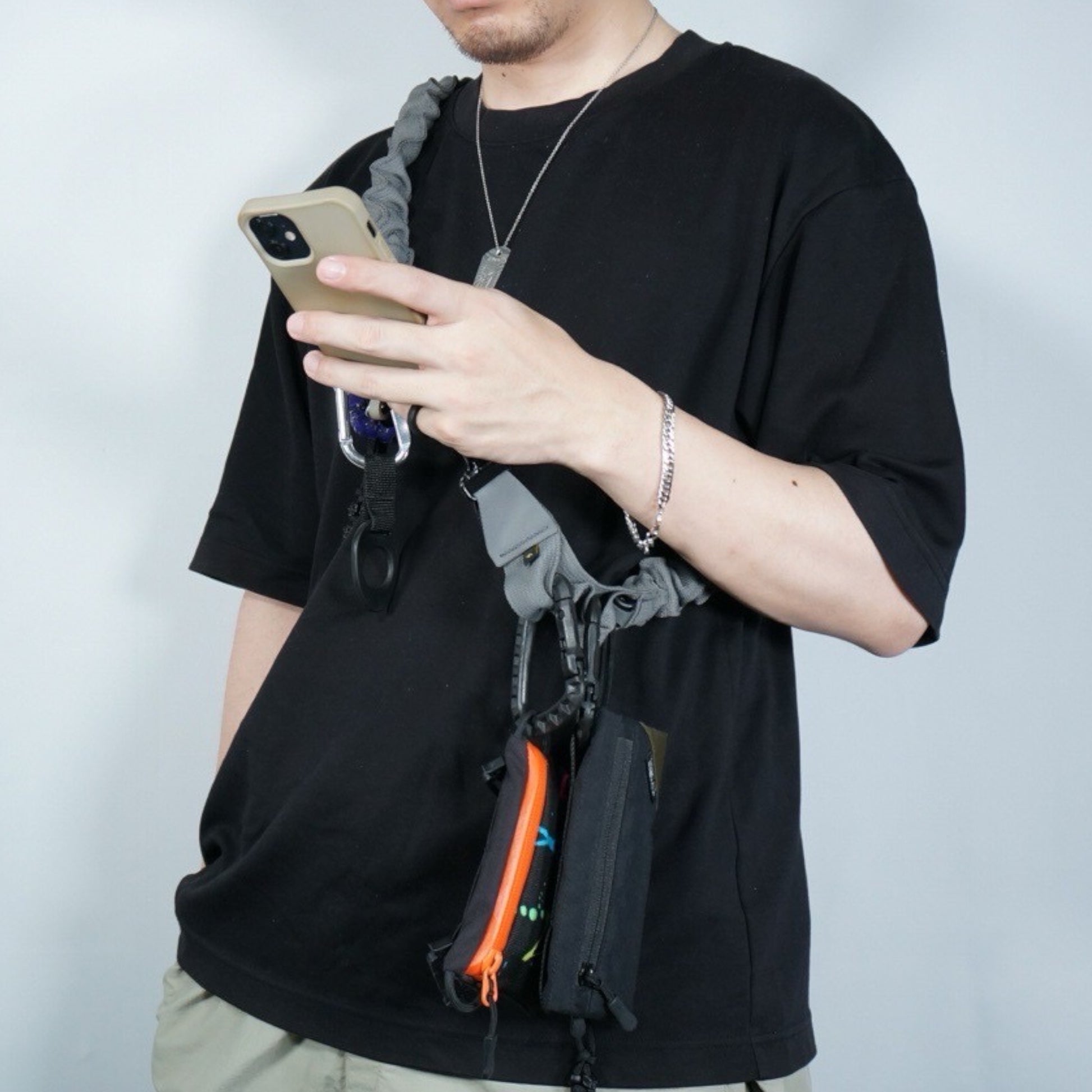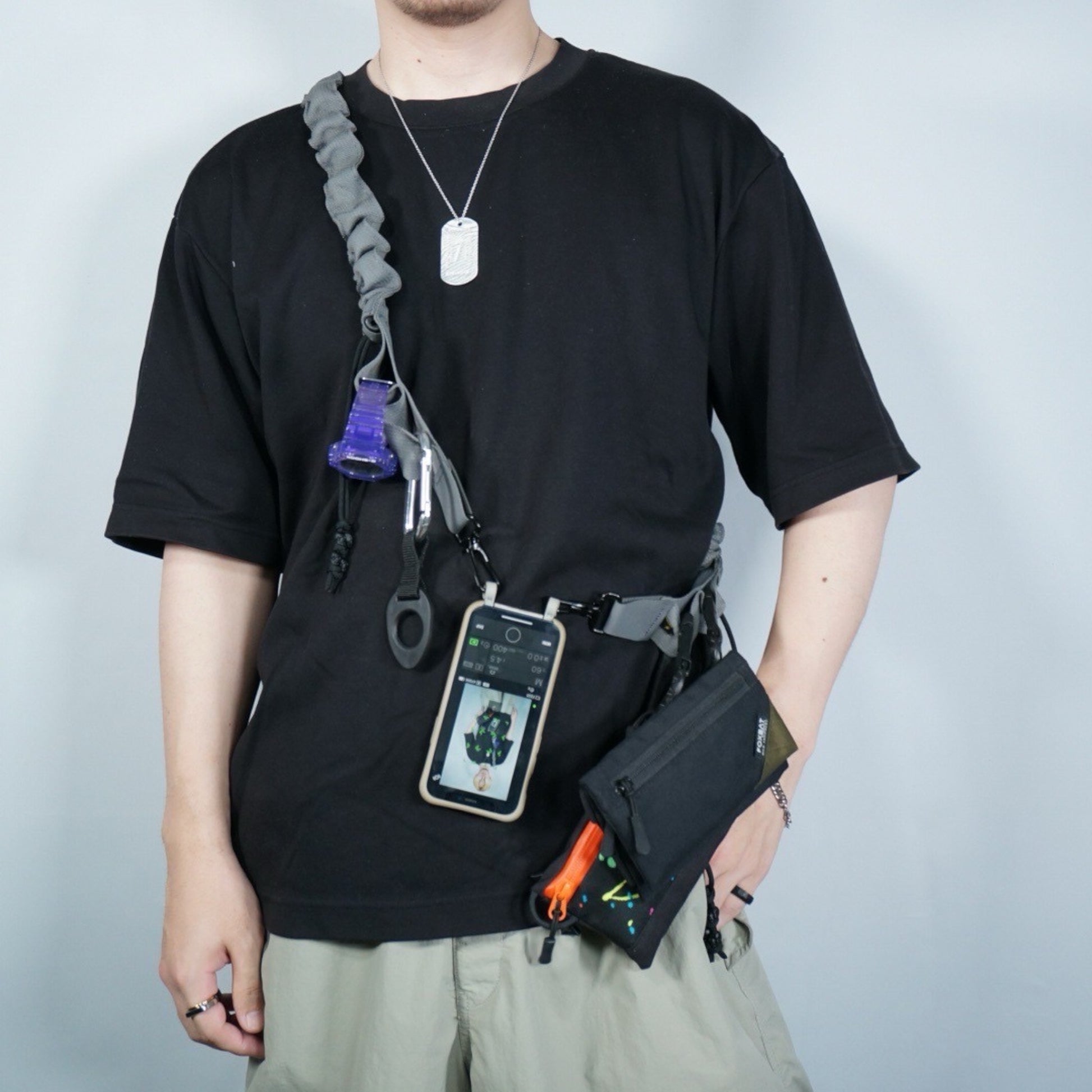 The EDC GEAR CHAIN is a shoulder chain made of paracord and nylon webbing, and the length can be instantly adjusted using the cord locks on both sides.