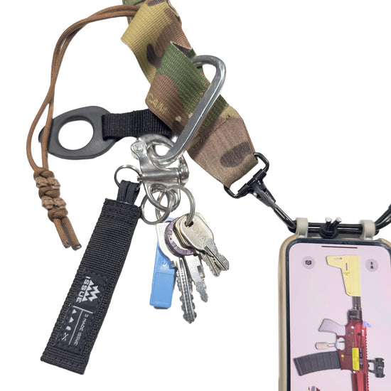 The four webbing loops on both ends can be used to attach key holders, carabiners, etc. The hook can be used to attach a smartphone holder, pouch, or other item.