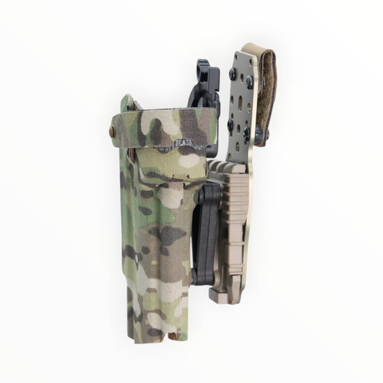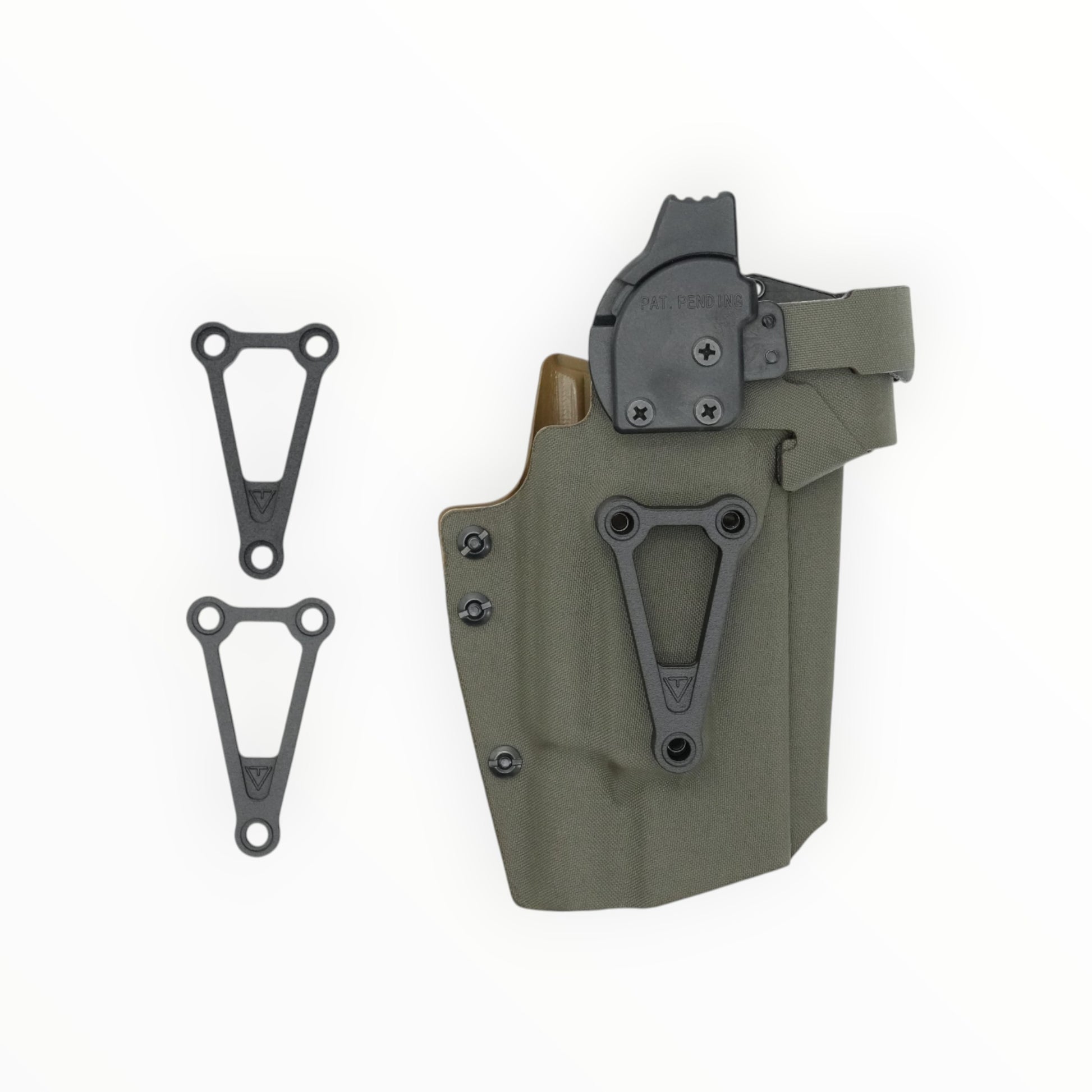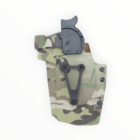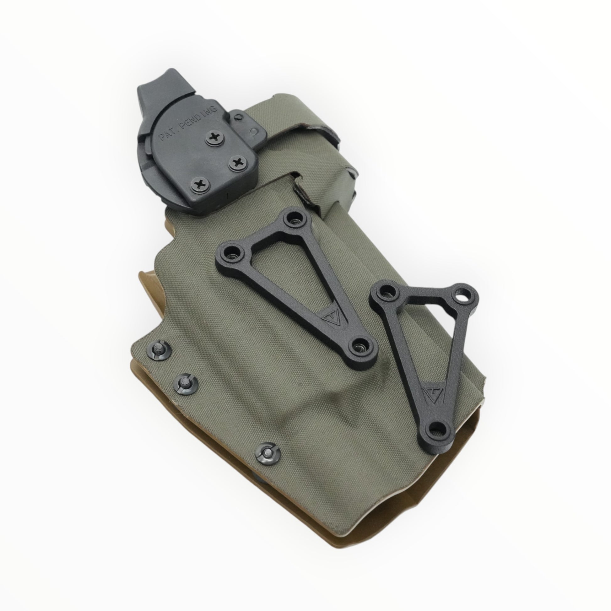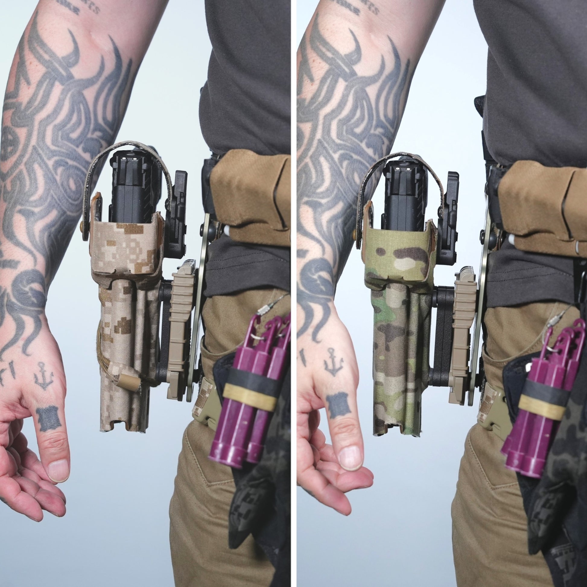 ベルトやプレートキャリア上のマガジンポーチ、ラジオ、IFAKなどと拳銃が干渉しづらくなり、引っかかりや誤動作を低減。 -