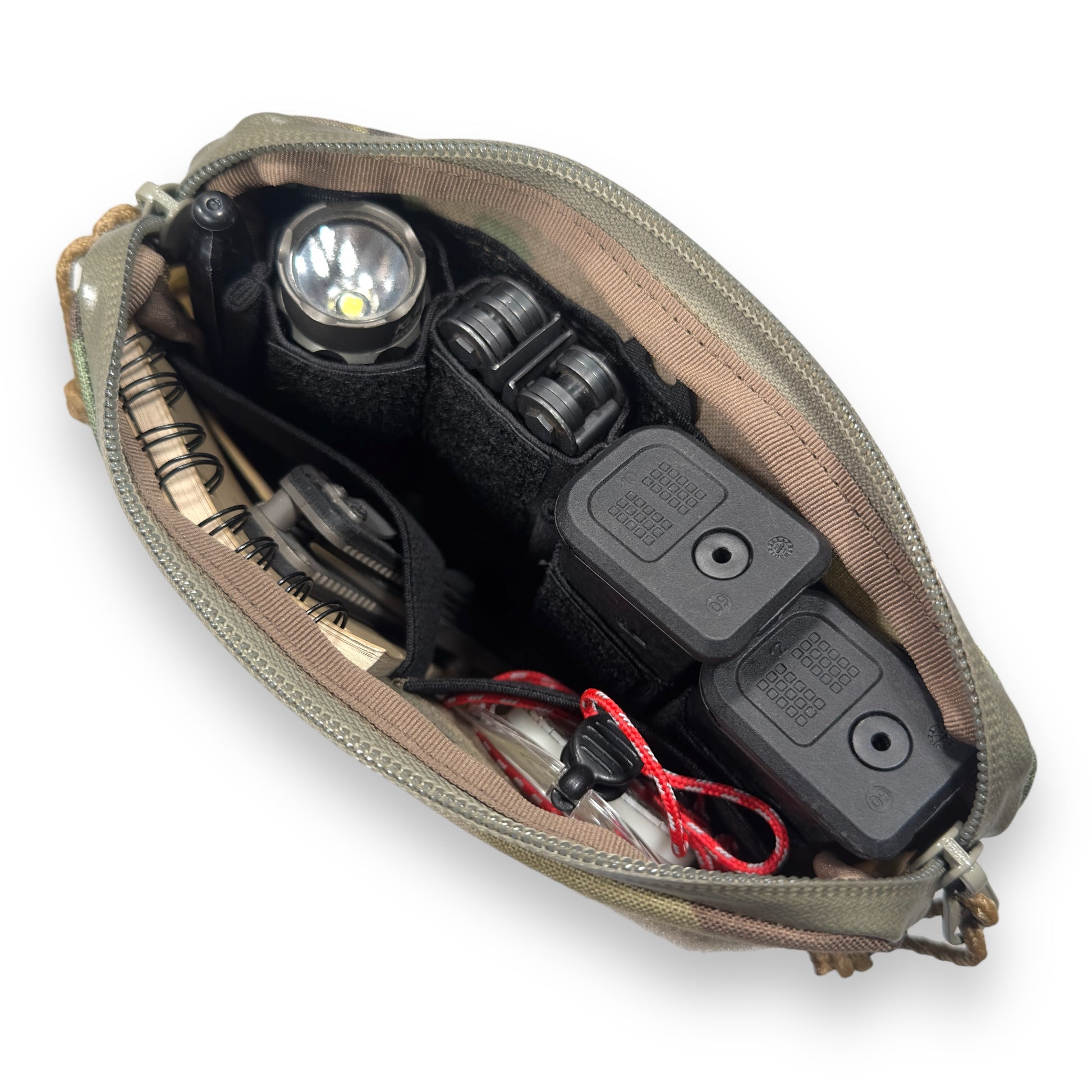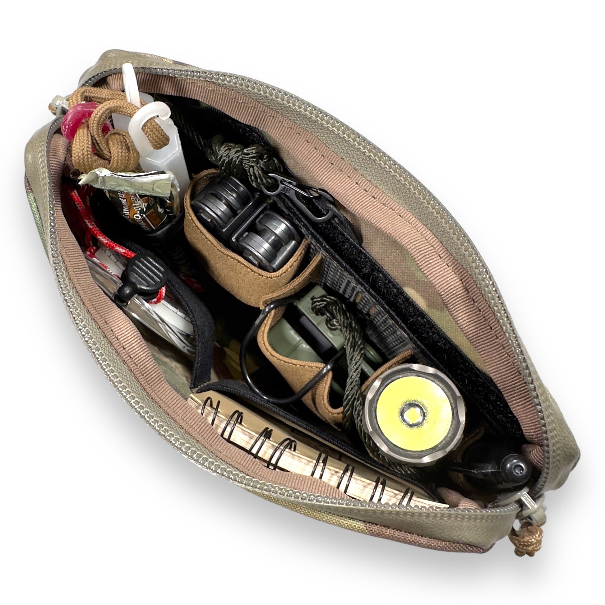 In addition, elastic bands and Velcro loops are sewn into the inside of the pouch, allowing you to secure and separate the contents. Multi-fit loops and various elastic inserts can be attached to the Velcro loops as needed, making them useful for storage. In addition, Squadron material loops are also provided at the top three points of the internal Velcro, so you can tie valuables you don't want to lose with string or cord.