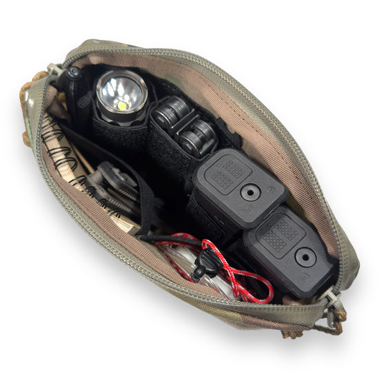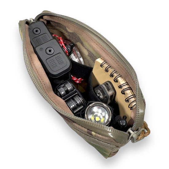 The vertical width has been increased from the previous wide zip pouch, making it possible to store items that could not be stored in the previous size. The zipper has also been upgraded to a waterproof zipper, and the pull tab has been changed from paracord to a locking cord. The locking cord has a woven, uneven surface that provides a non-slip effect, making it easy to grab even with wet hands or while wearing gloves.