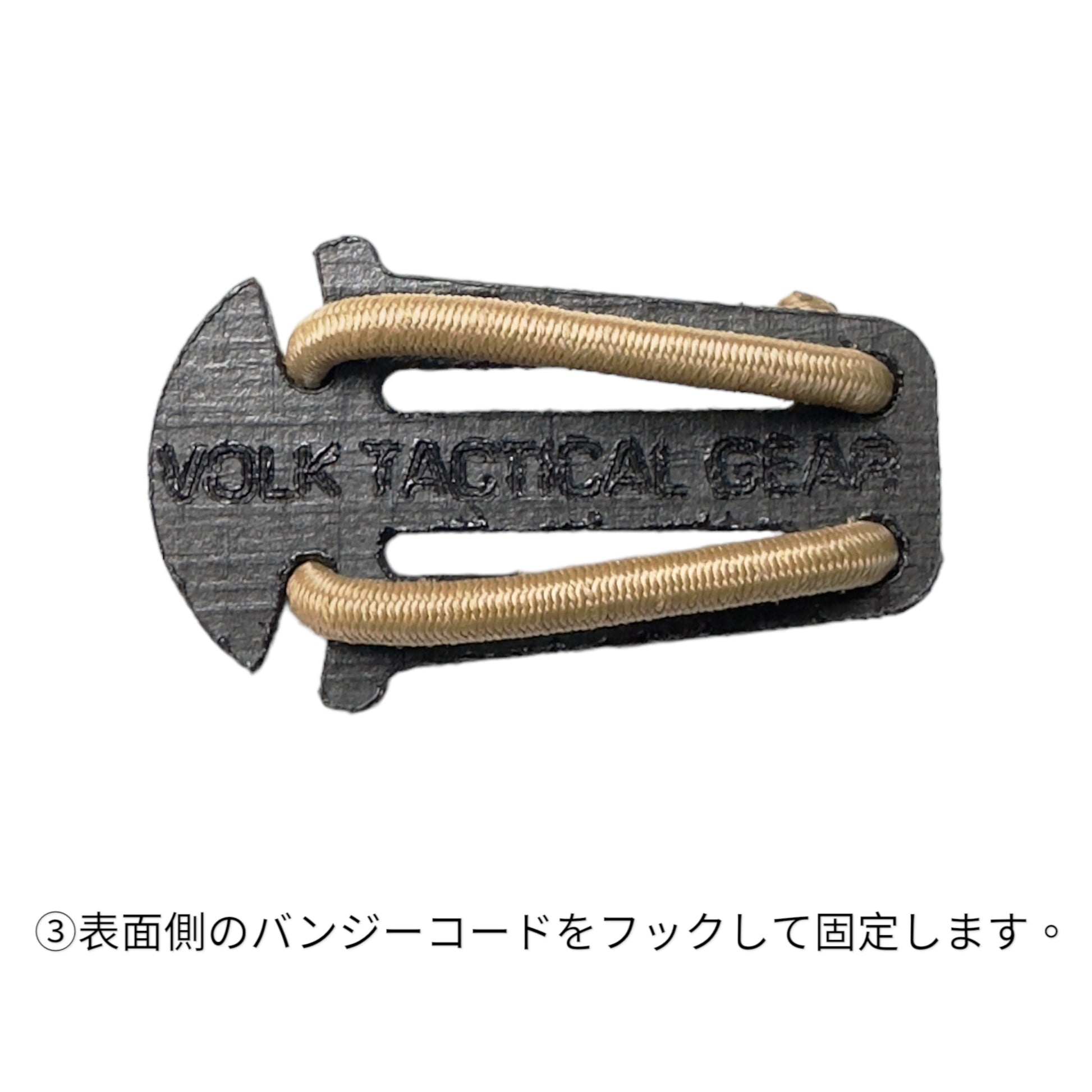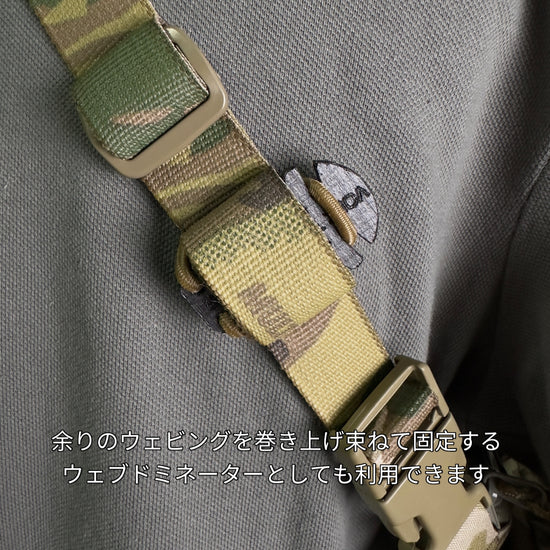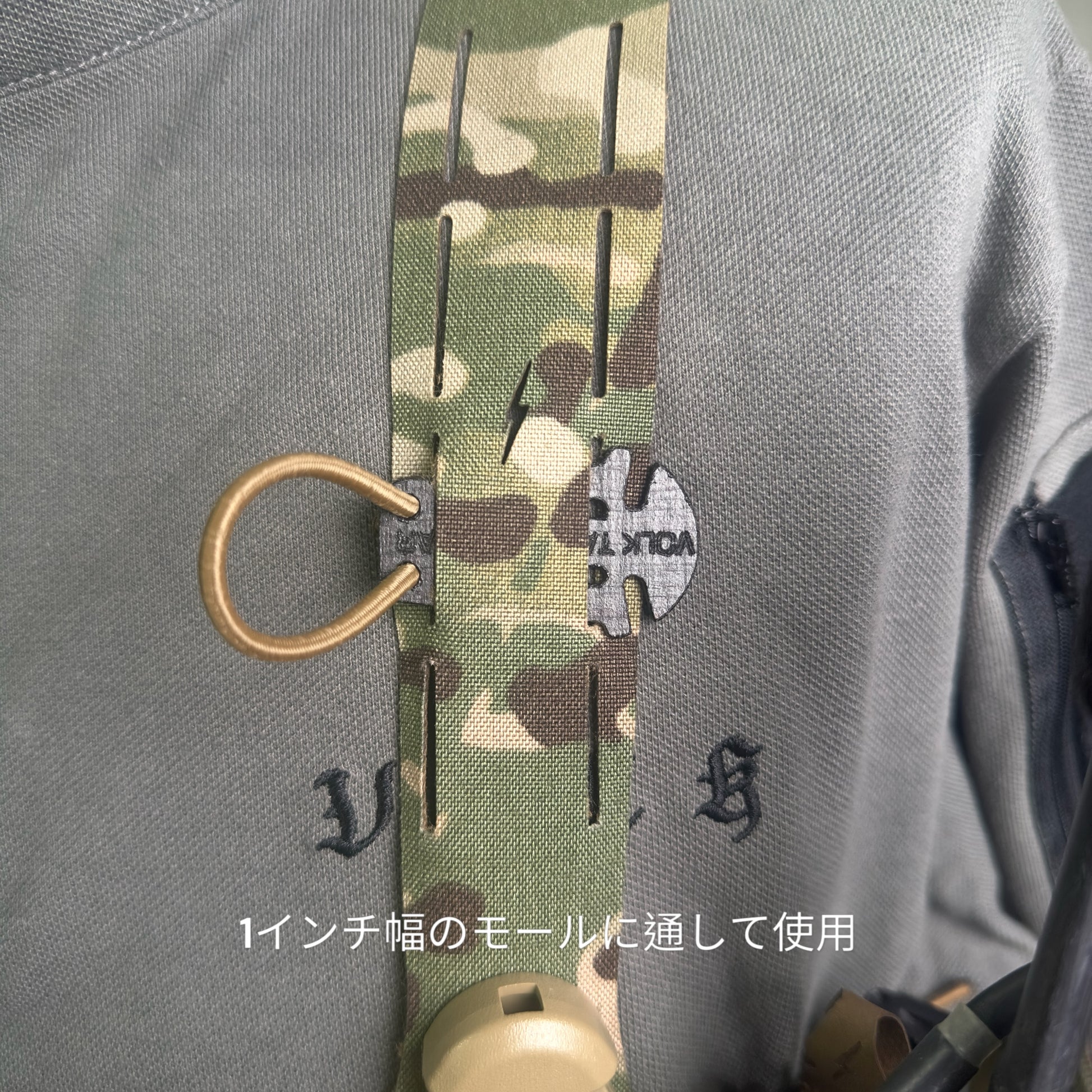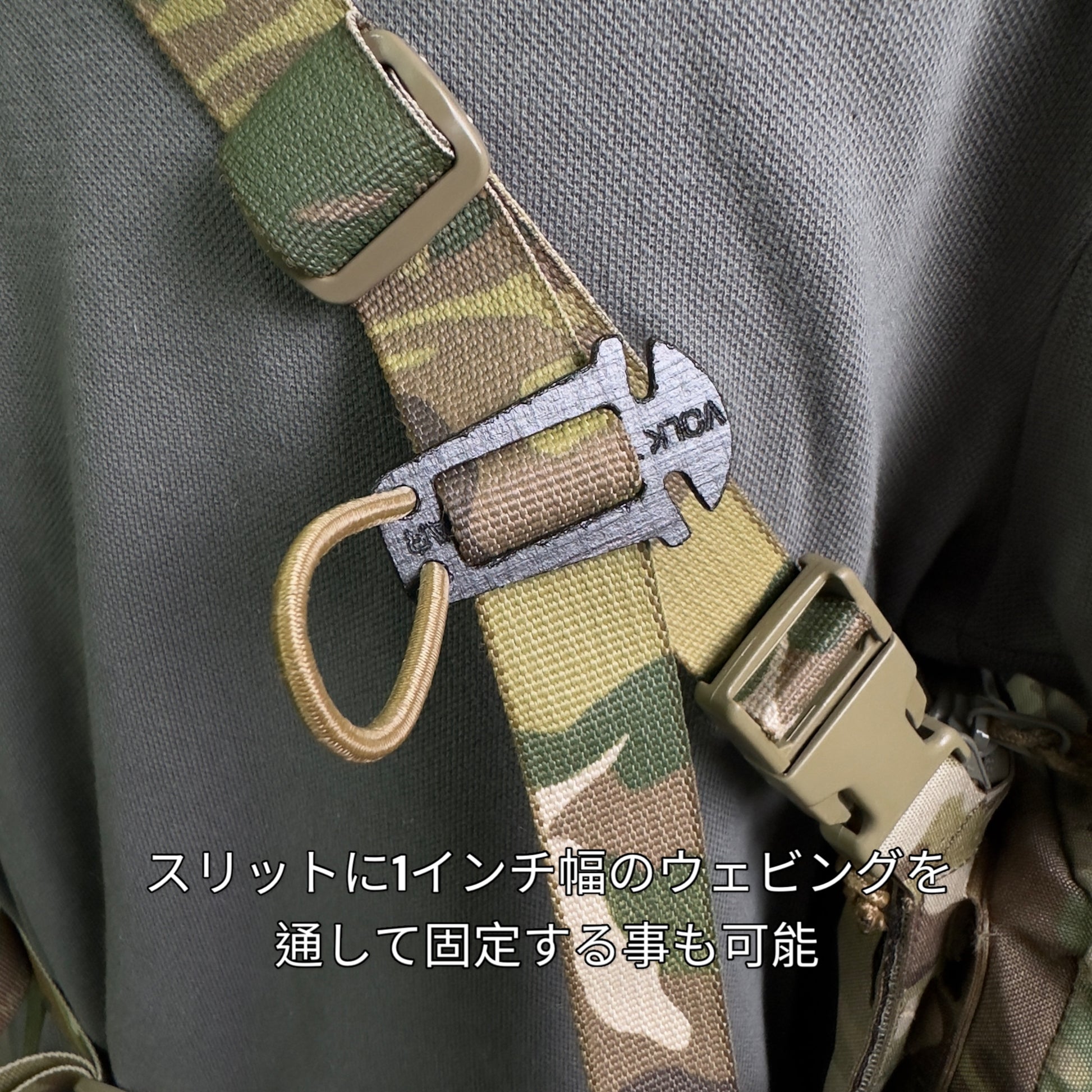 Laser-cut Morse slit and added 1 inch wide triglide feature. This allows it to be directly fixed to 1 inch webbing straps, improving its functionality as a web dominator. Furthermore, in order to improve the degree of fixation of the PTT switch, the area of the fixing part has also been made slightly larger.