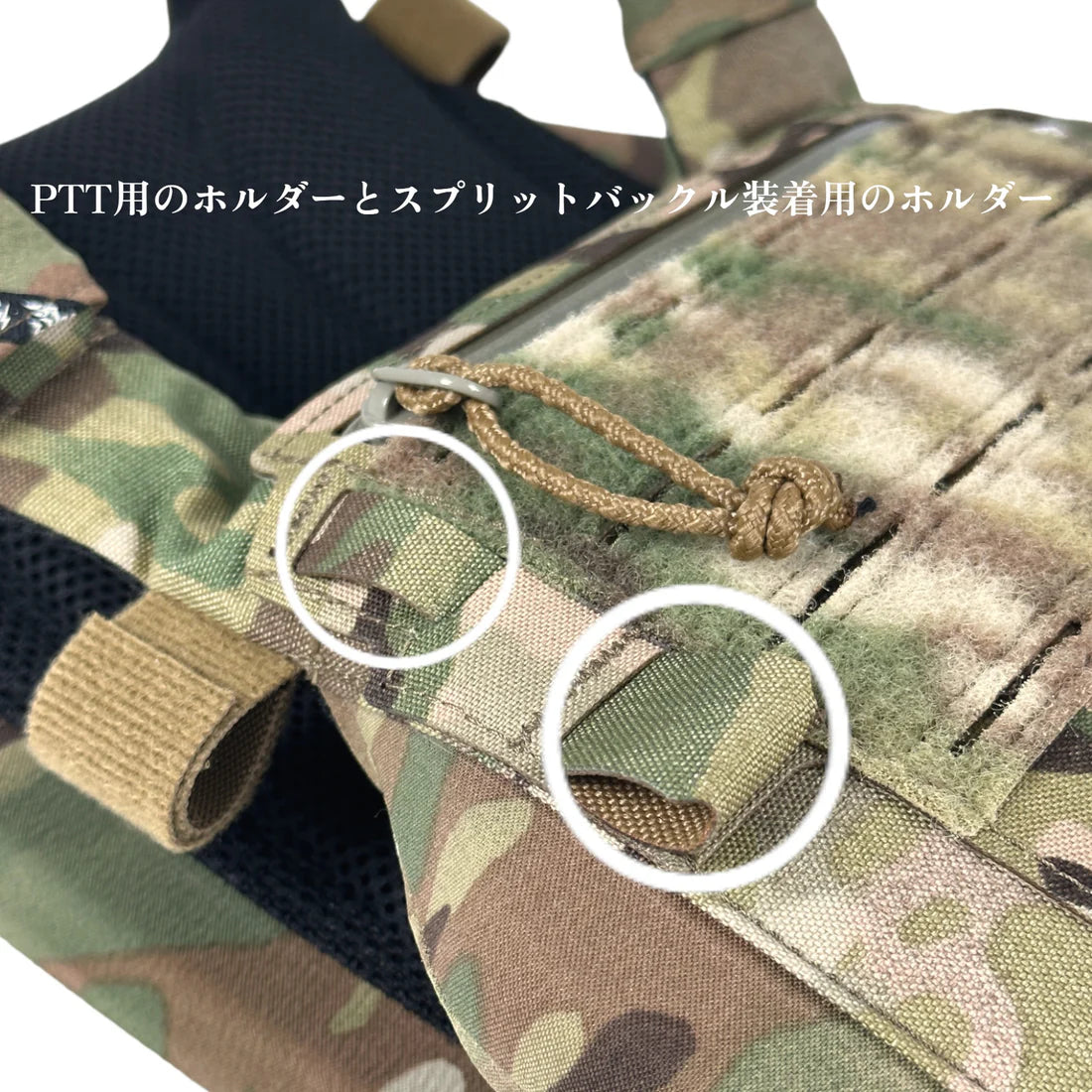 There are two squadron loops on the left and right sides of the front for attaching a PTT switch (PTT keeper). There are also loops for attaching two 1-inch split buckles required for attaching the core.
