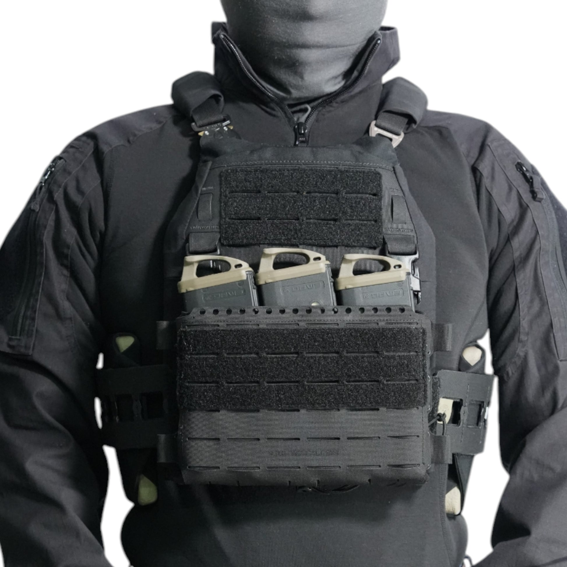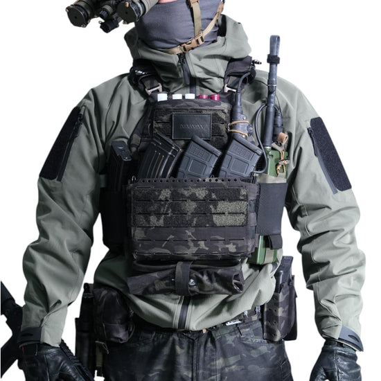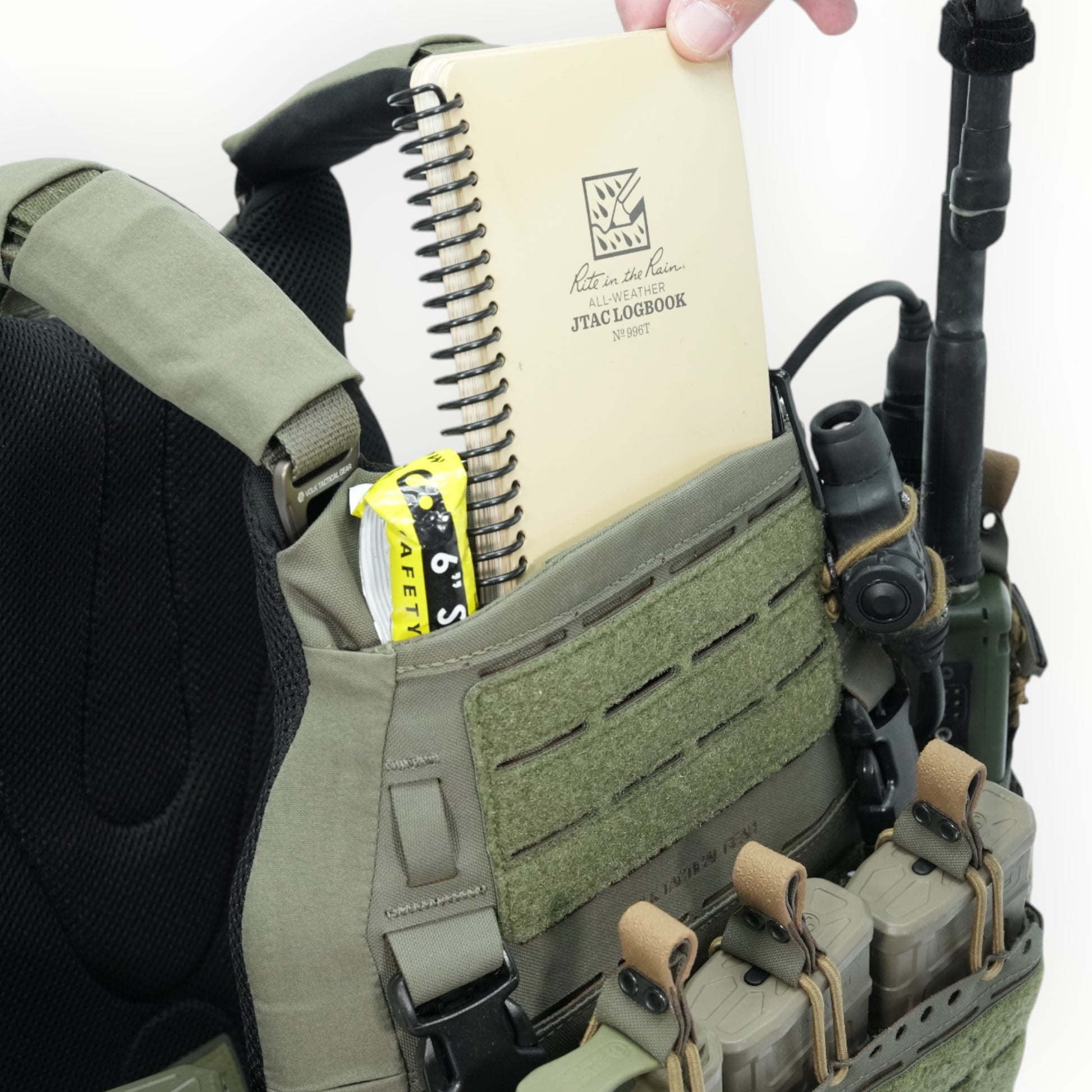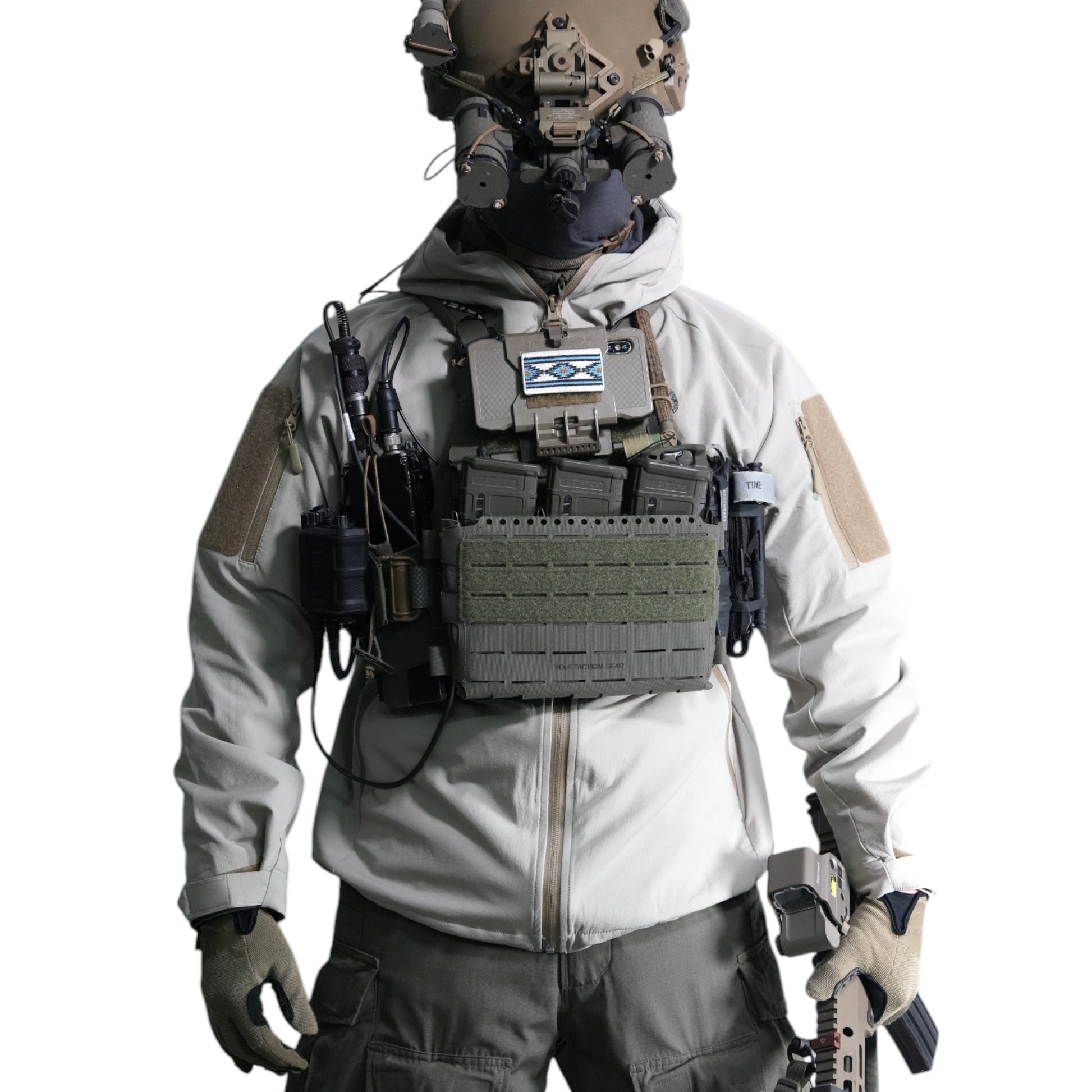 The front carrier features a slit pocket on the chest area (secured with Velcro, measuring 16 cm wide × 14 cm deep), suitable for carrying maps, notebooks, or smartphones. On both sides of the chest Velcro panel, Squadron loops are integrated for attaching PTT switches (PTT keepers). Below these loops, there are additional loops for securing two 1-inch split buckles, which are necessary for attaching the core.
