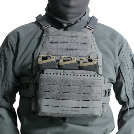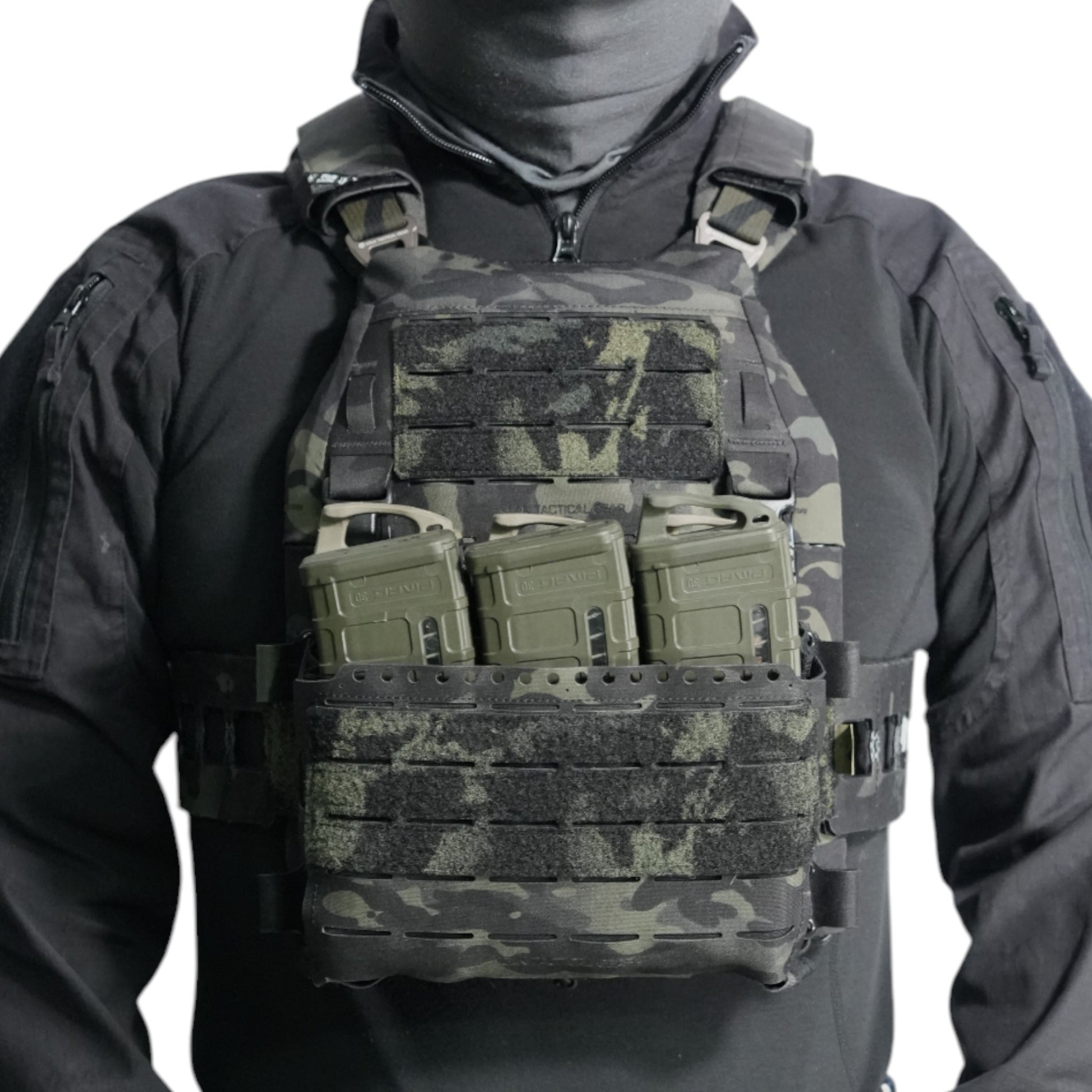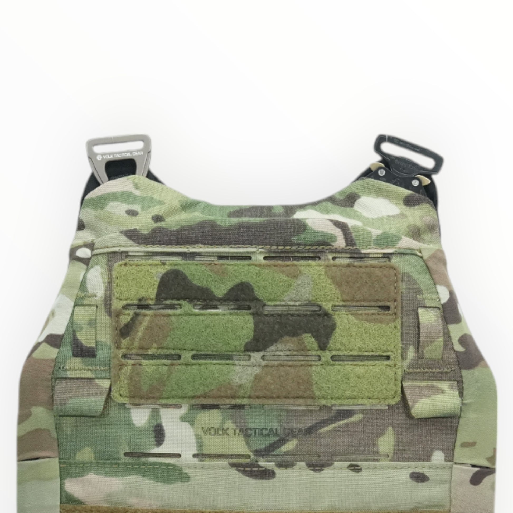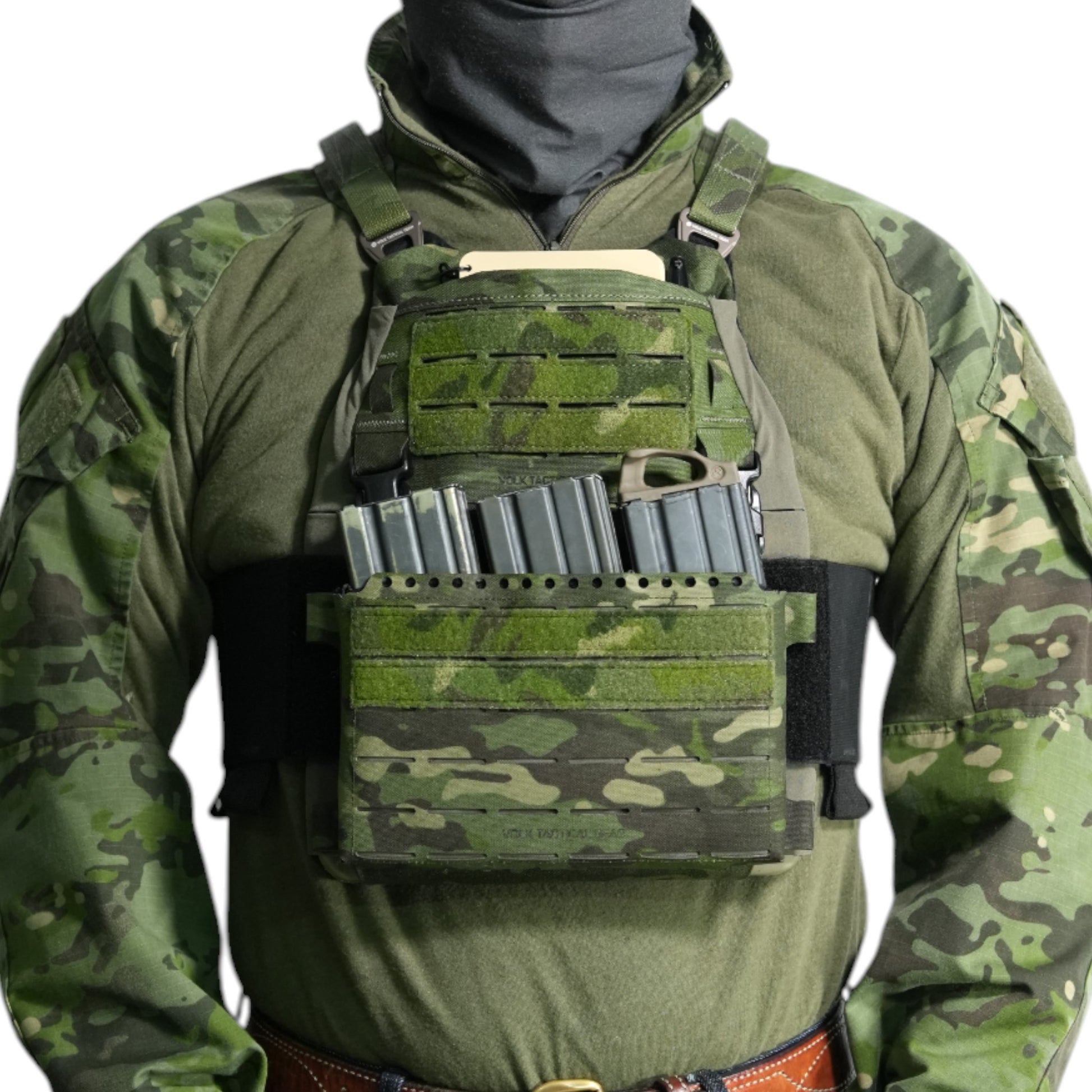 The front carrier features a slit pocket on the chest area (secured with Velcro, measuring 16 cm wide × 14 cm deep), suitable for carrying maps, notebooks, or smartphones. On both sides of the chest Velcro panel, Squadron loops are integrated for attaching PTT switches (PTT keepers). Below these loops, there are additional loops for securing two 1-inch split buckles, which are necessary for attaching the core.