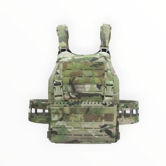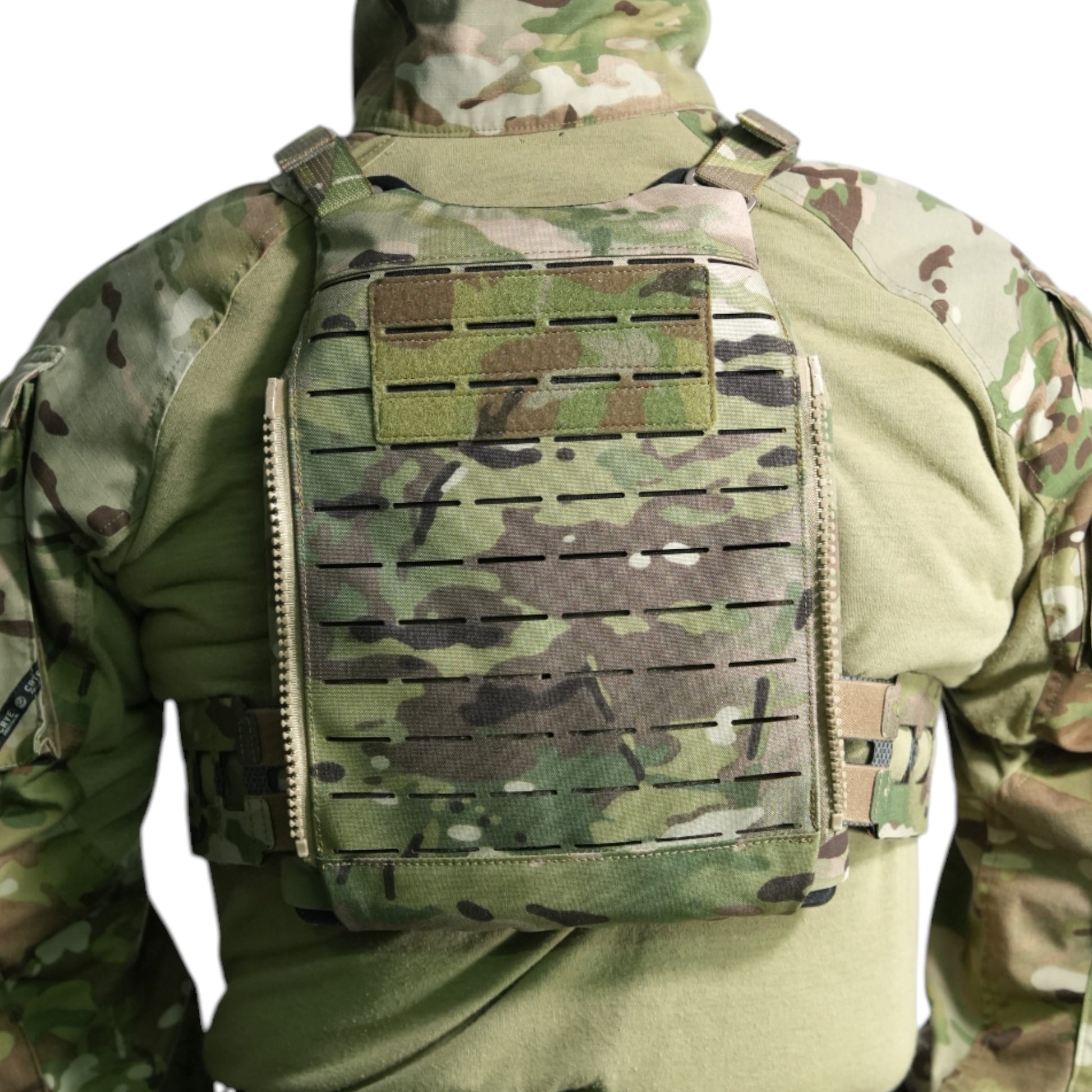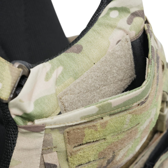 The rear side zippers follow CRYE specifications, making it compatible with our DPC zip-on back panels. The cummerbund is secured by tucking it into the rear flap and fastening it with Velcro. The 2R cummerbund is recommended for use with this model.