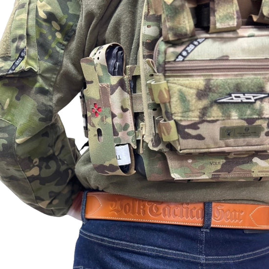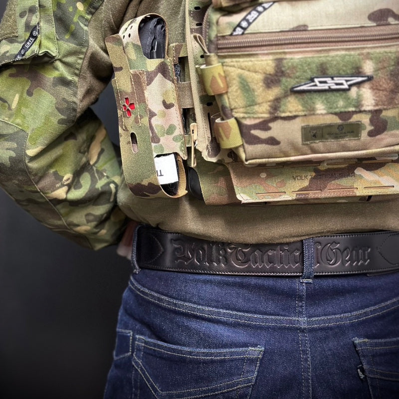 The edge of the belt and the part that comes to the side when worn are stitched with a special sewing machine. The rear part is stamped with VOLK TACTICAL GEAR by applying heat to the stamping die and applying high pressure.