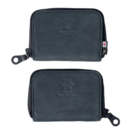 The main material of this product is nubuck leather (cowhide), which is a soft brushed leather that is soft to the touch, and the lining material is hard, crisp, and glossy black cowhide (Tochigi leather), making it an authentic all-leather specification. This is a coin case. The colors are rare navy and sand, with the VTG logo embossed on the front and the CAMURO logo on the back.