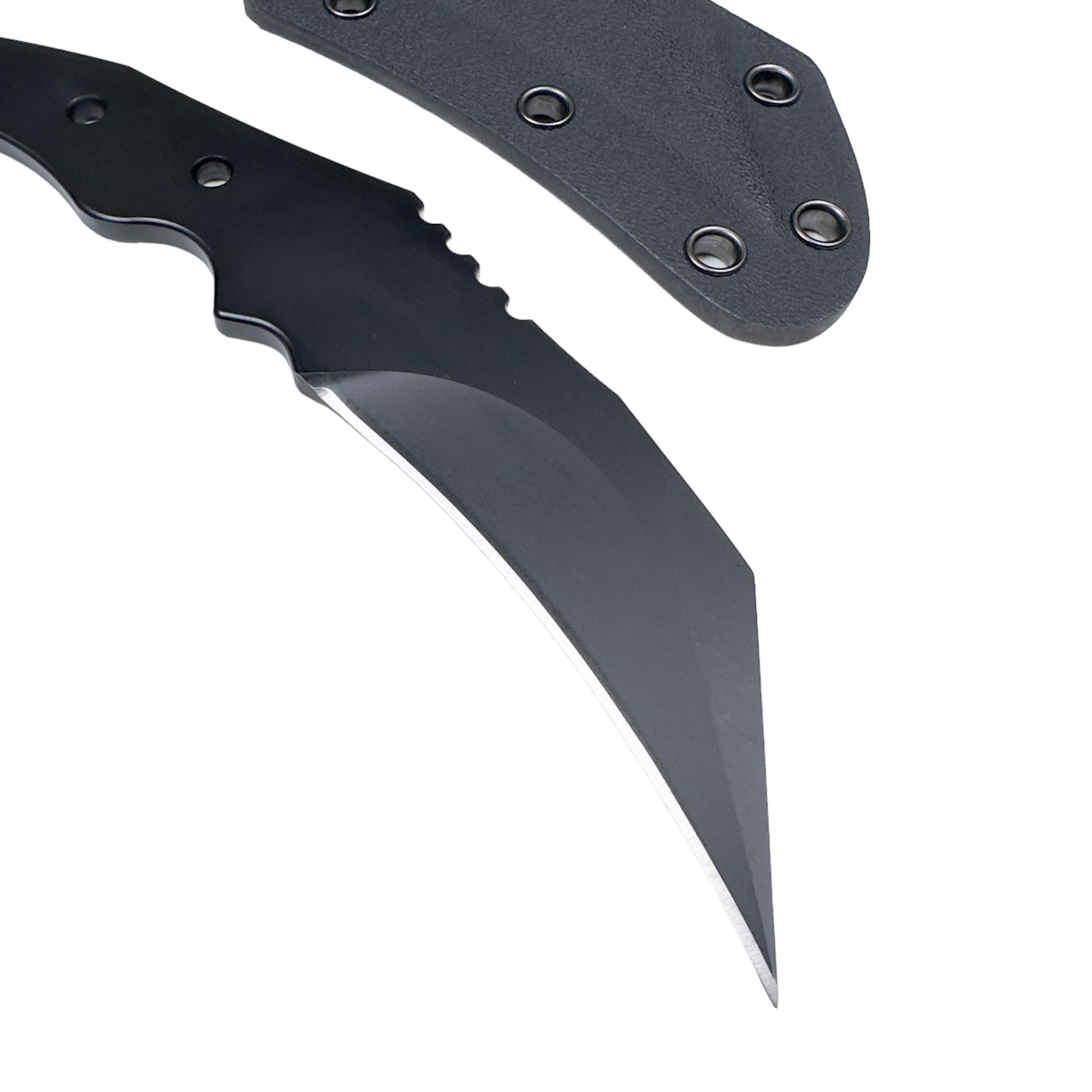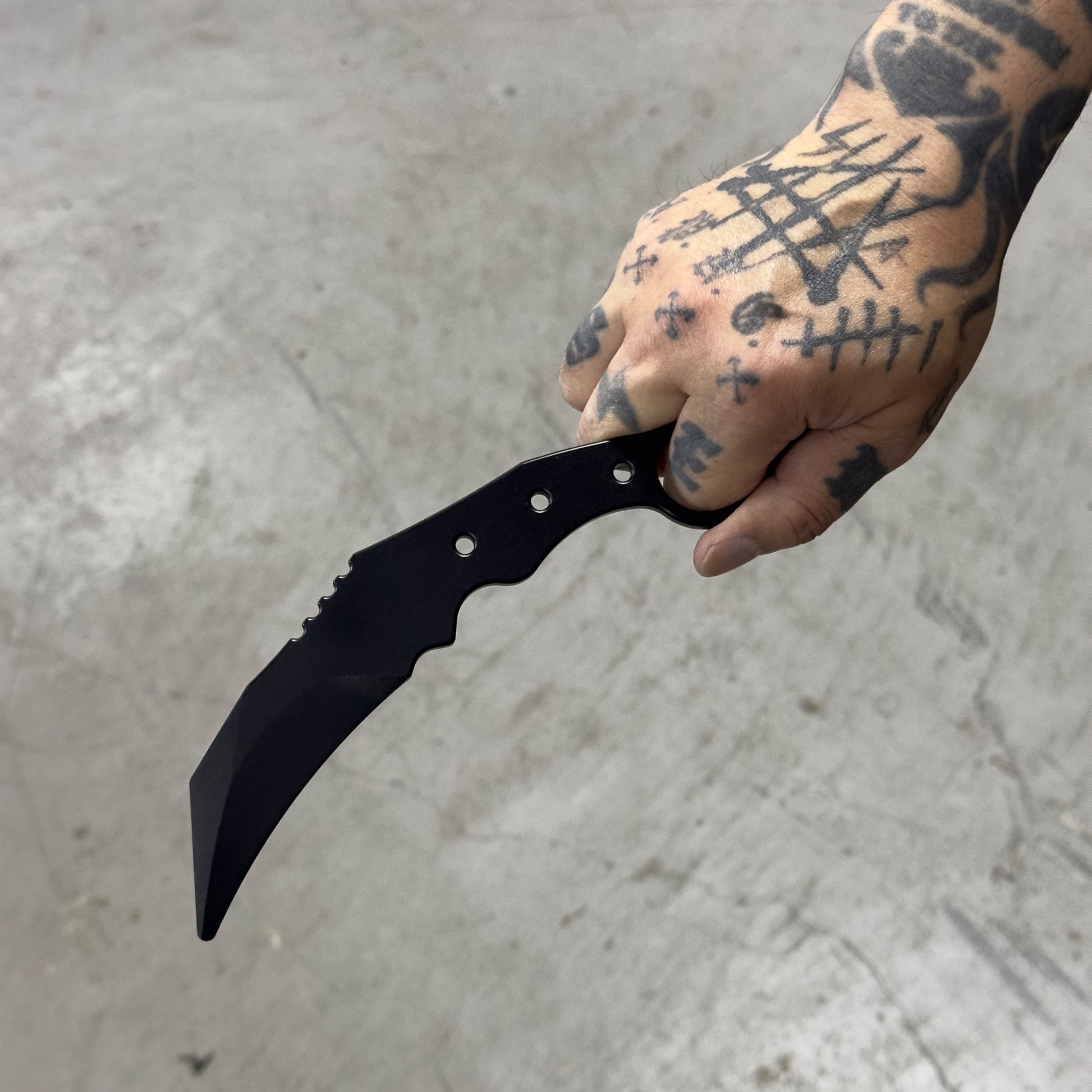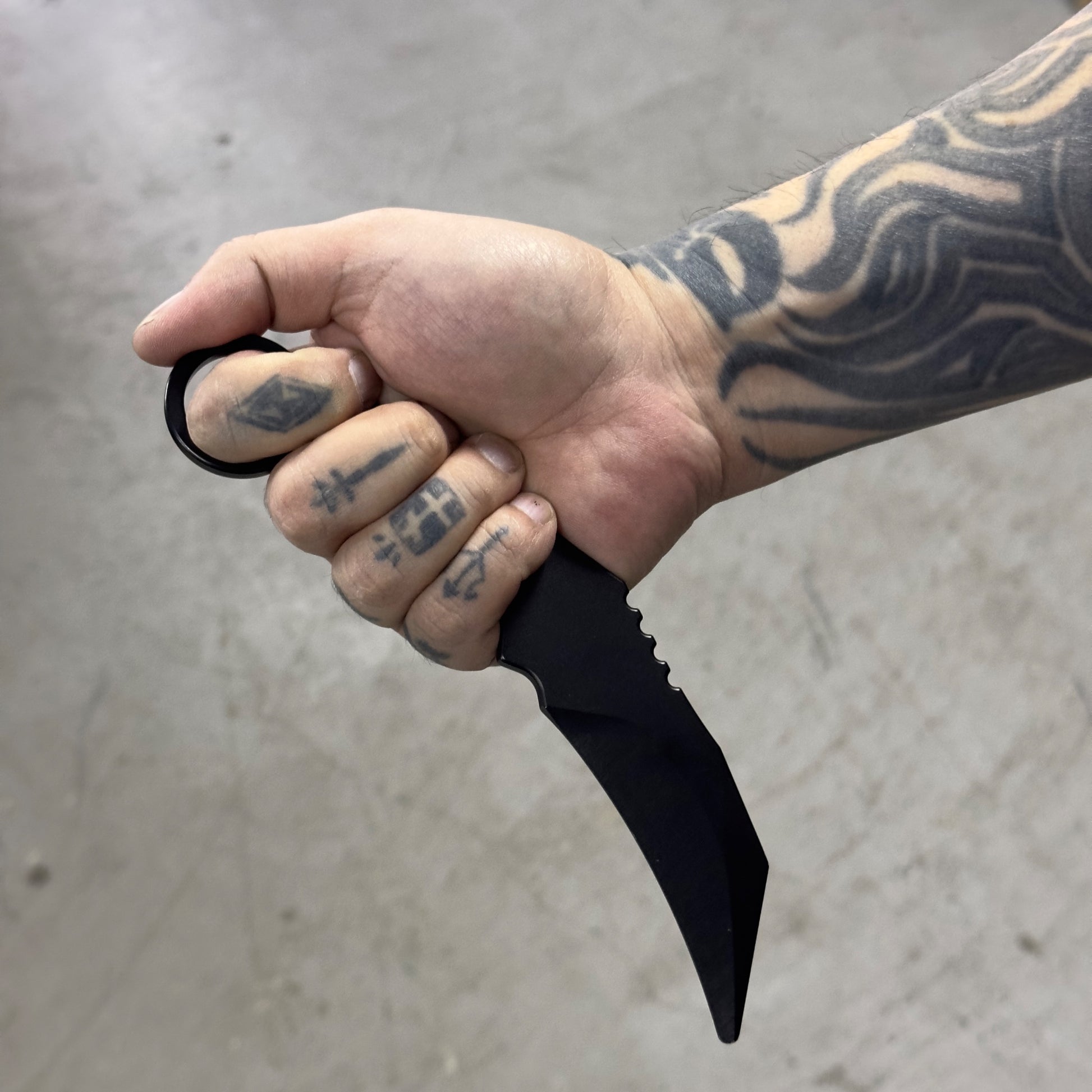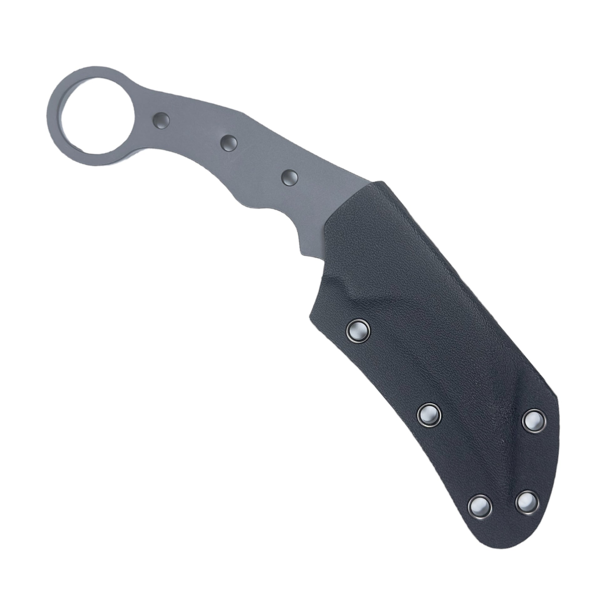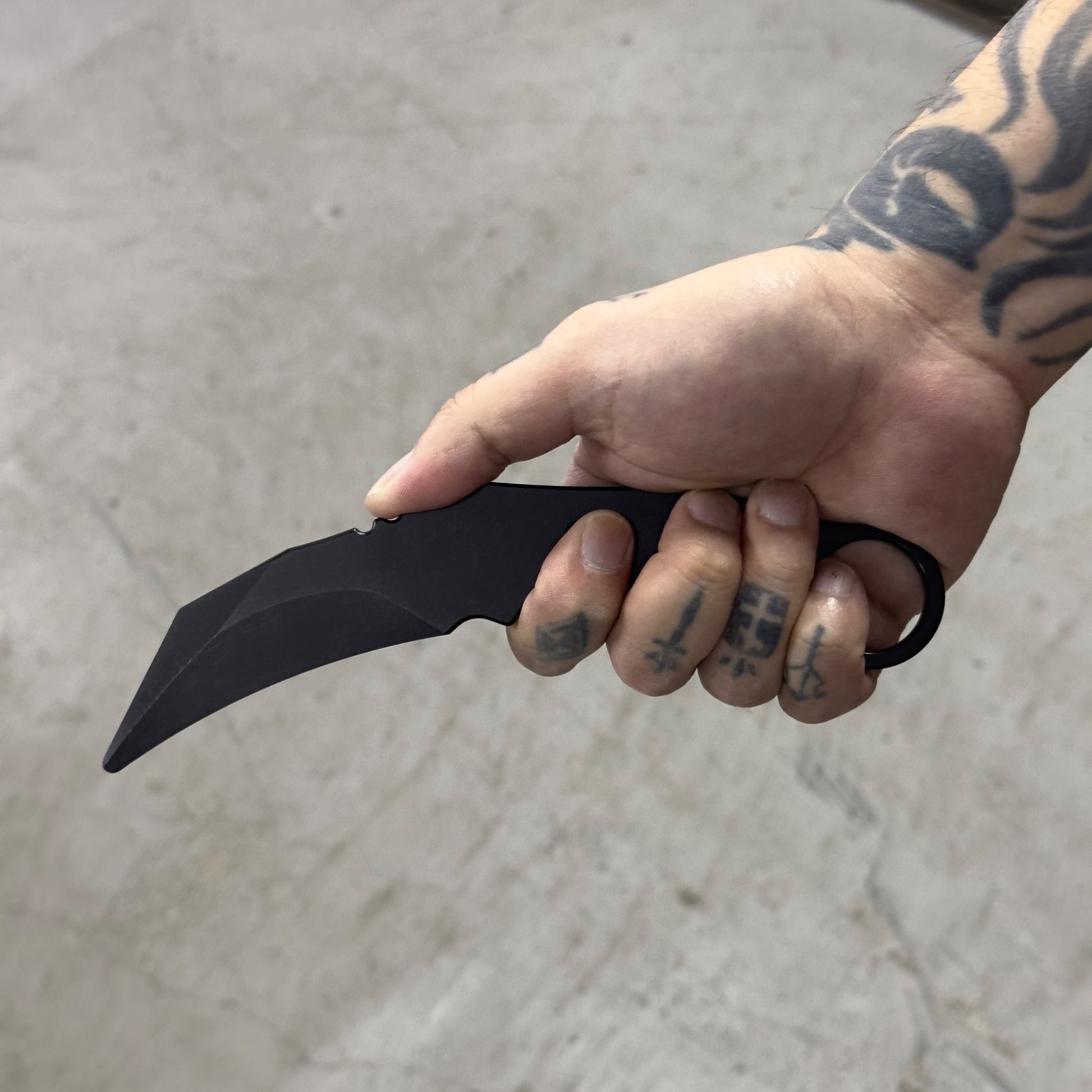 The radius is shallower than existing karambits, and the uneven design of the grip means it fits comfortably in your hand whether you use it with your hand over or under.