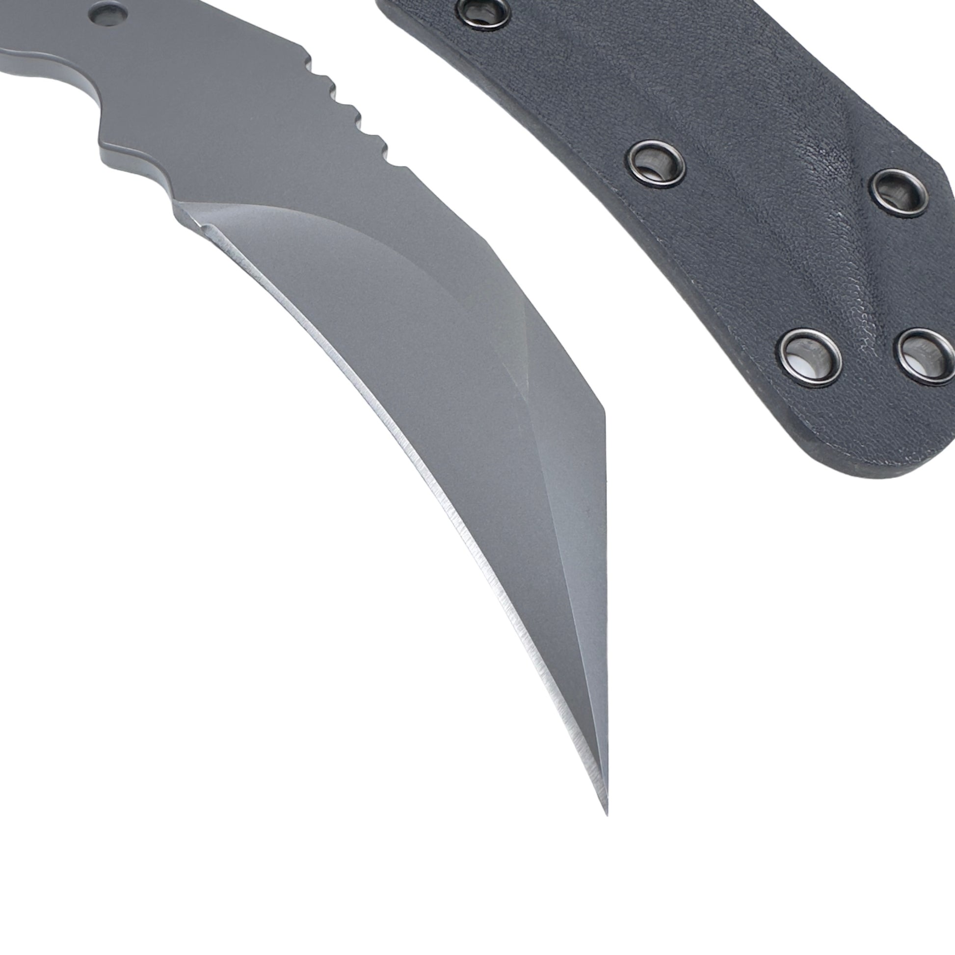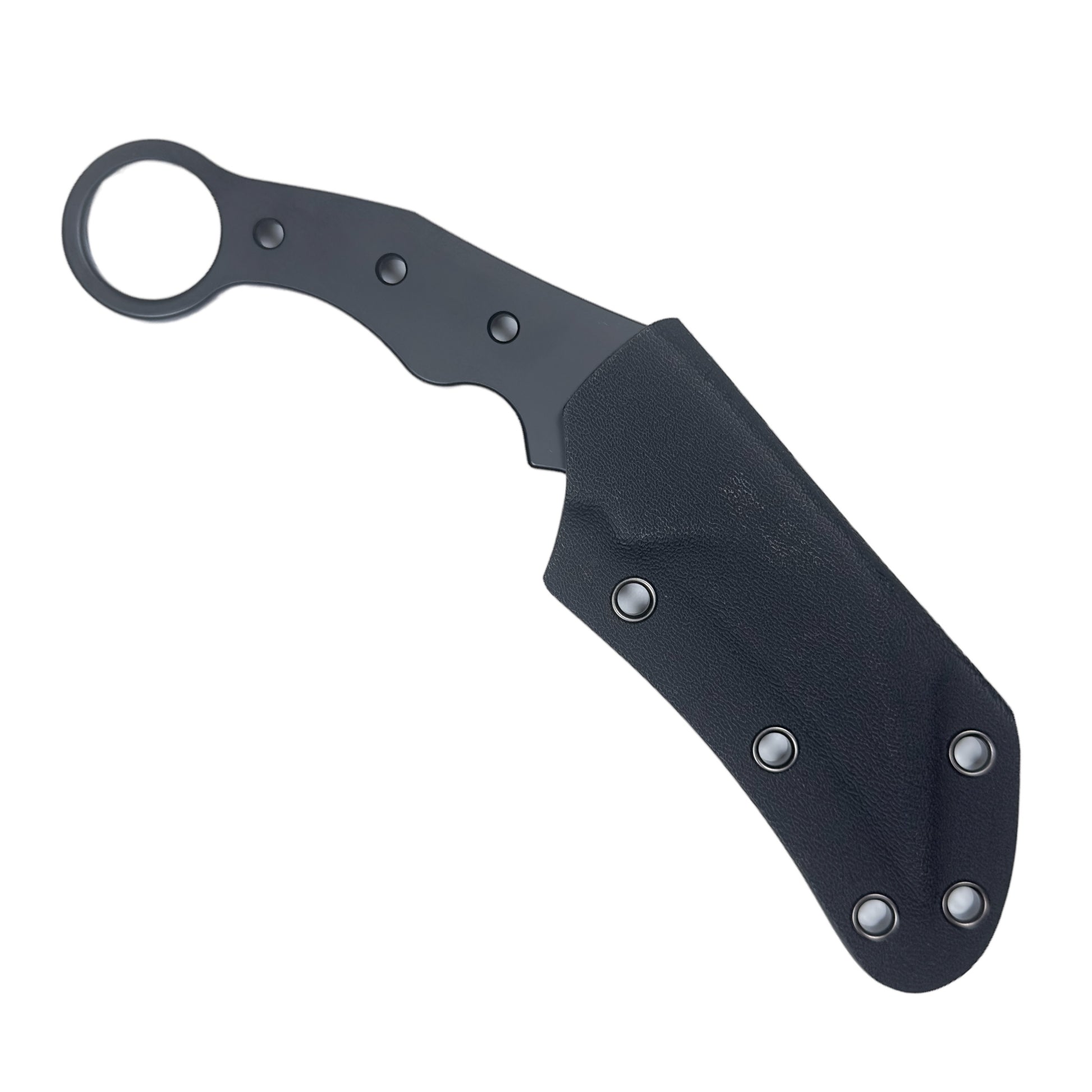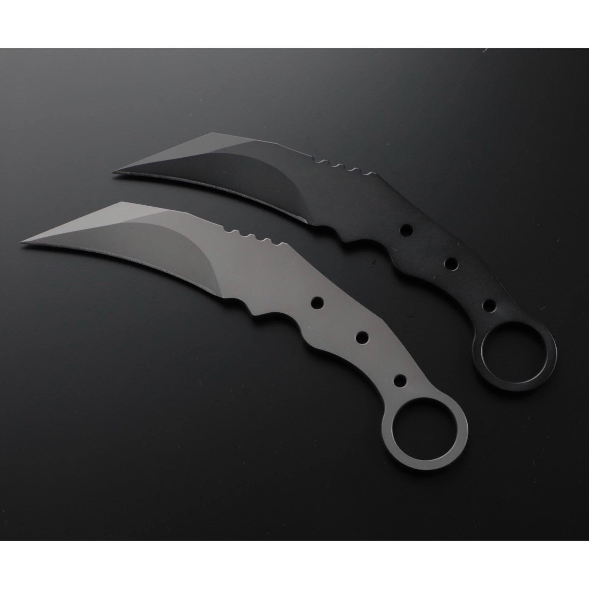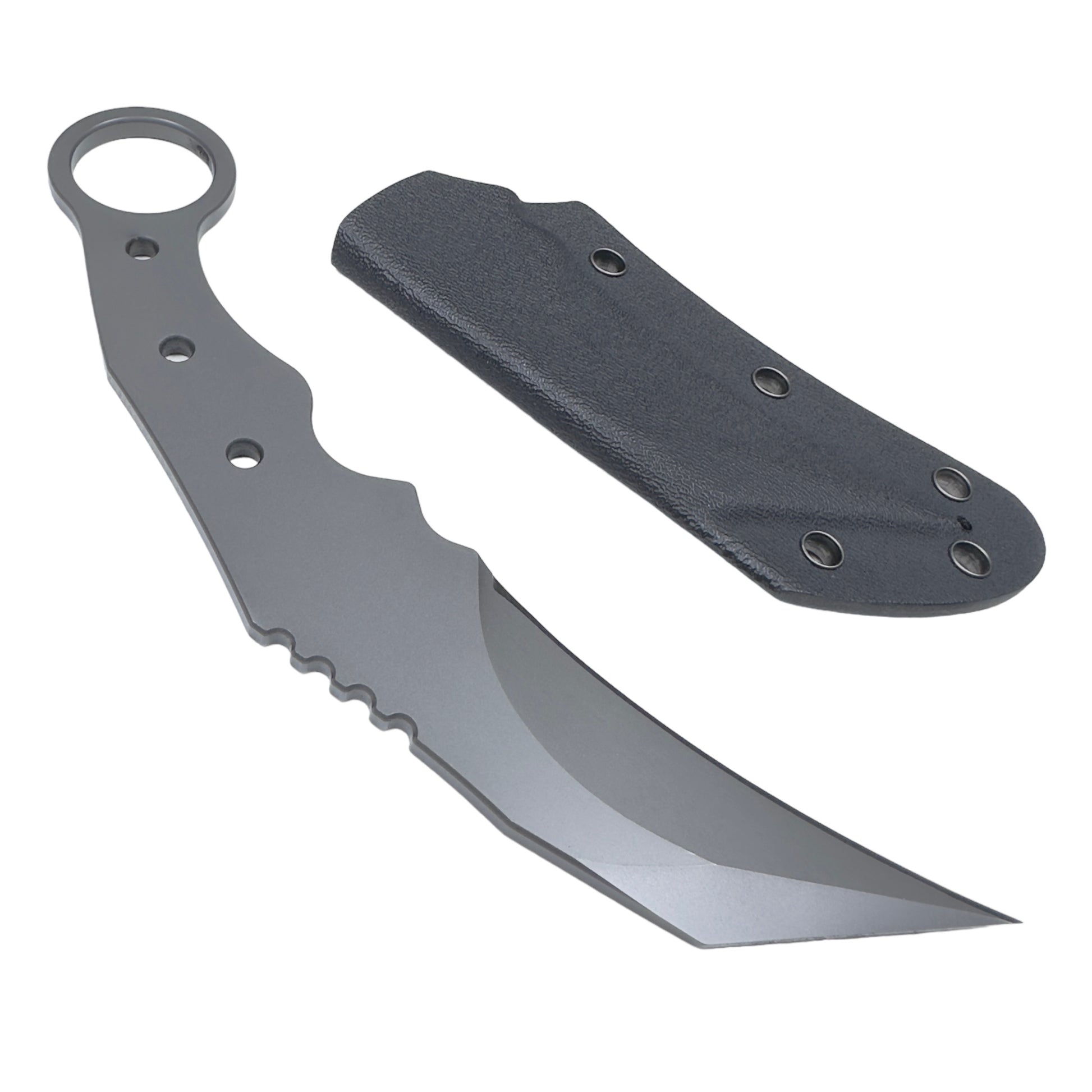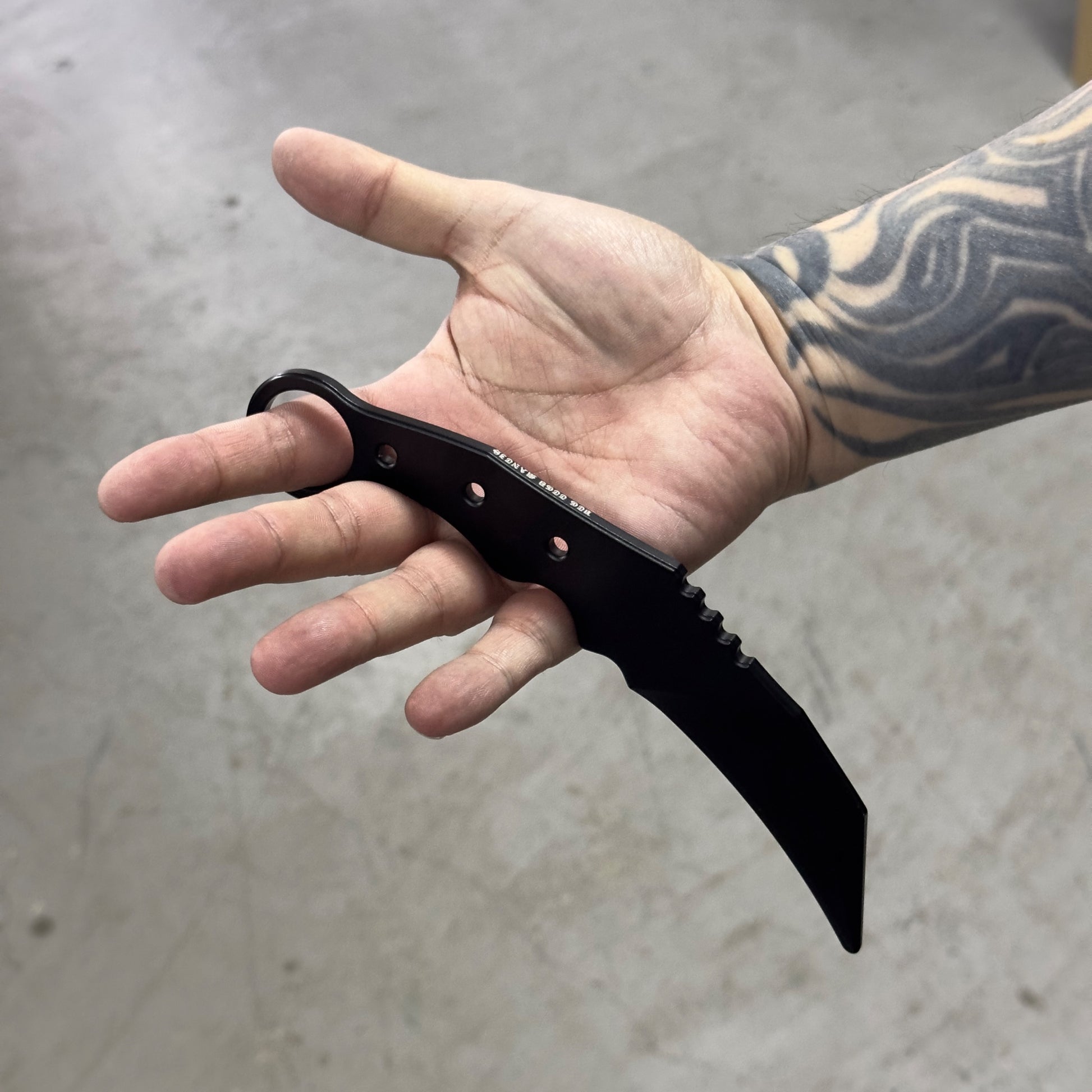 The radius is shallower than existing karambits, and the uneven design of the grip means it fits comfortably in your hand whether you use it with your hand over or under.