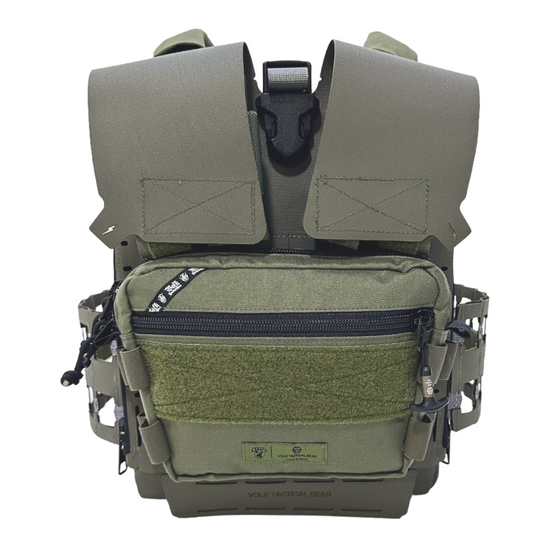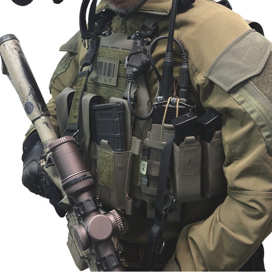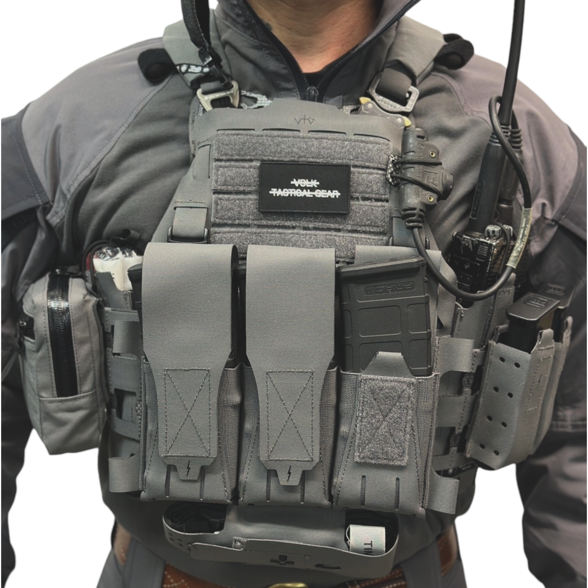 Equipped with two angled flashbang pouches on the left and right for easy access by the follower.