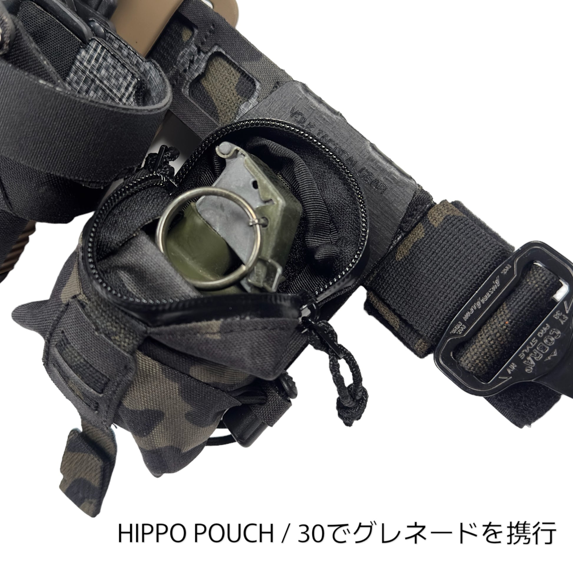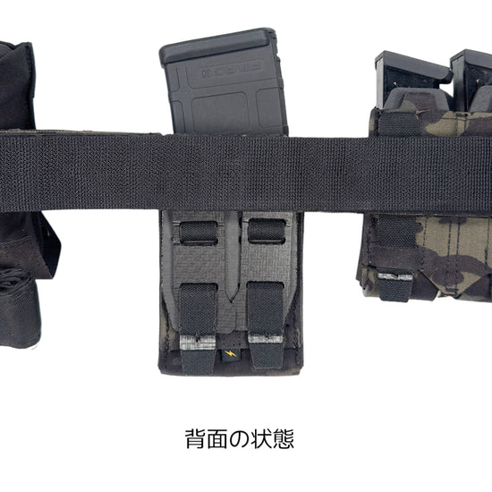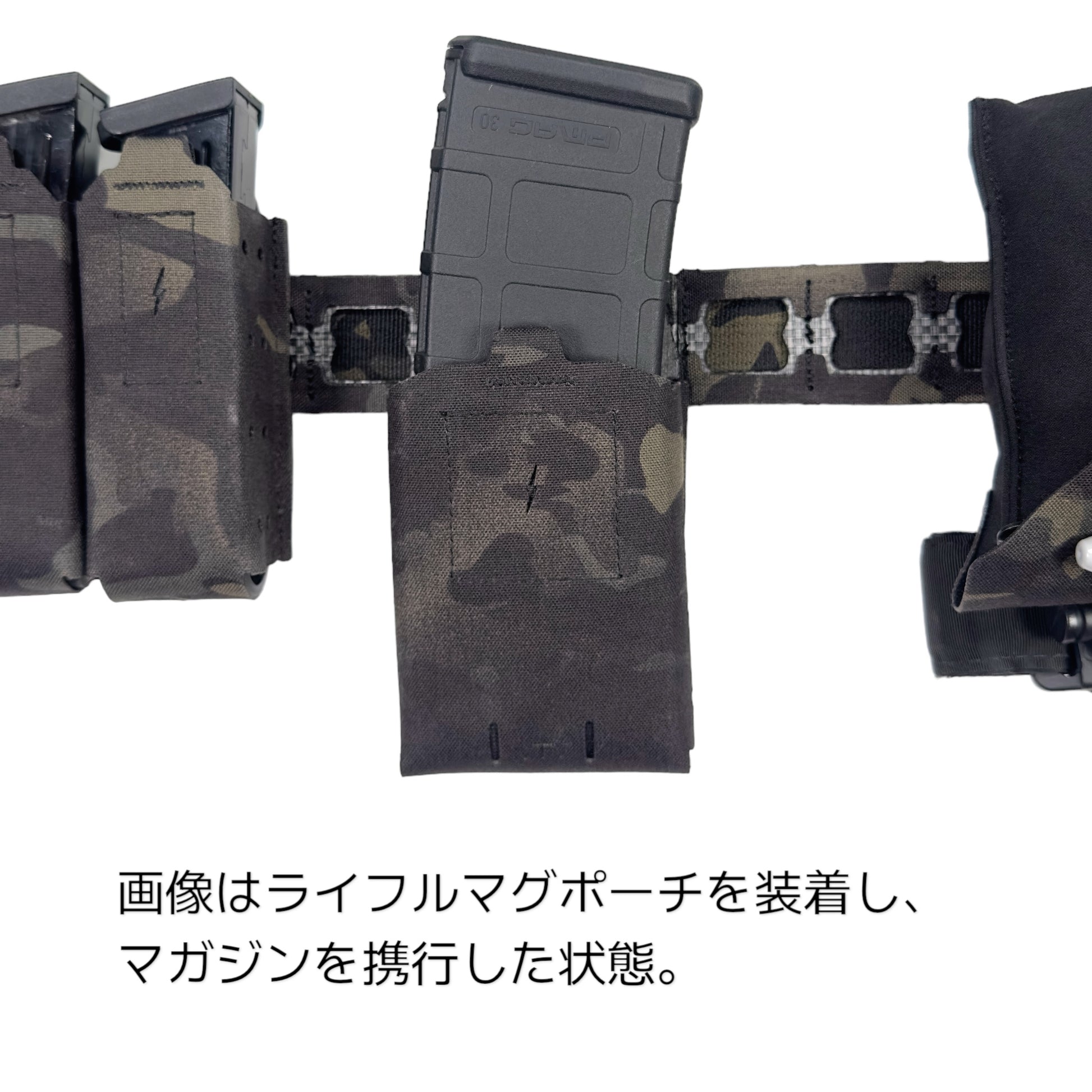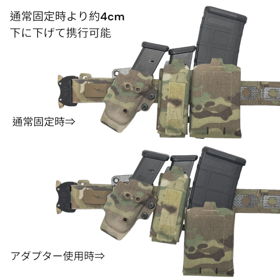 弊社ブリッツタックベルトに1.57” DROP DOWN ADAPTERを介してライフルマグポーチを装着した場合、通常固定時より約4cm下でポーチを携行する事が出来ます。