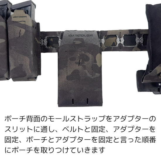 アダプターをモールに通して中心部分から折り曲げて、装着するポーチのモールストラップをアダプターとモール、ポーチがしっかり固定される様に交互に通してポーチを固定します。