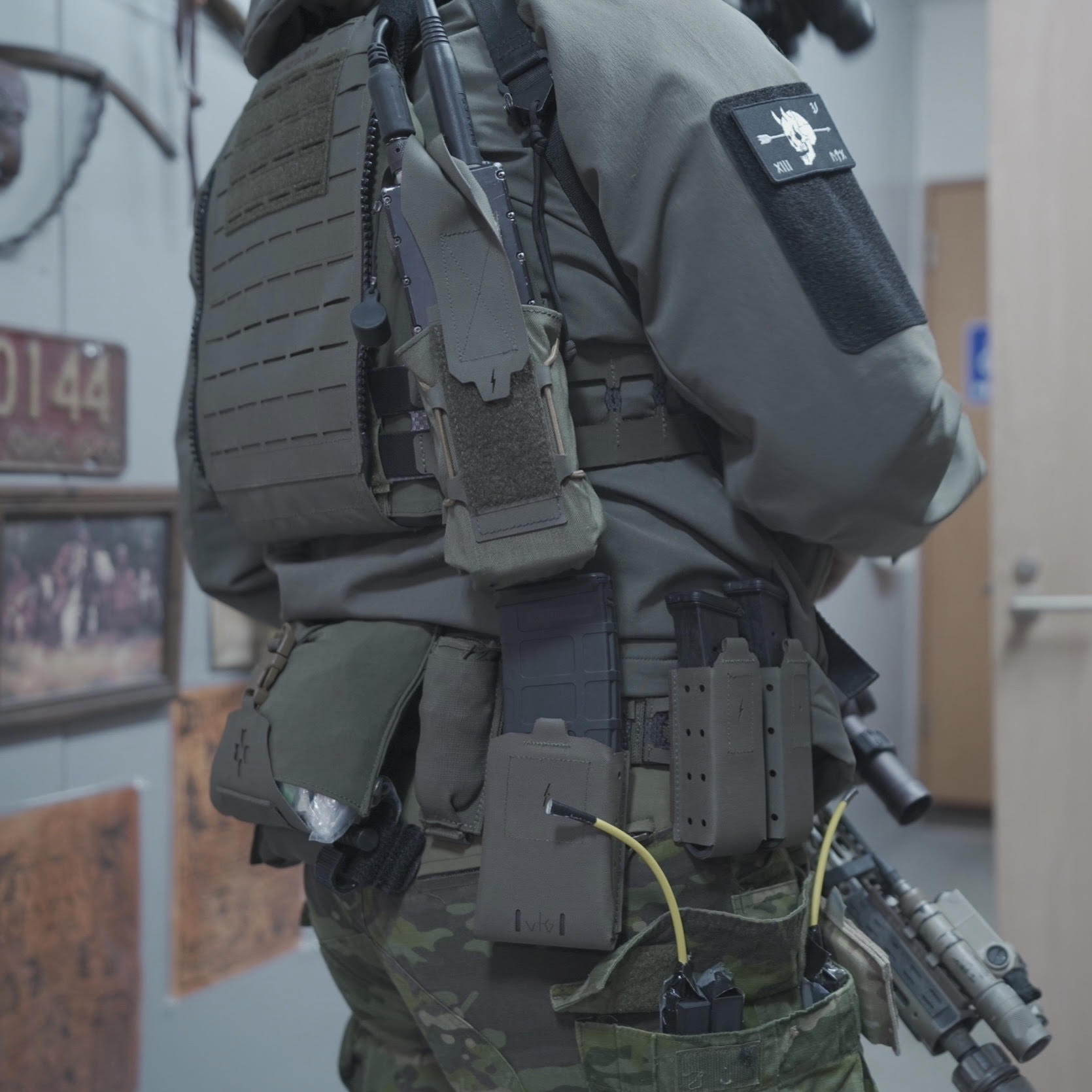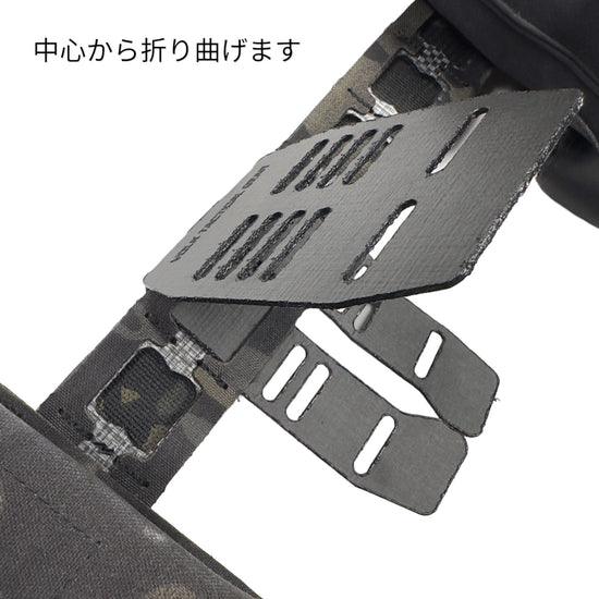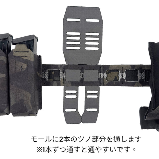 主にタクティカルベルトに装着したマガジンがプレキャリ、チェストリグ装備と干渉しない様にマグポーチの装着位置を約4cm下に下げる為に開発しCURV®製のアダプター。