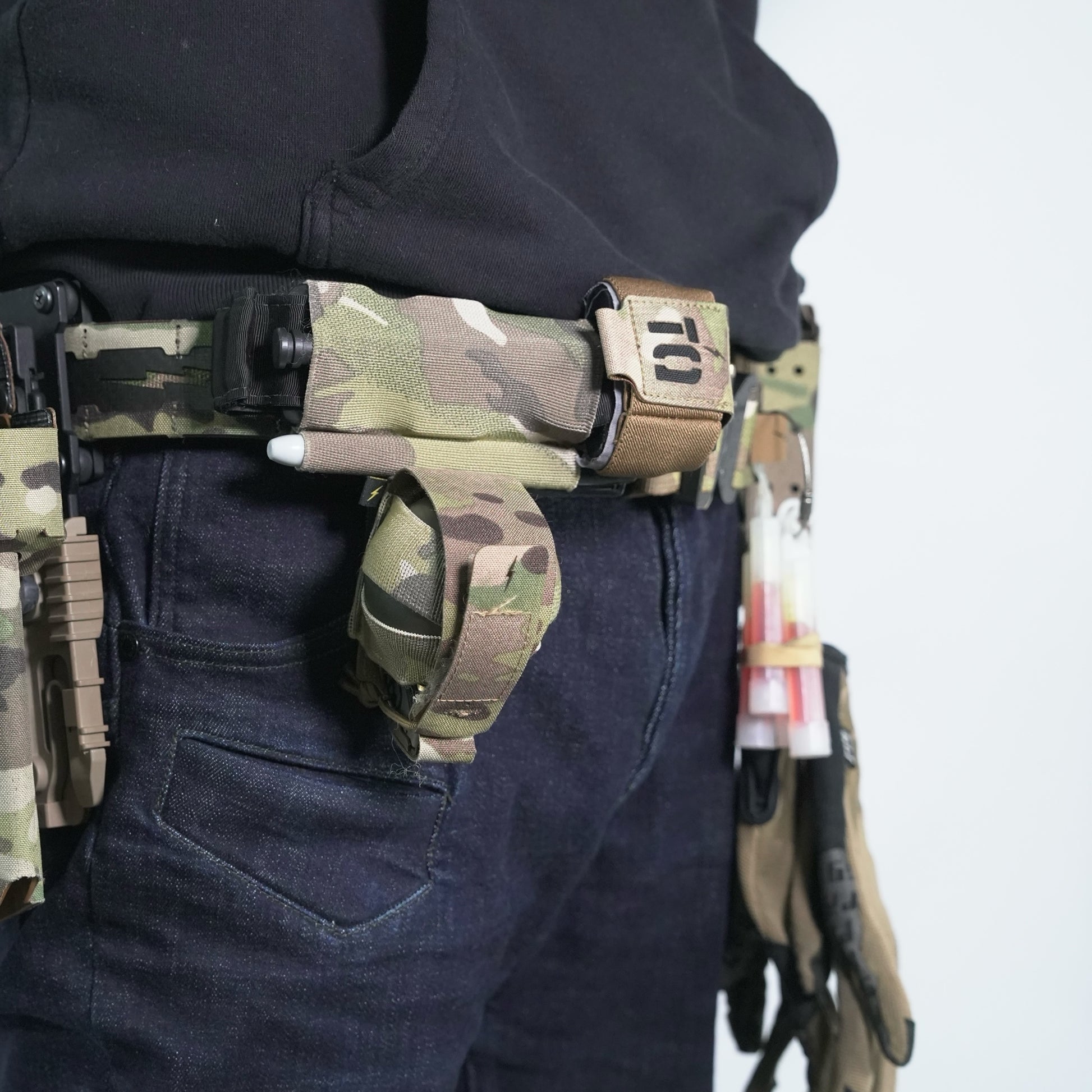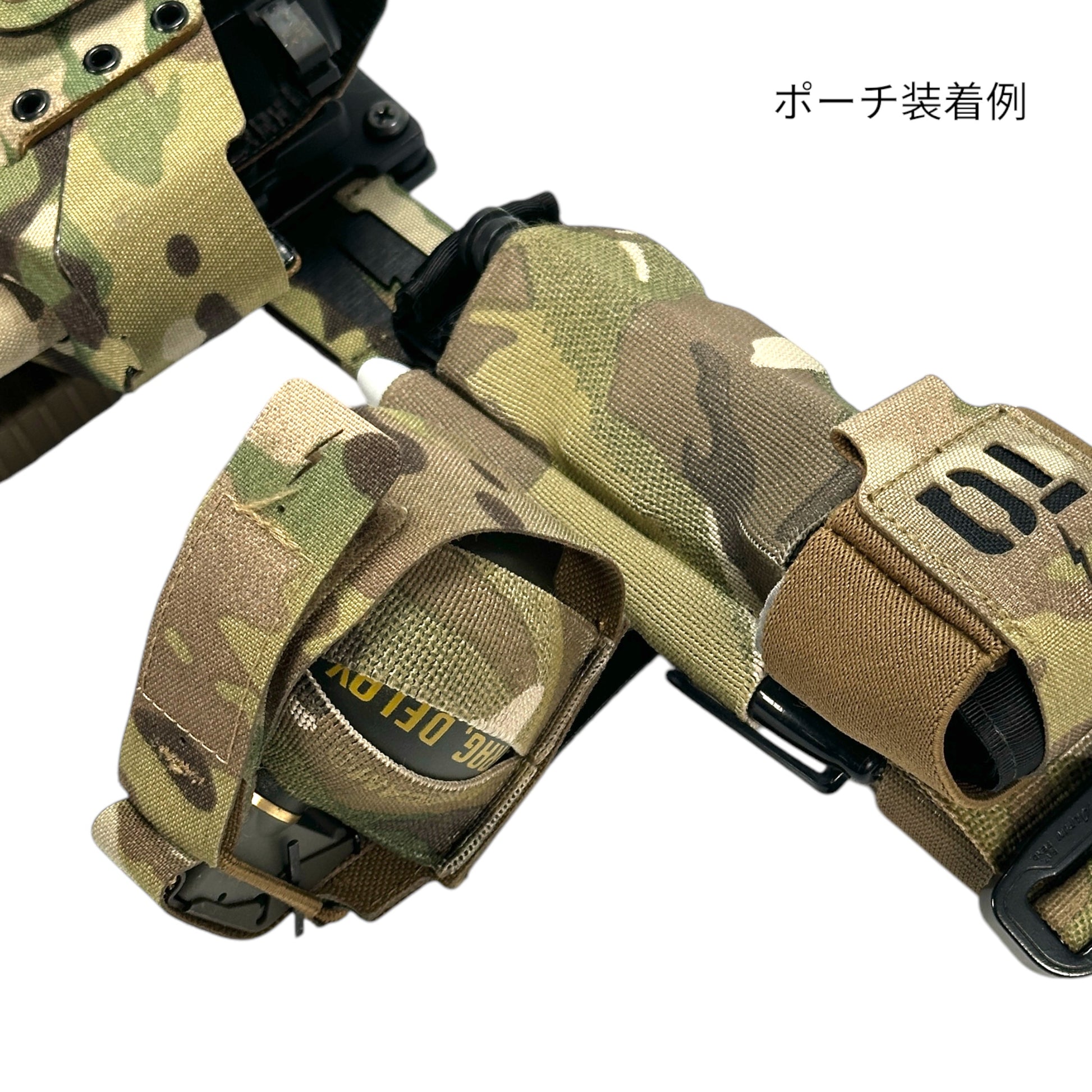 グレネードポーチやフラッシュバンポーチ、ピストルマグポーチ等を4cm程下げて携行できる他、画像の様にFAST 2WAY TOURNIQUETの下にポーチを携行する事も可能。