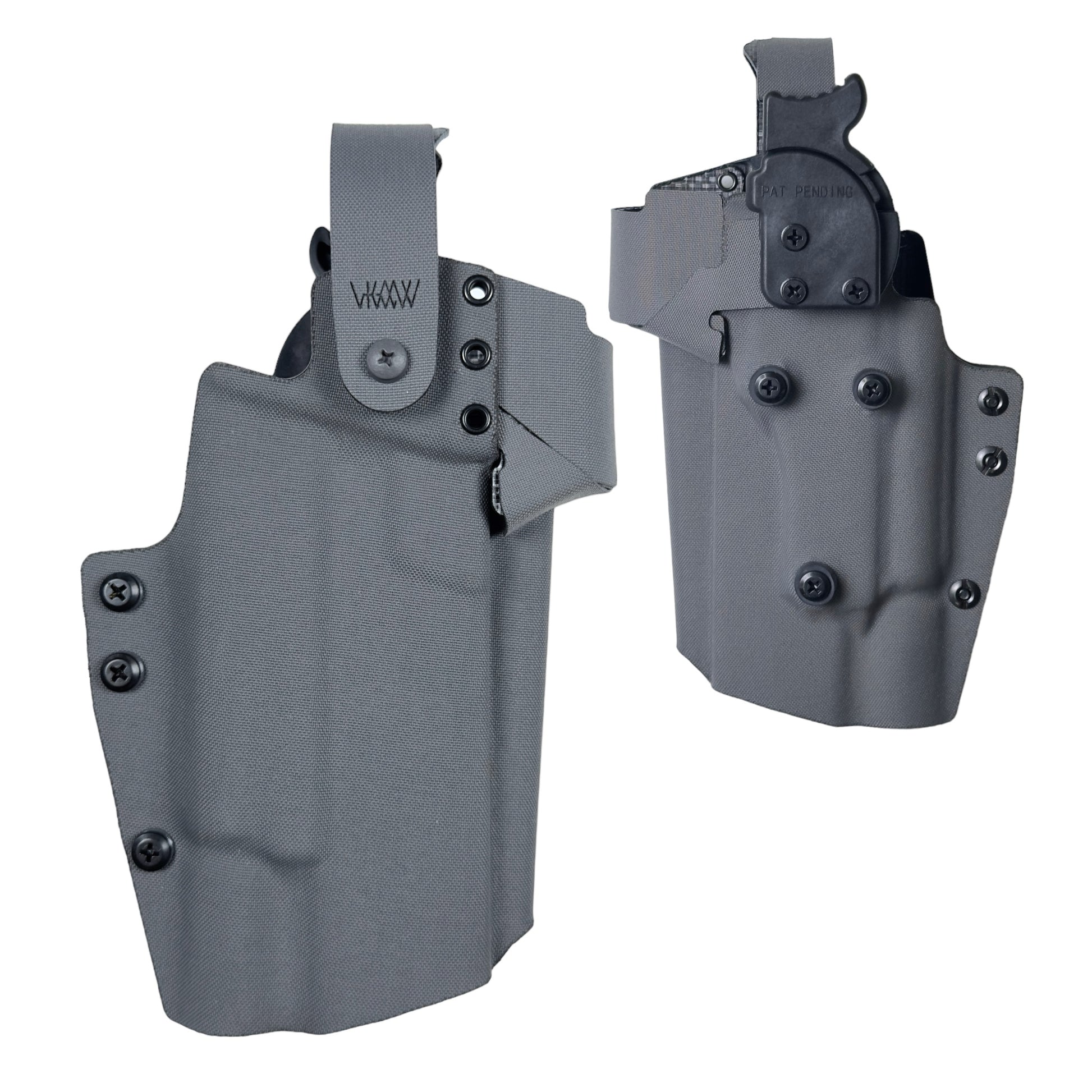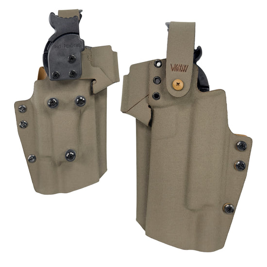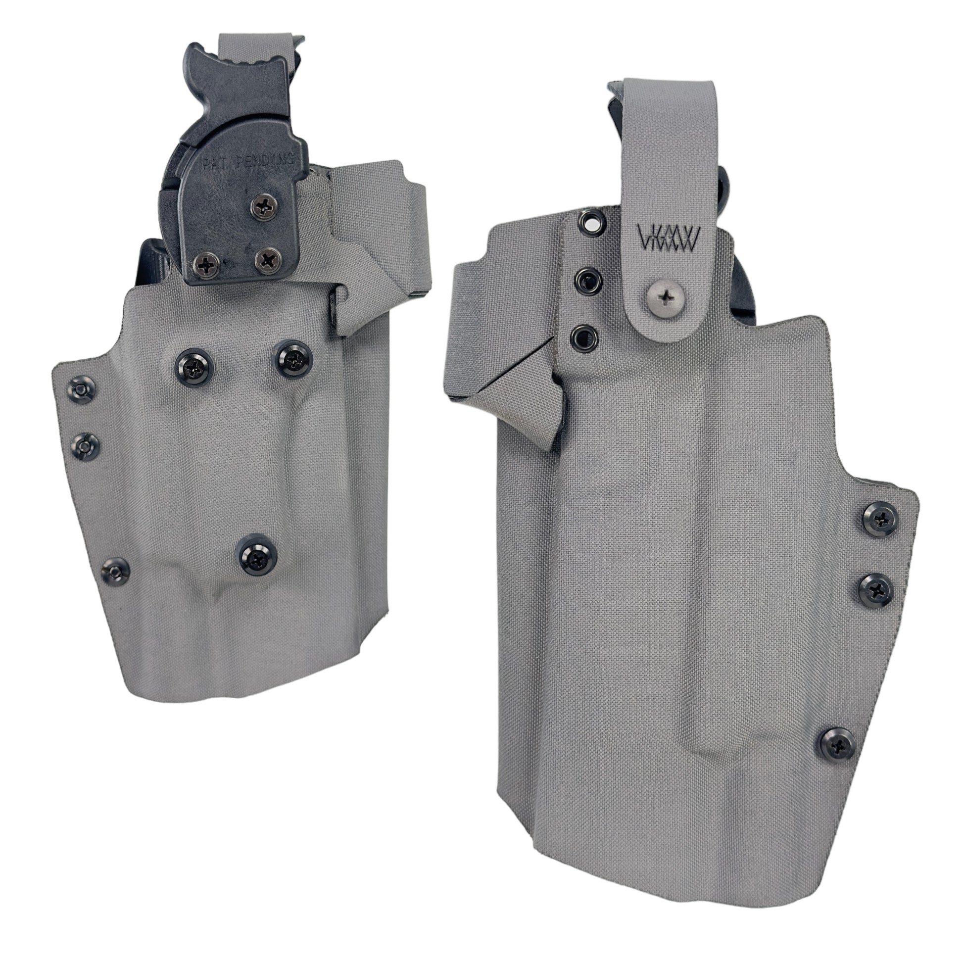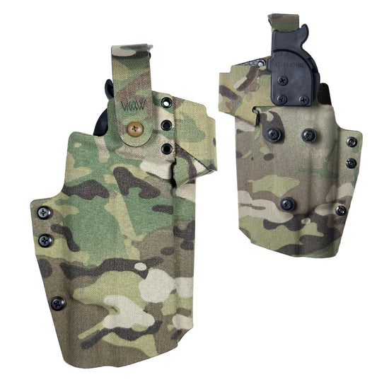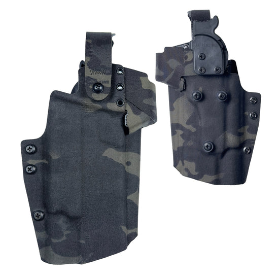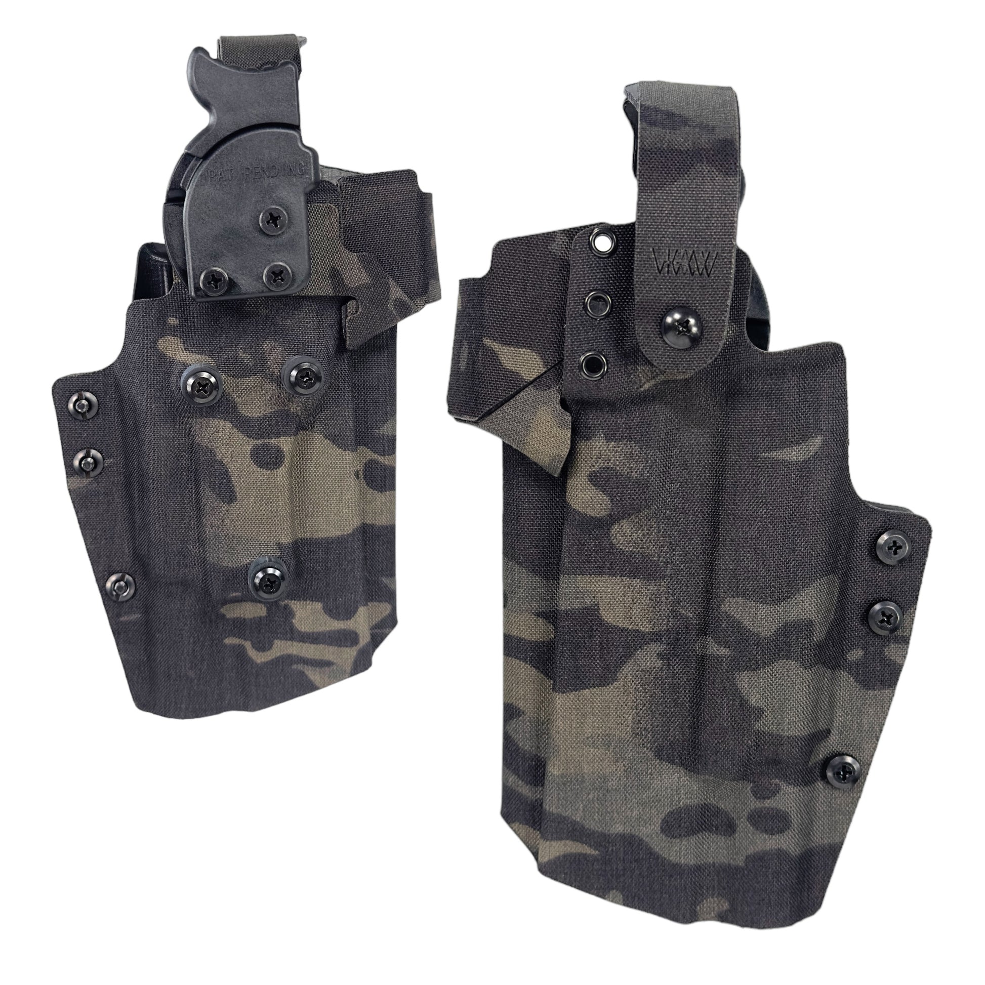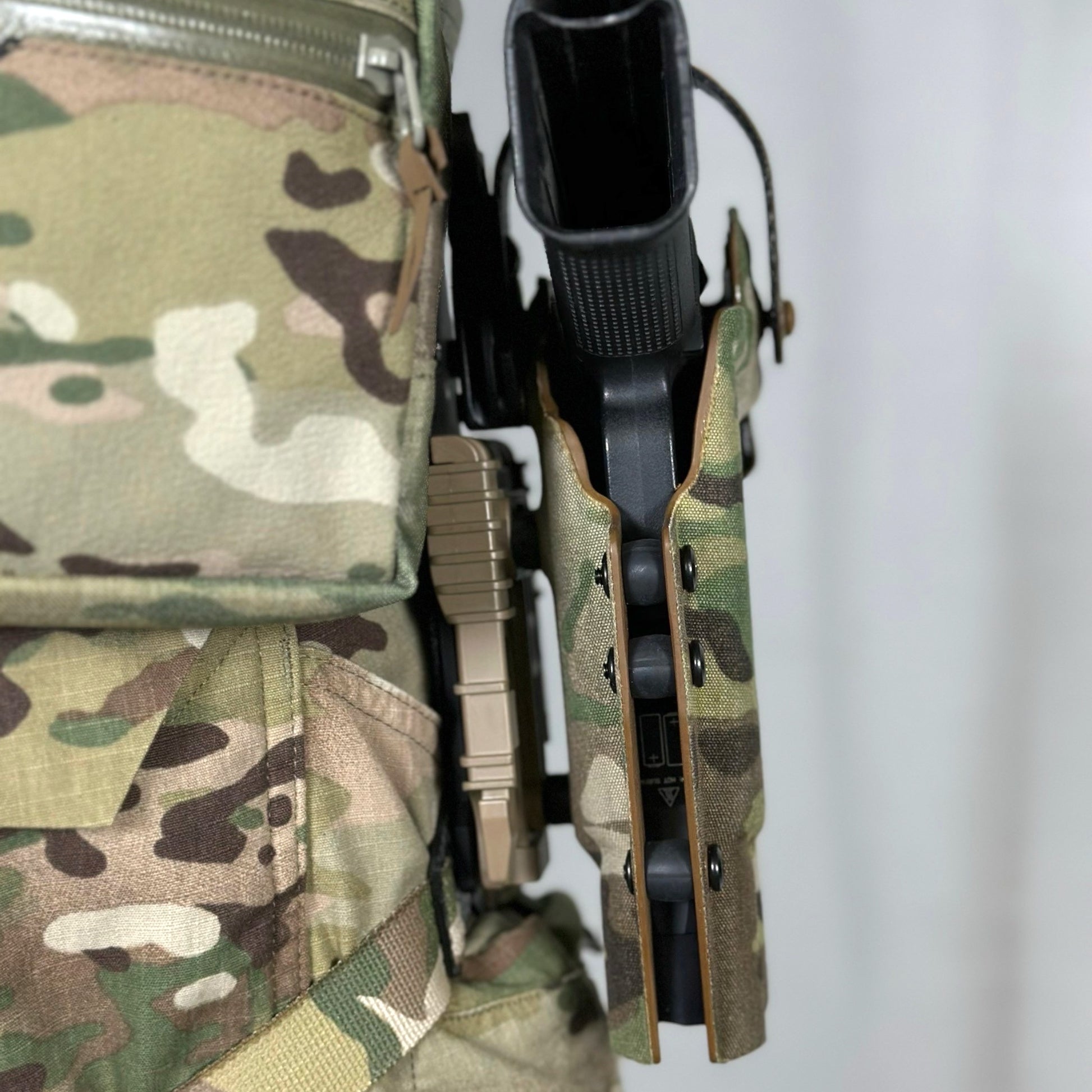 近年需要が高まってきたウエポンライトとdotsightを搭載された銃の為に設計した同ホルスターは、カイデックスで形成したホルスターに対IR加工を施した500Dコーデュラナイロン(2型迷彩は1000デニール)でラッピングしています。これによりホルスターの耐久性、摩耗性の向上と迷彩効果。そして接触時の音を小さくする効果をもたらします。