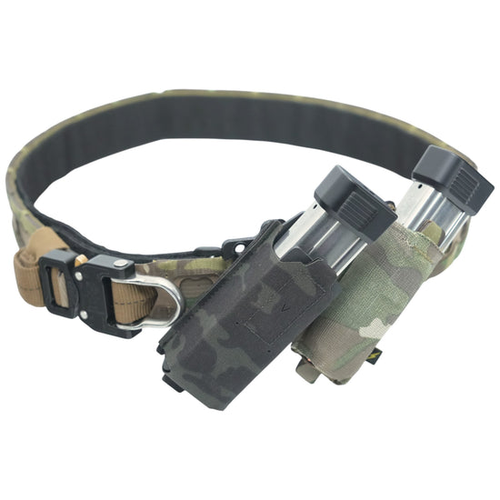 ポーチの取り付け角度を45度にオフセットすることで、正面に配置したシングルピストルマグポーチなどを、射手にとってより自然で素早く抜きやすい位置へと導きます。