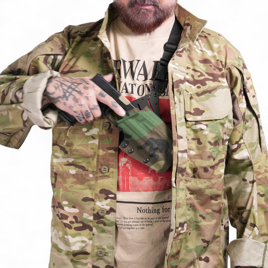 また、着用する位置を調整することでショルダーホルスターのような位置にマウントして使うことも可能です。