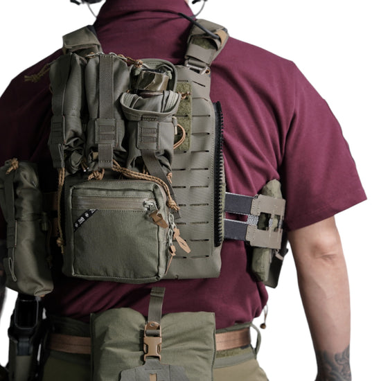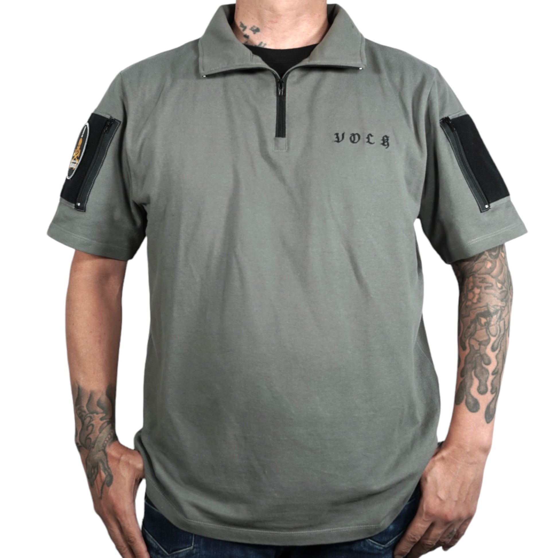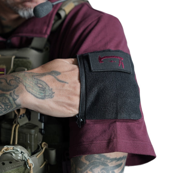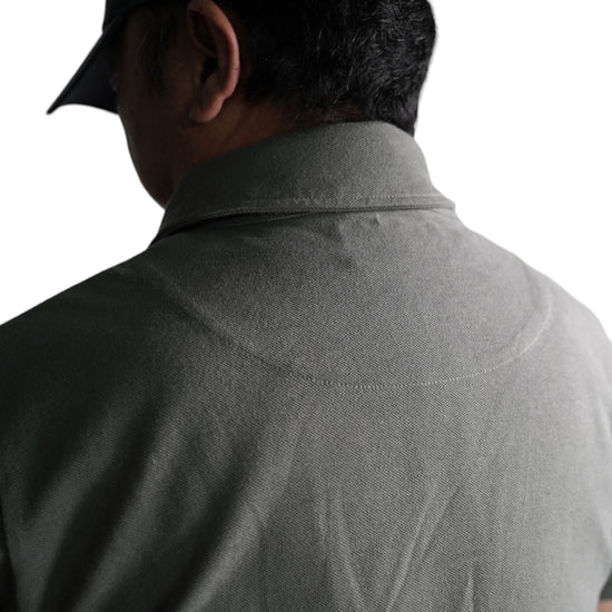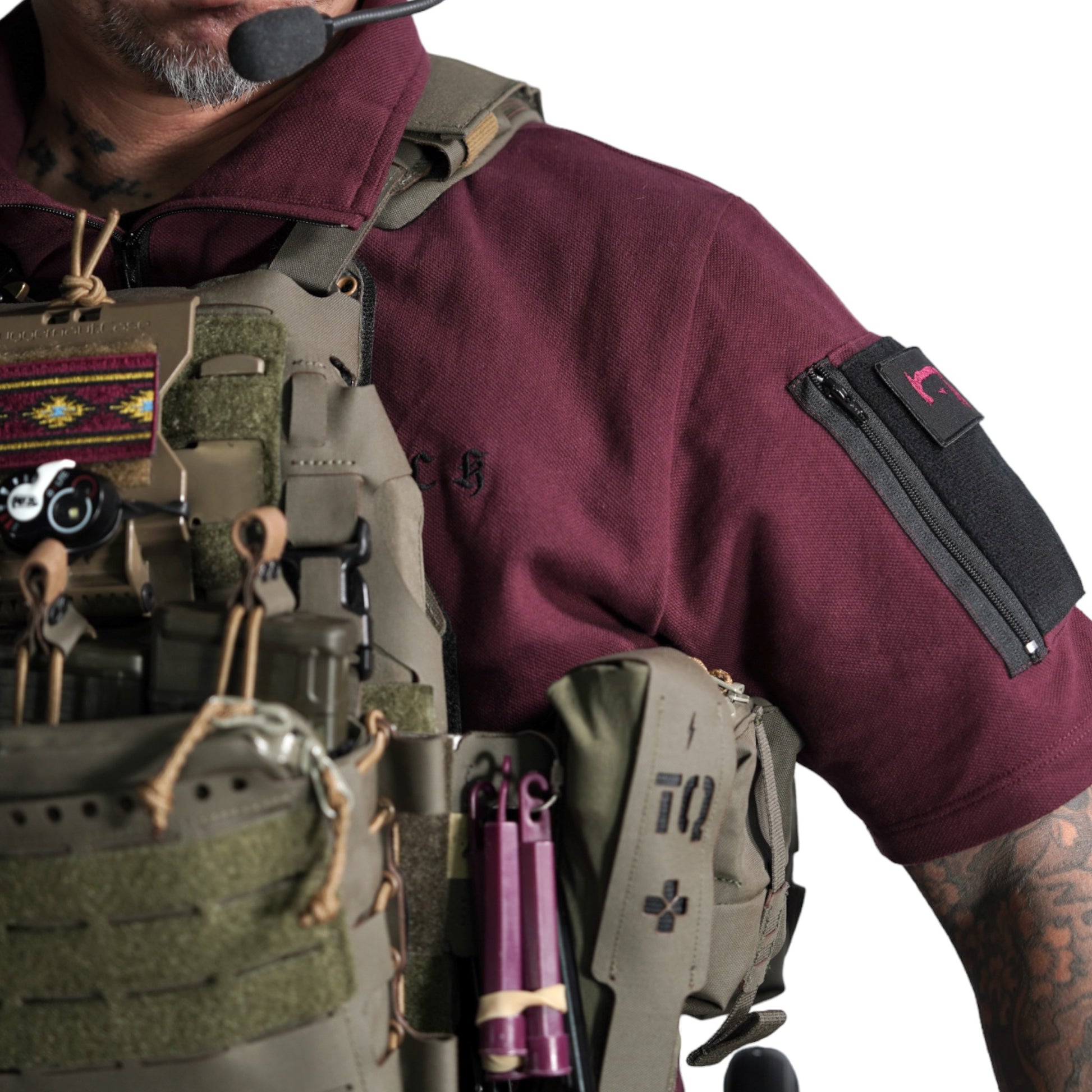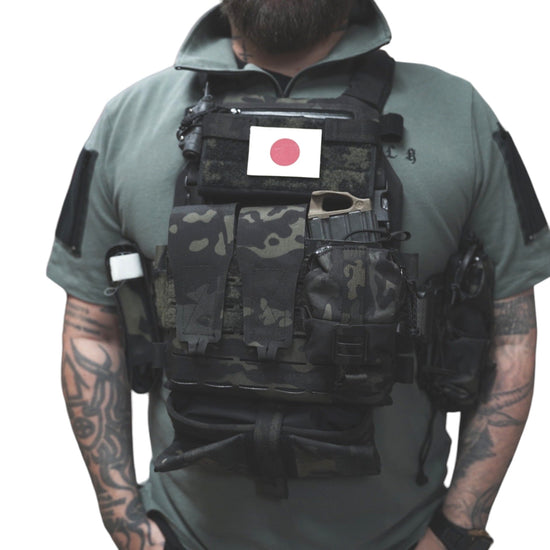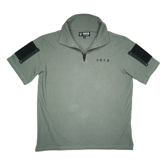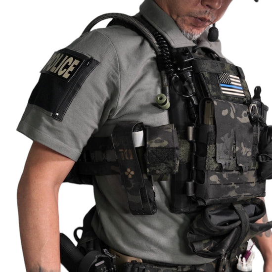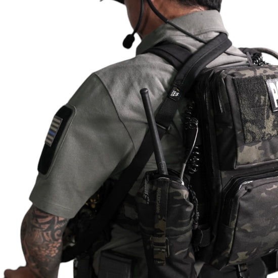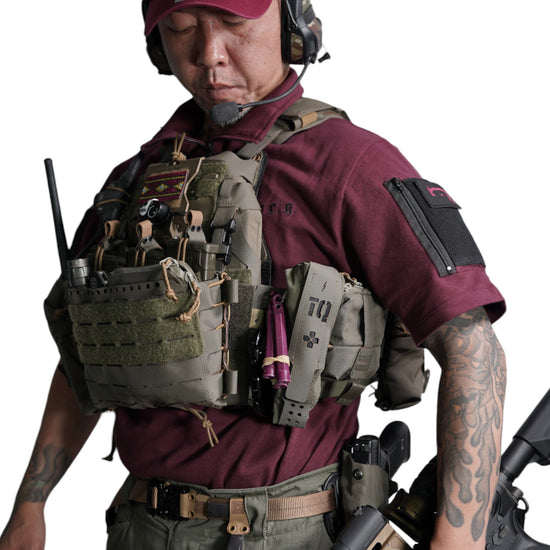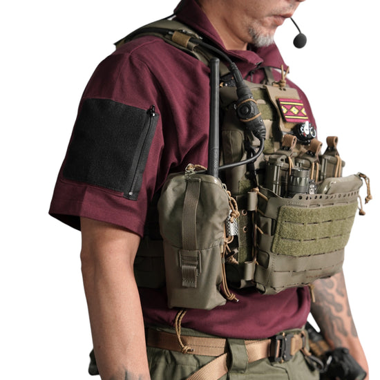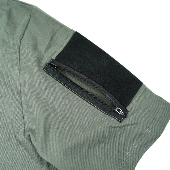 襟は首元にスリングが干渉しないハーフジップスタンドカラー。首元背面部と襟部分は負荷を想定して生地を2重にしています。また、装備装着時にジップ部分が人体に干渉するストレスを軽減する為に可能な限り小さなジッパーを採用、ジッパー内側はファスナーがむき出しにならない様に補強生地を縫製。ジップ全開時にはジップトップが収まる様に細かな配慮も施しています。