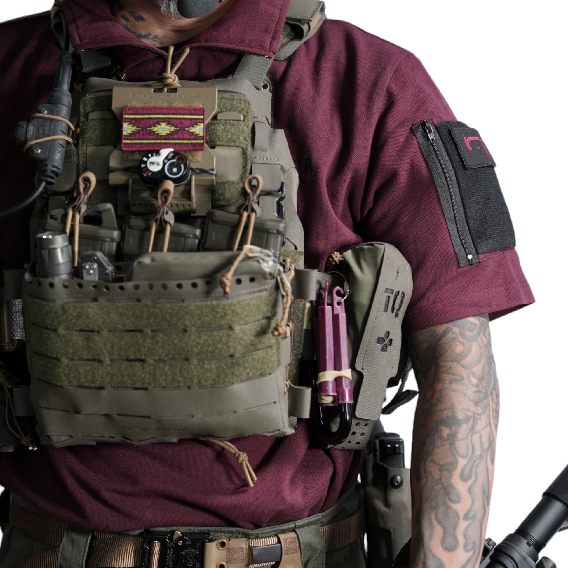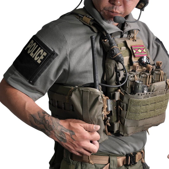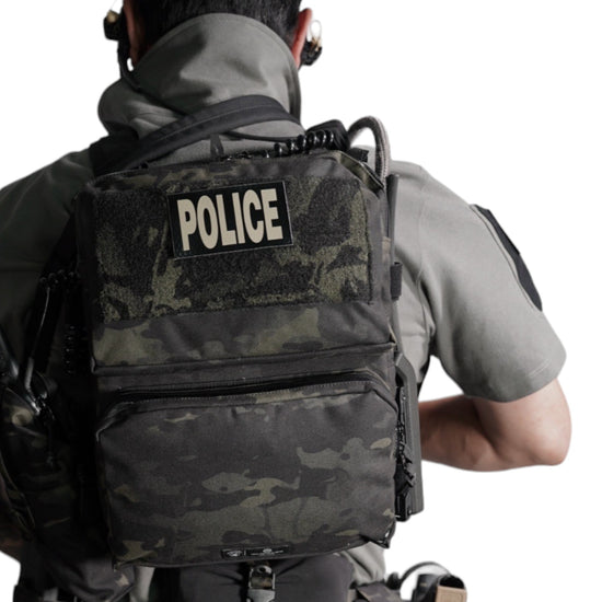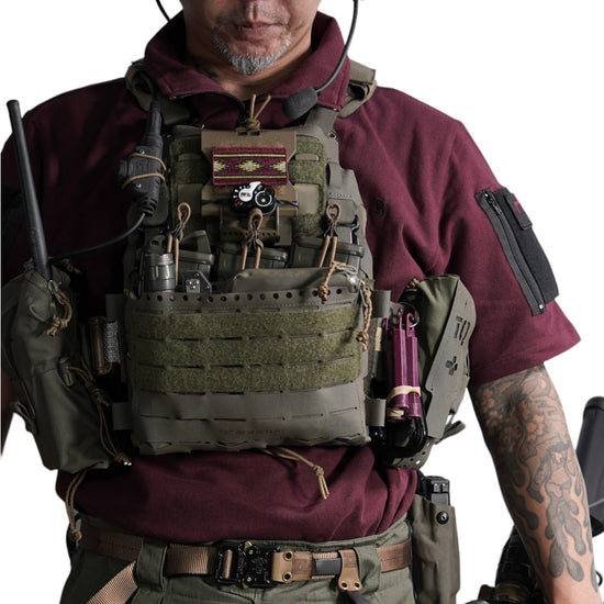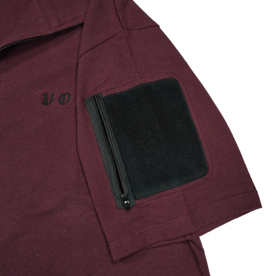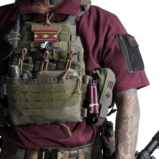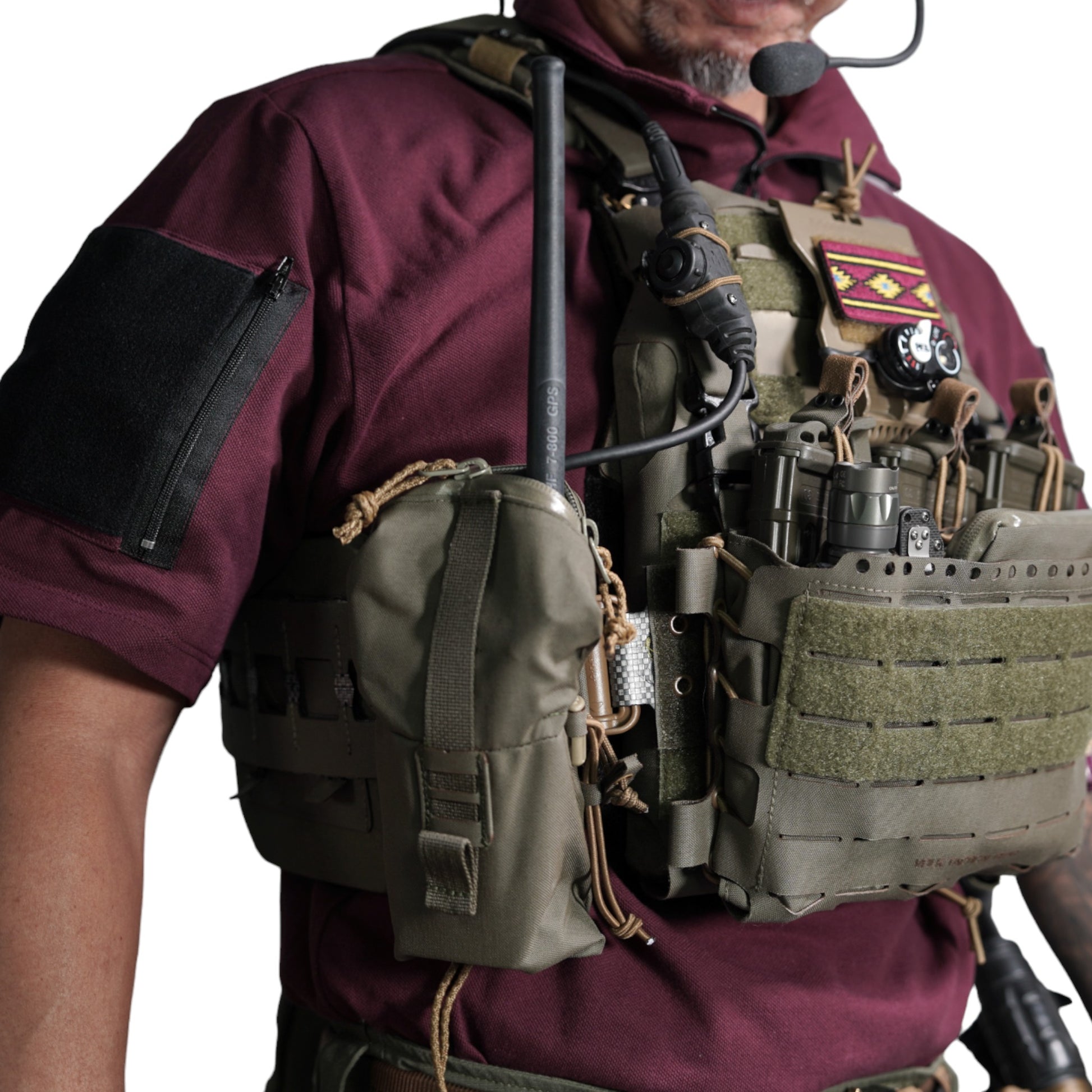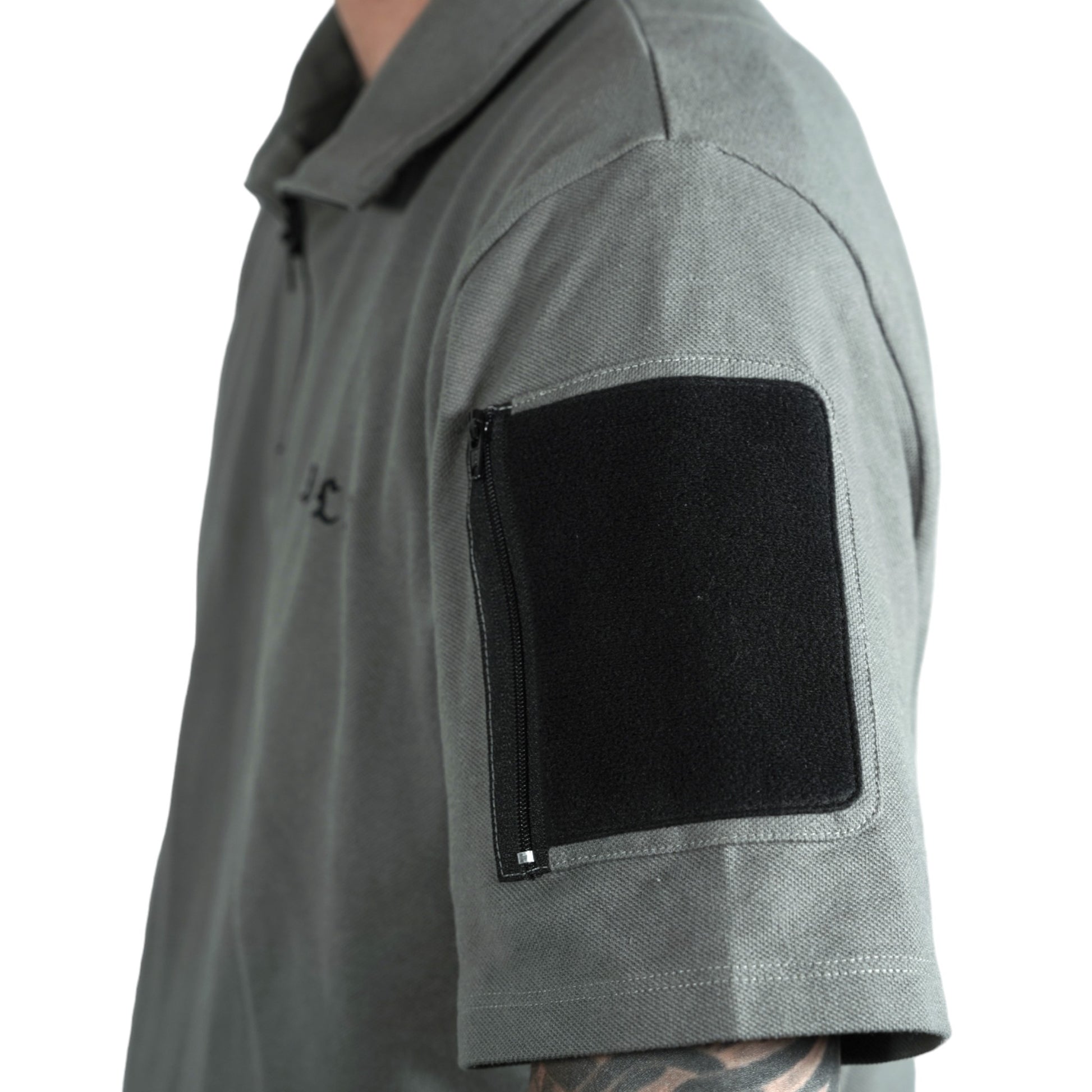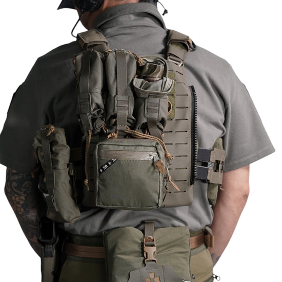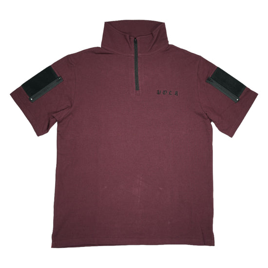 襟は首元にスリングが干渉しないハーフジップスタンドカラー。首元背面部と襟部分は負荷を想定して生地を2重にしています。また、装備装着時にジップ部分が人体に干渉するストレスを軽減する為に可能な限り小さなジッパーを採用、ジッパー内側はファスナーがむき出しにならない様に補強生地を縫製。ジップ全開時にはジップトップが収まる様に細かな配慮も施しています。