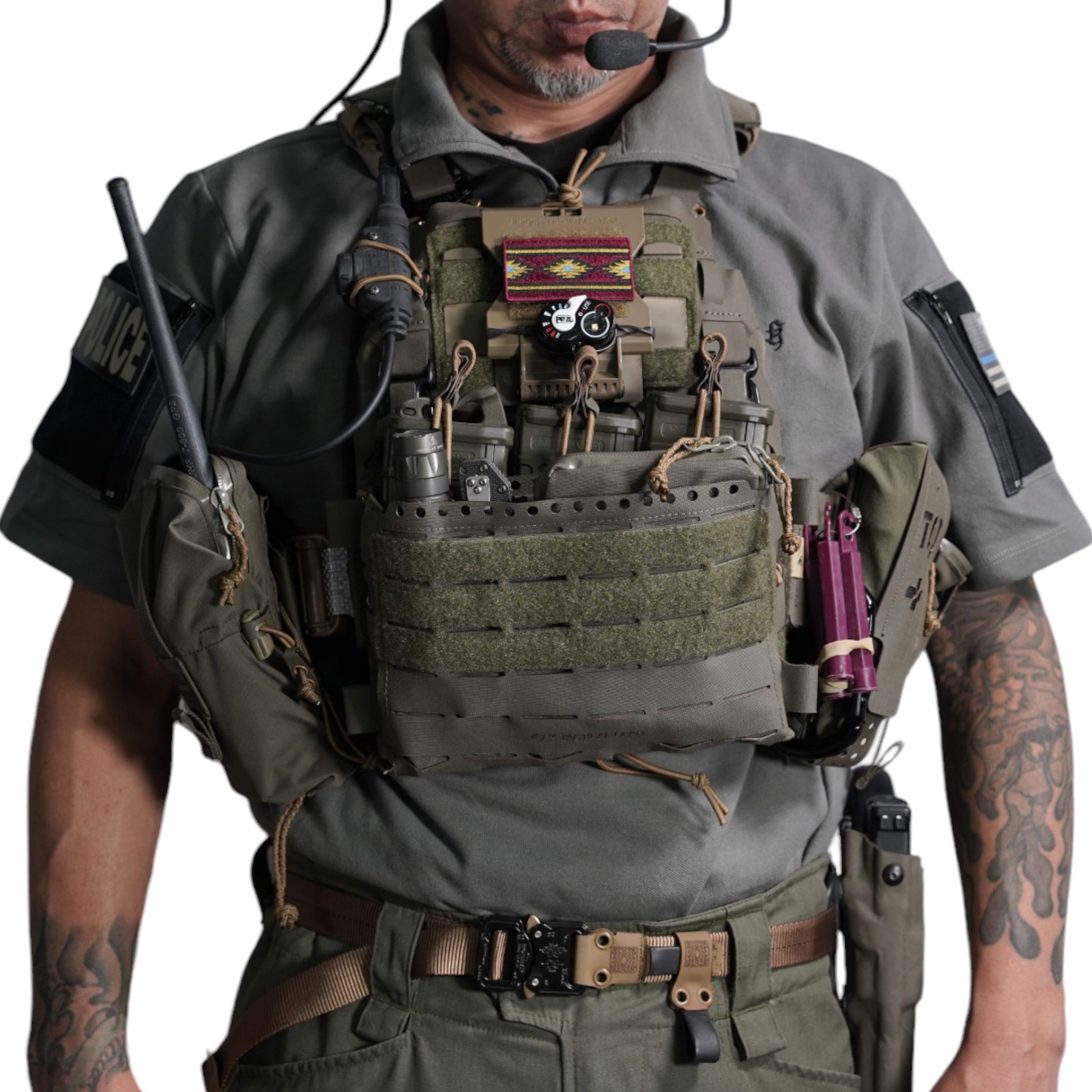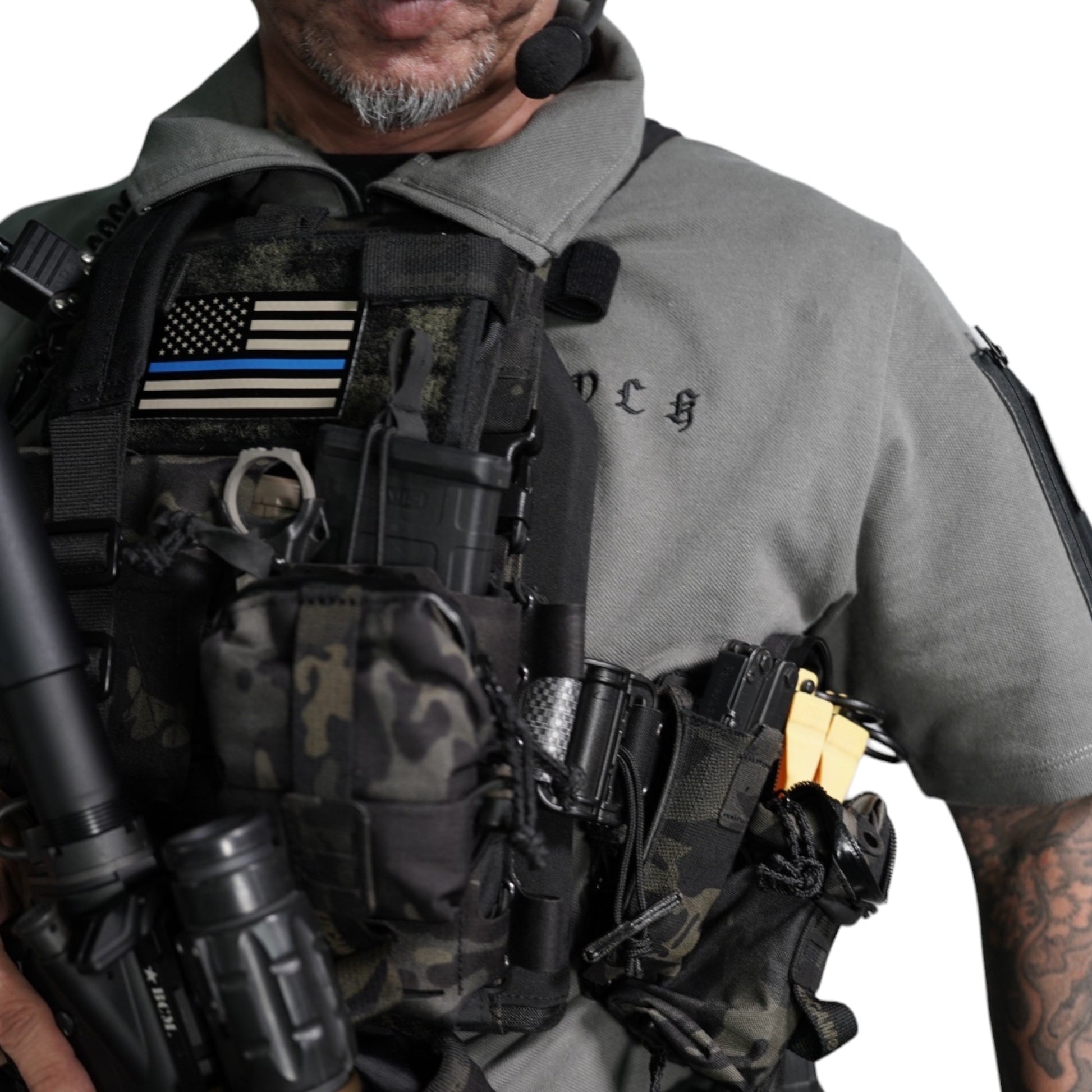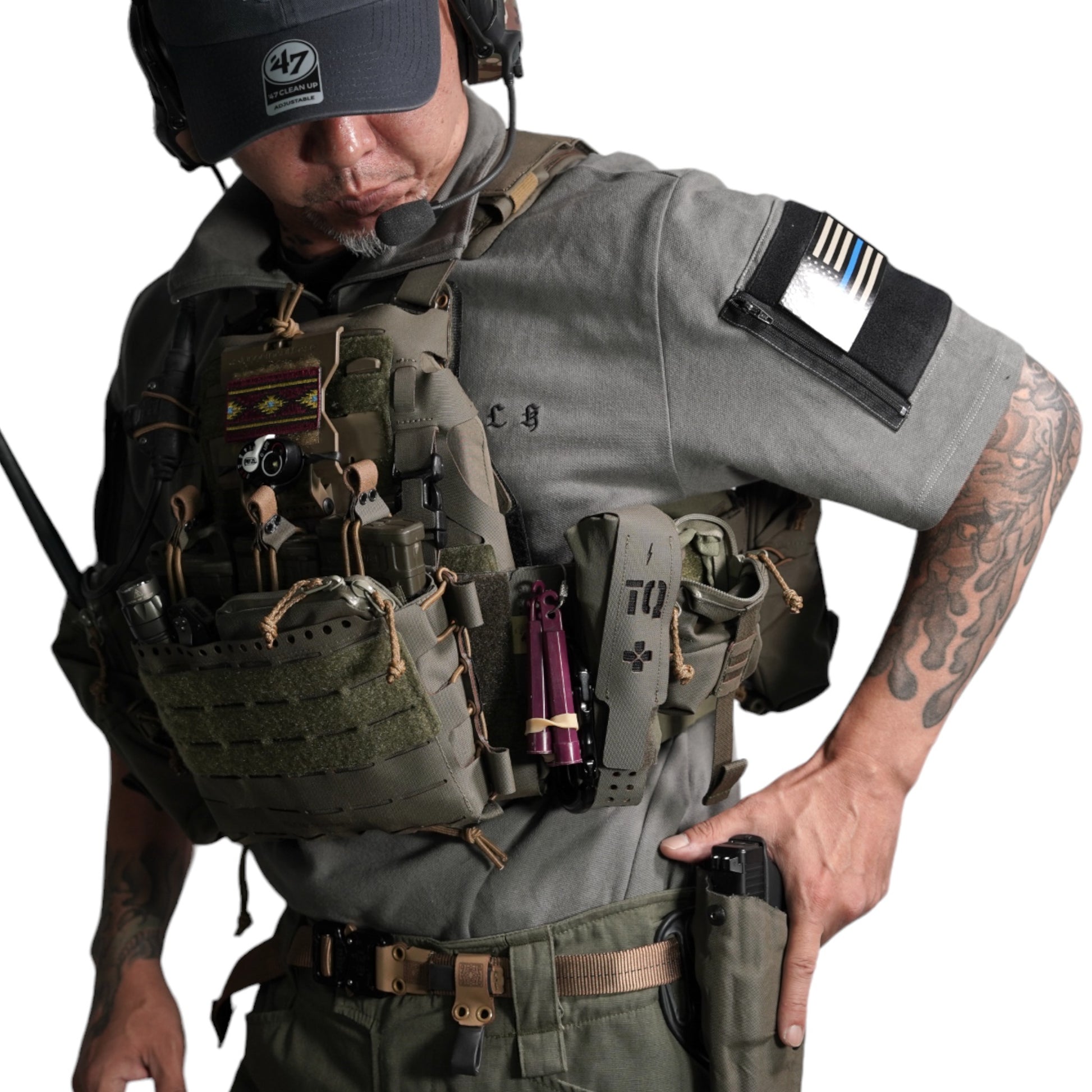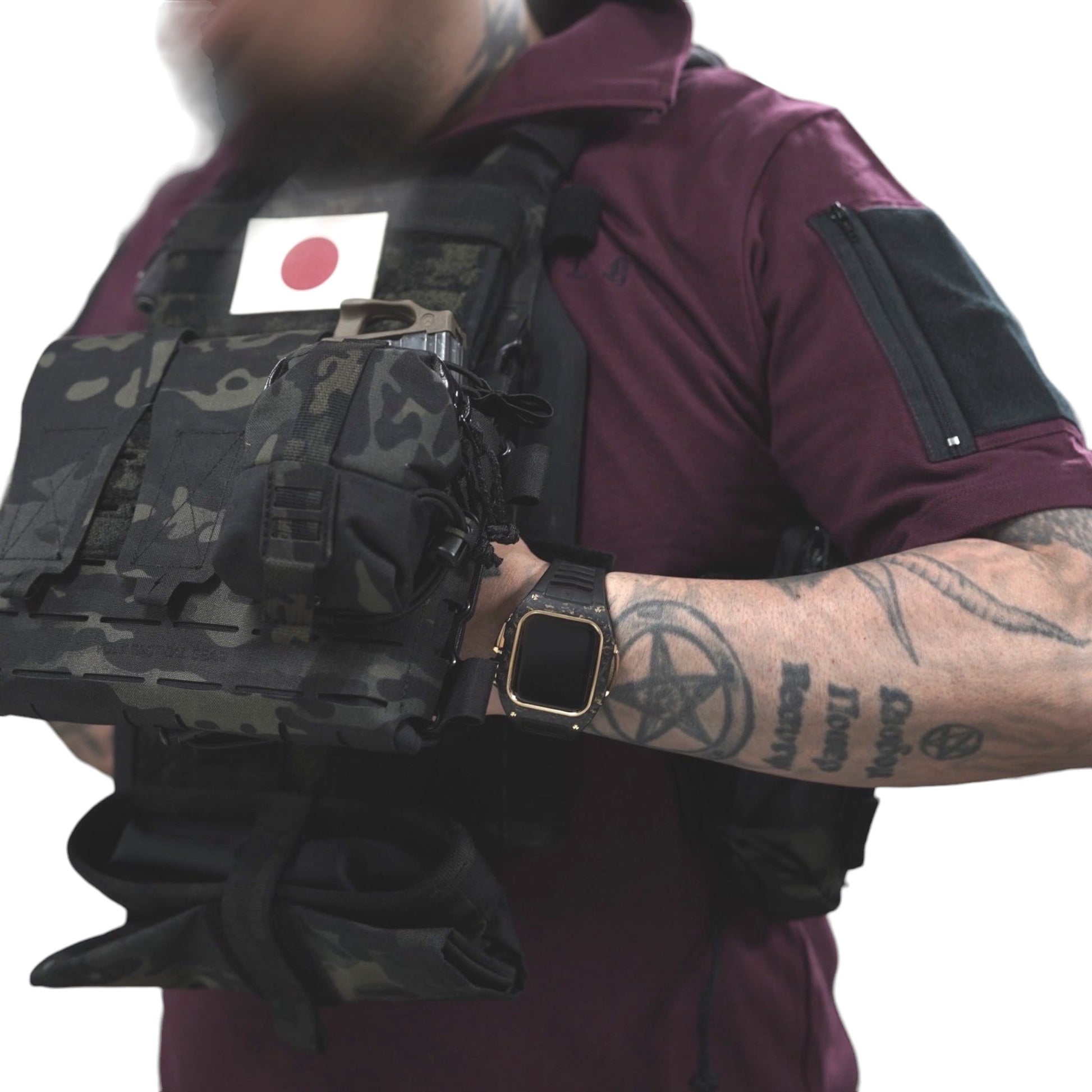 襟は首元にスリングが干渉しないハーフジップスタンドカラー。首元背面部と襟部分は負荷を想定して生地を2重にしています。また、装備装着時にジップ部分が人体に干渉するストレスを軽減する為に可能な限り小さなジッパーを採用、ジッパー内側はファスナーがむき出しにならない様に補強生地を縫製。ジップ全開時にはジップトップが収まる様に細かな配慮も施しています。
