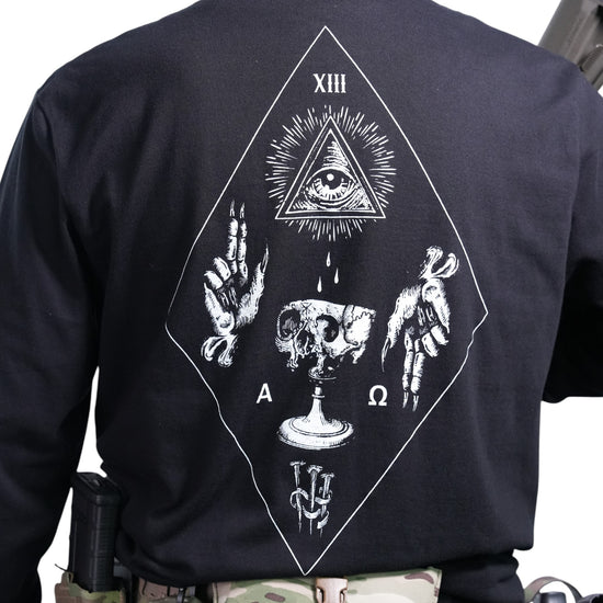 オカルトを象徴するような直線的で幾何学的なグラフィックが特徴のロンT。