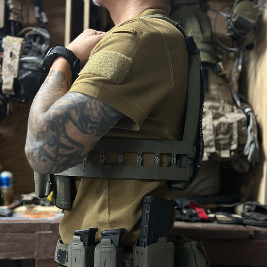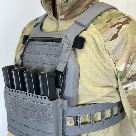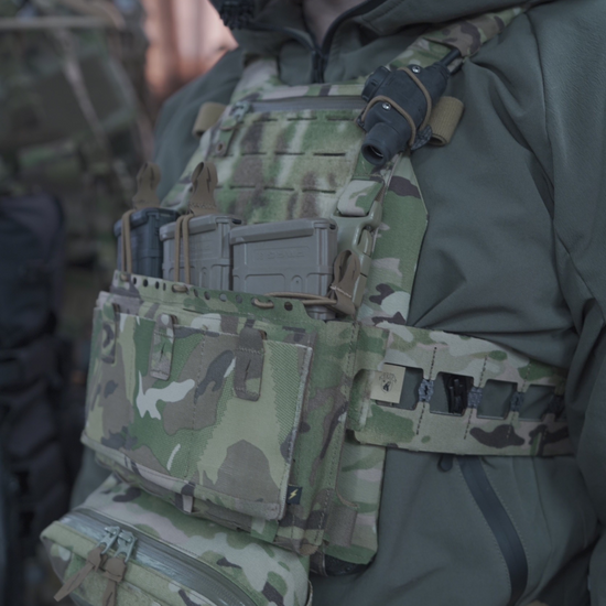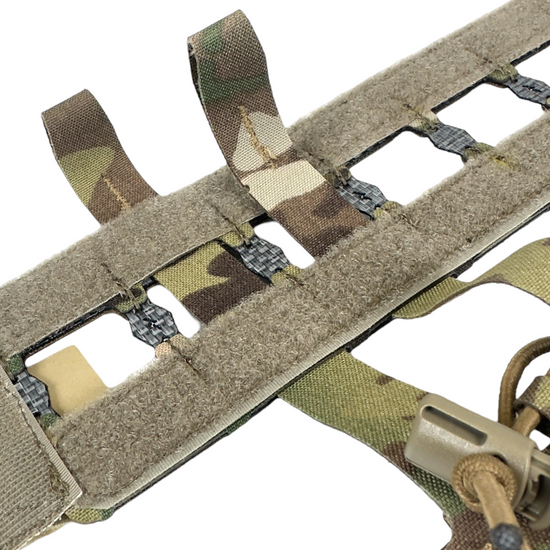 カマーバンド内部のMilliken®Tegris製フレームの形状と縦に入った縫い目で、胴体を包む方向には柔軟かつ、ポーチやサイドプレート等重量物をつけた際の重力方向には十分な剛性をもちます。