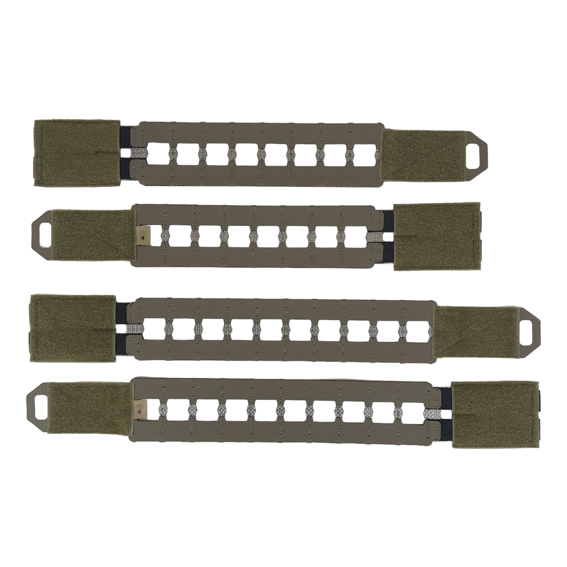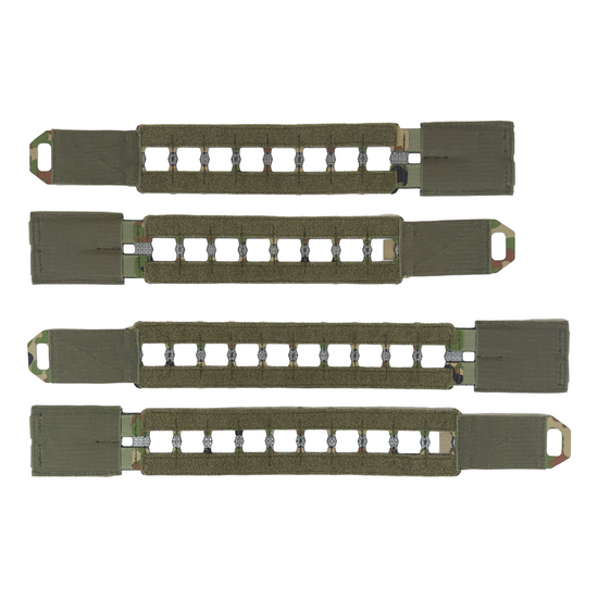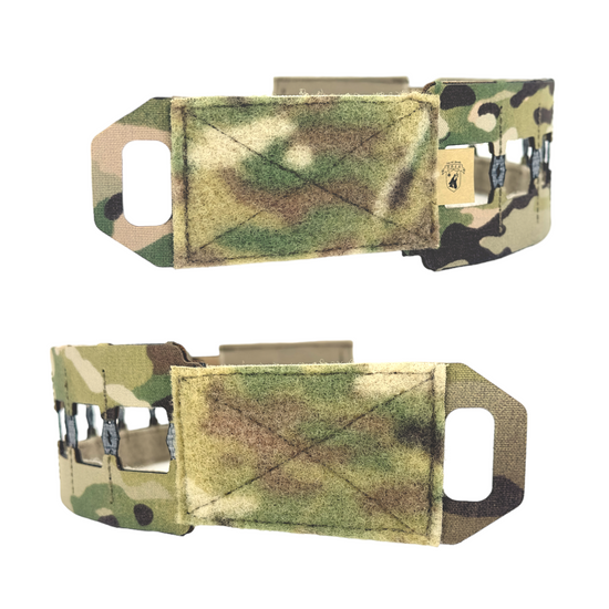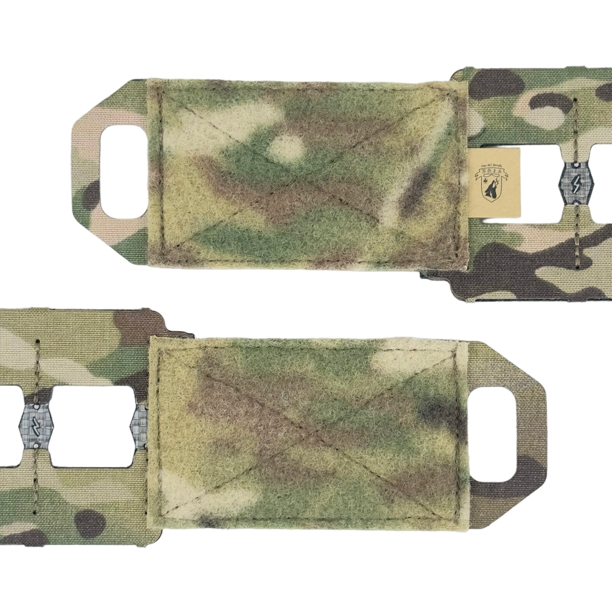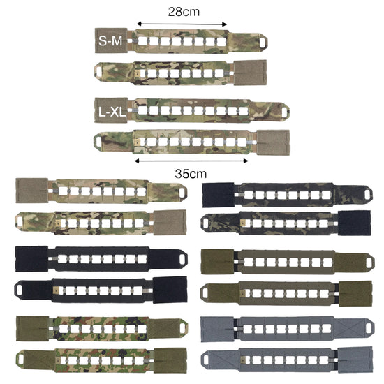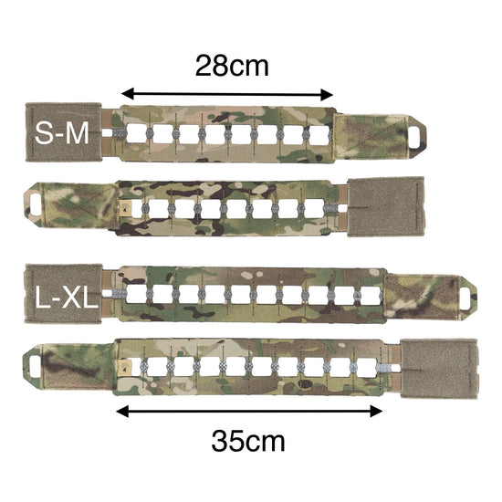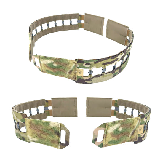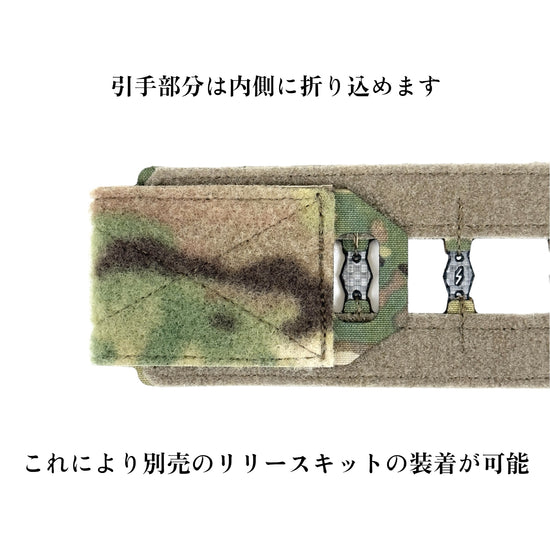 カマーバンド中心のテグリスの芯材を覆う形で裏表にスコードロンモールを縫製し、体面側には更にベルクロループを(メス)を縫製しています。カマーバンド全域のモールには内側外側どちらにもモール対応装備の装着が可能です。
