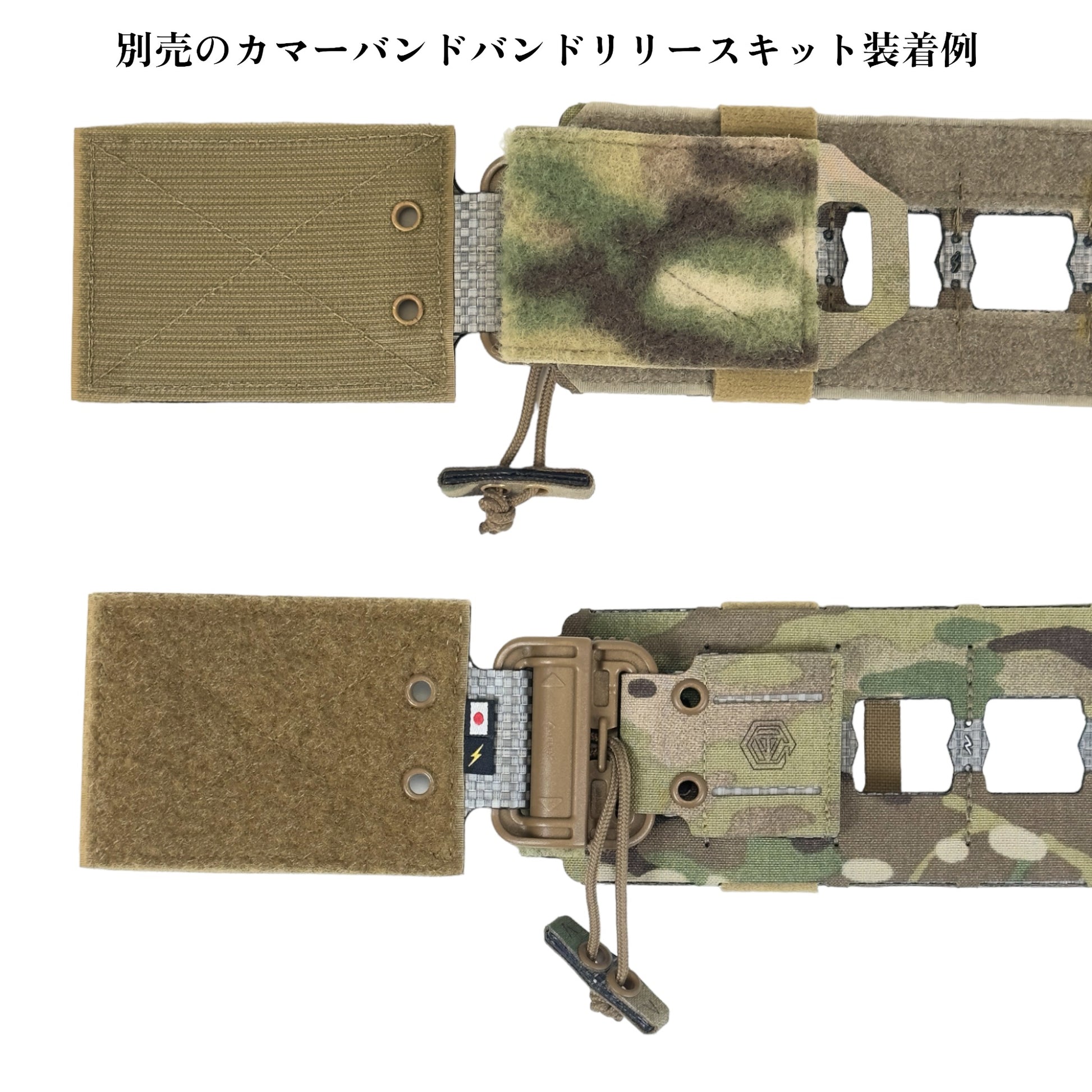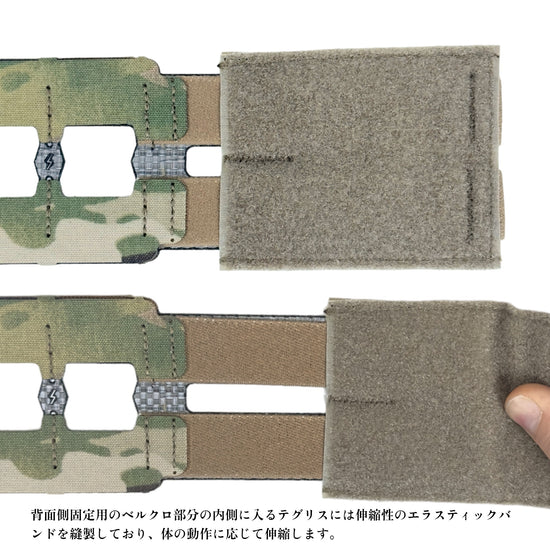 カマーバンドの引手部分は折り曲げられる様にしており、これにより別売りのカマーバンドリリースキットが取り付けられます。背面側固定用のベルクロ部分の内側に入るテグリスには伸縮性のエラスティックバンドを縫製しており、体の動作に応じて伸縮します。