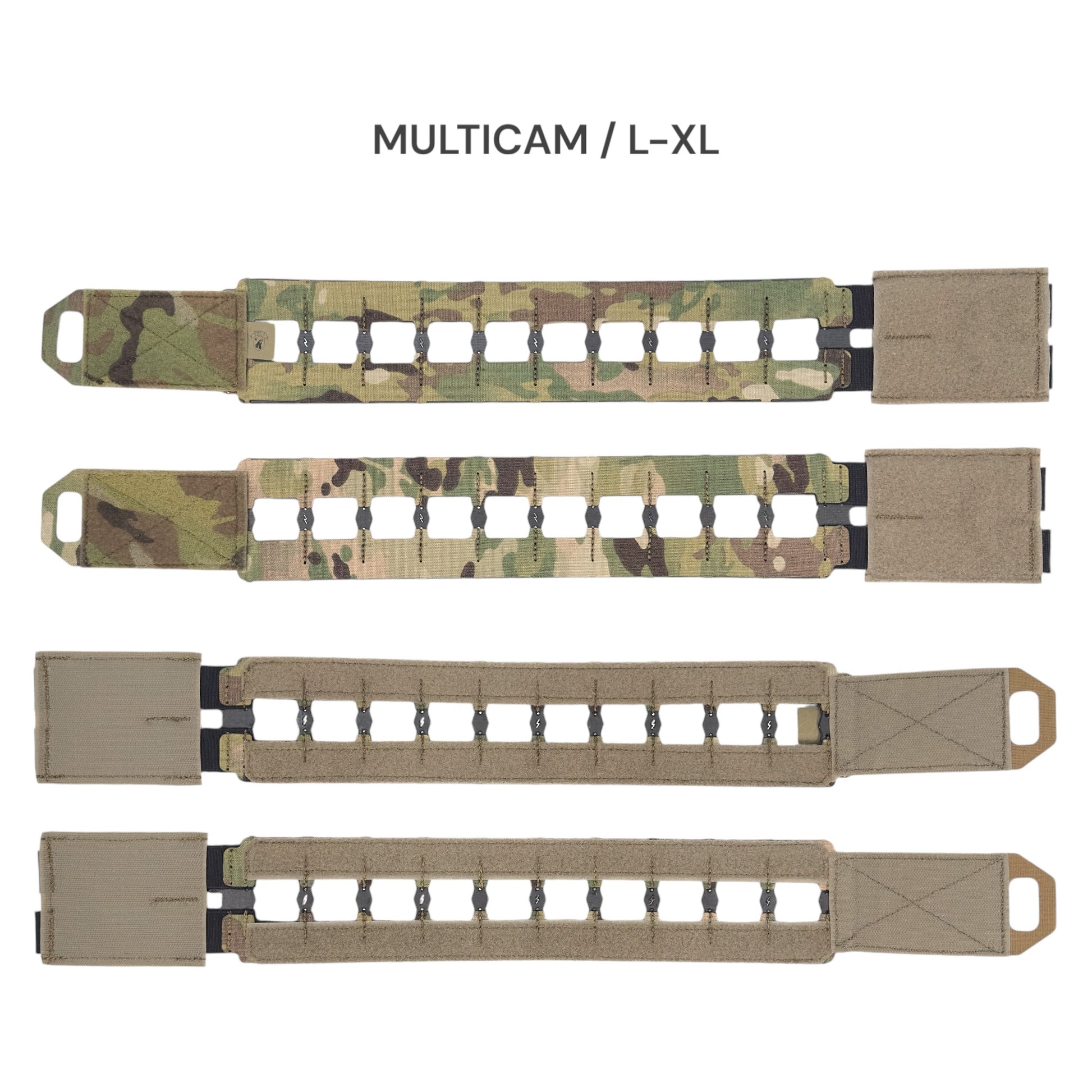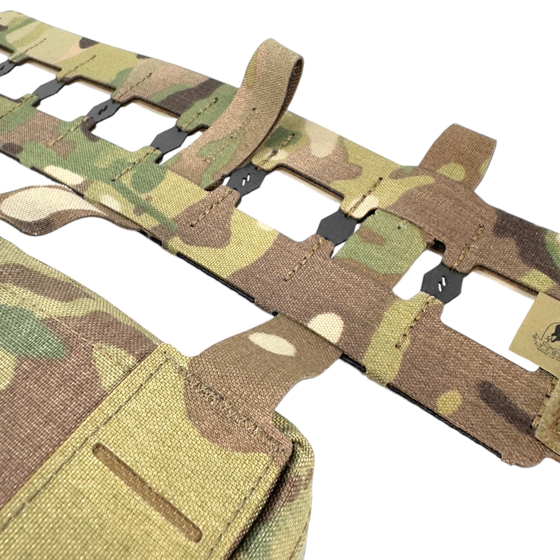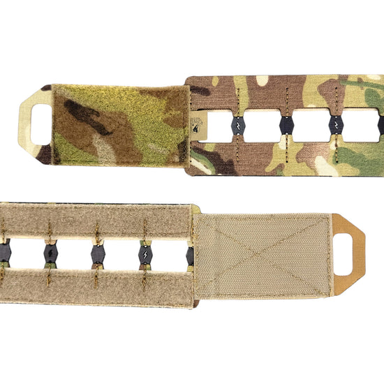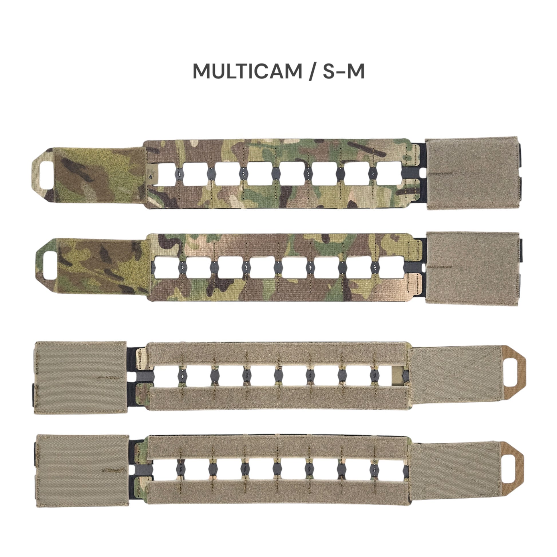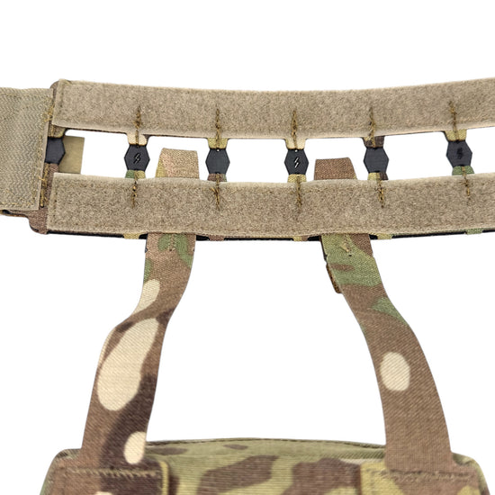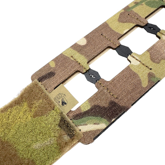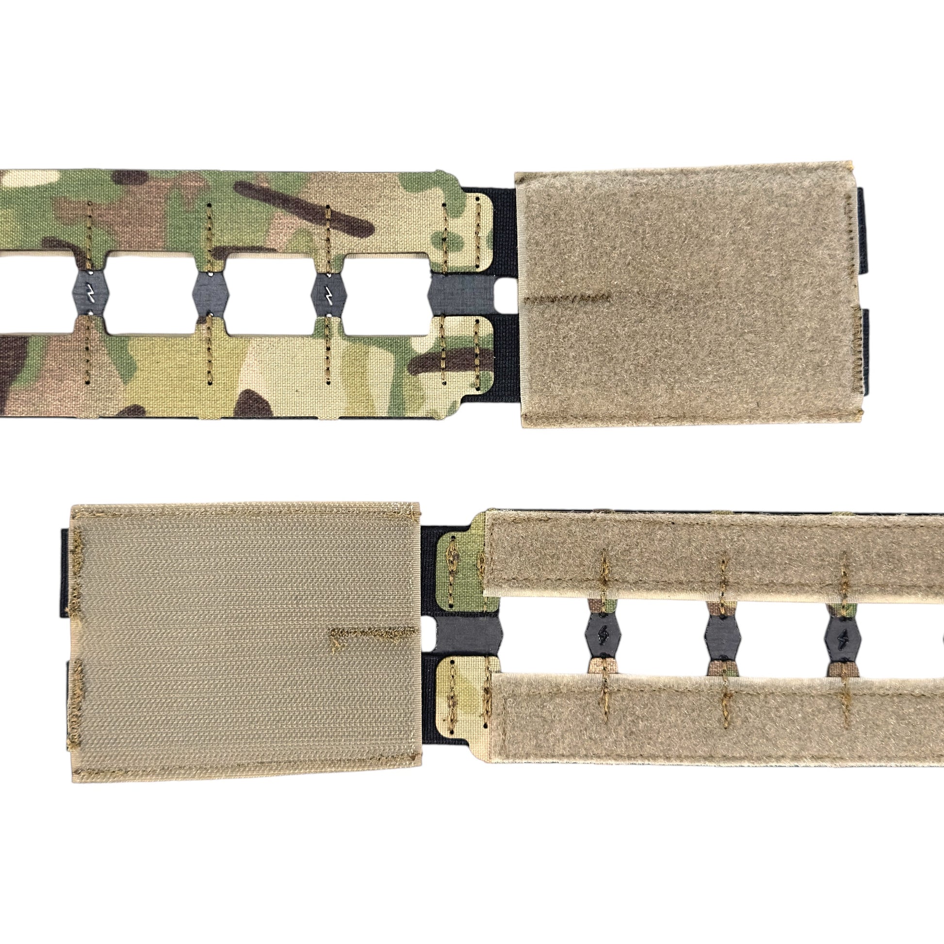 カマーバンド中心のCURVの芯材を覆う形で裏表にスコードロンモールを縫製し、体面側には更にベルクロループを(メス)を縫製しています。カマーバンド全域のモールには内側外側どちらにもモール対応装備の装着が可能です。