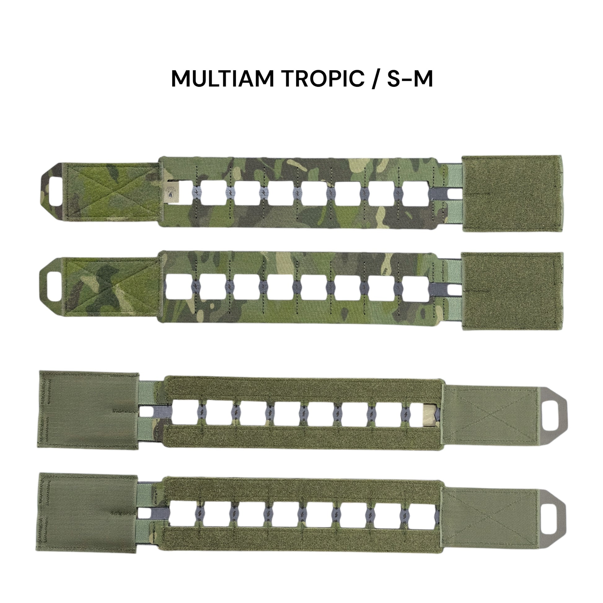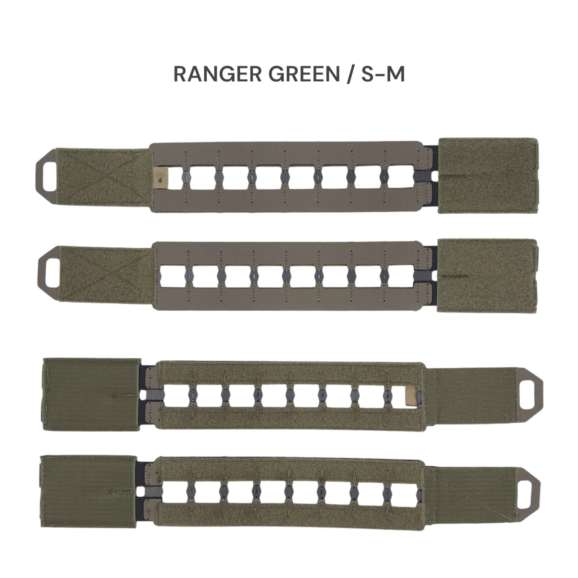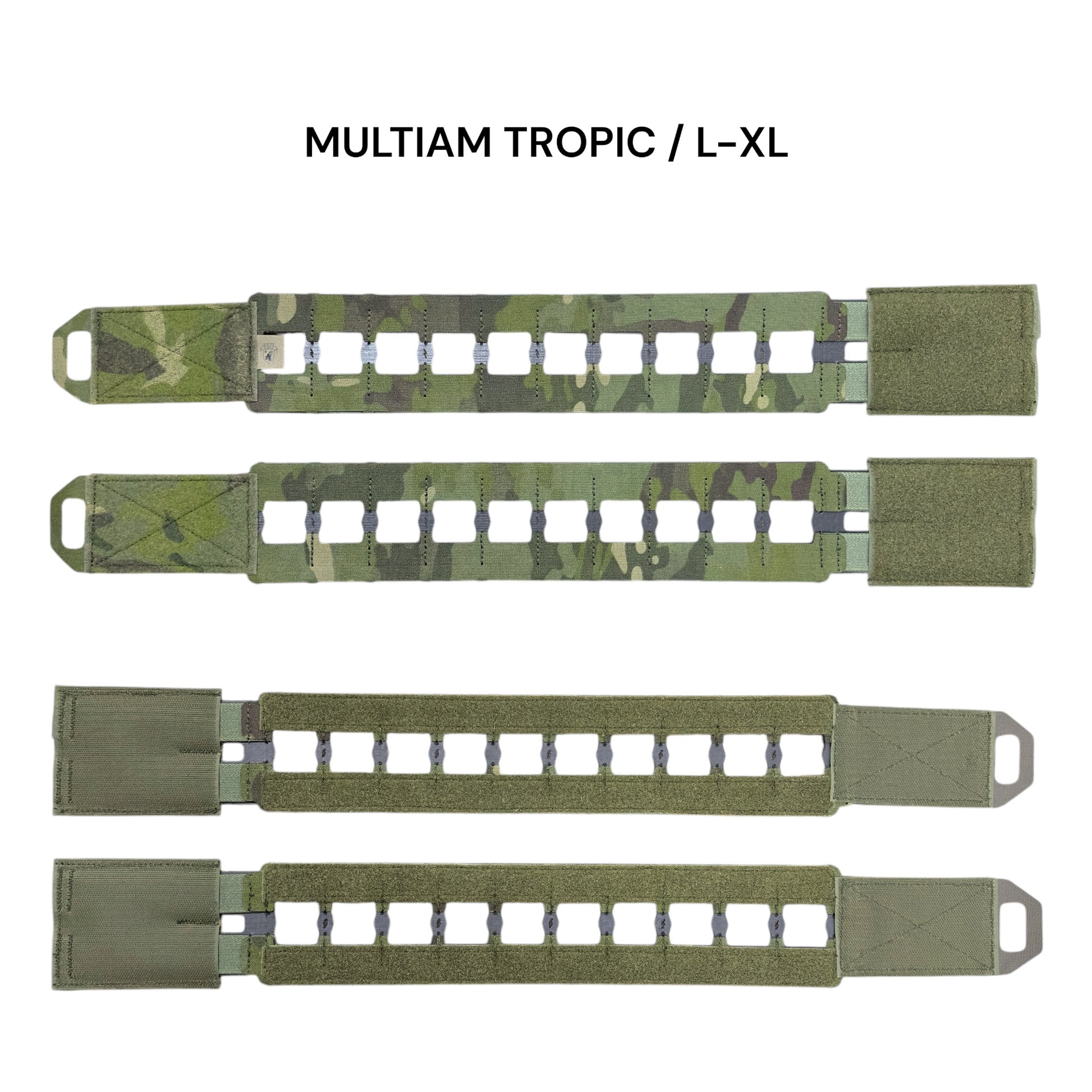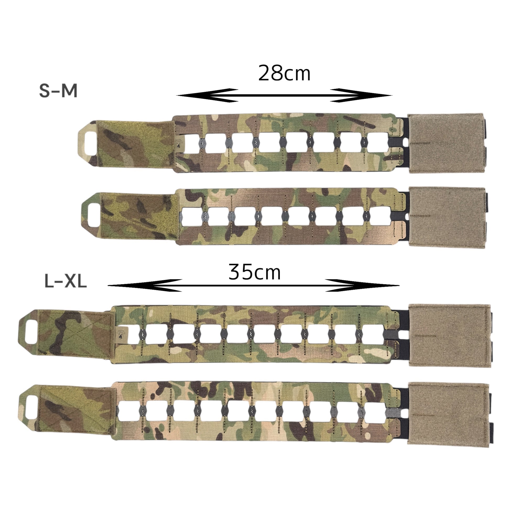 カマーバンド中心のCURVの芯材を覆う形で裏表にスコードロンモールを縫製し、体面側には更にベルクロループを(メス)を縫製しています。カマーバンド全域のモールには内側外側どちらにもモール対応装備の装着が可能です。