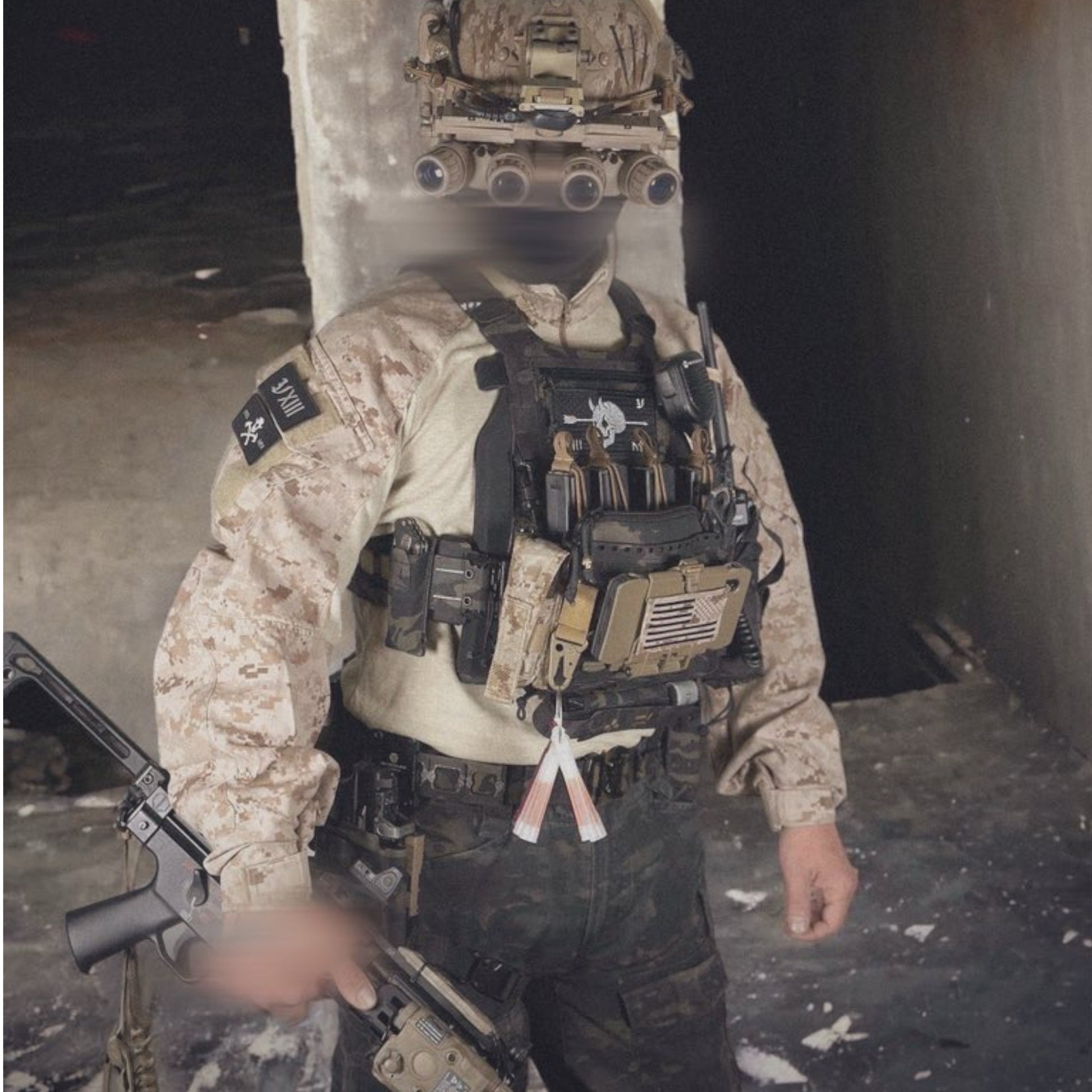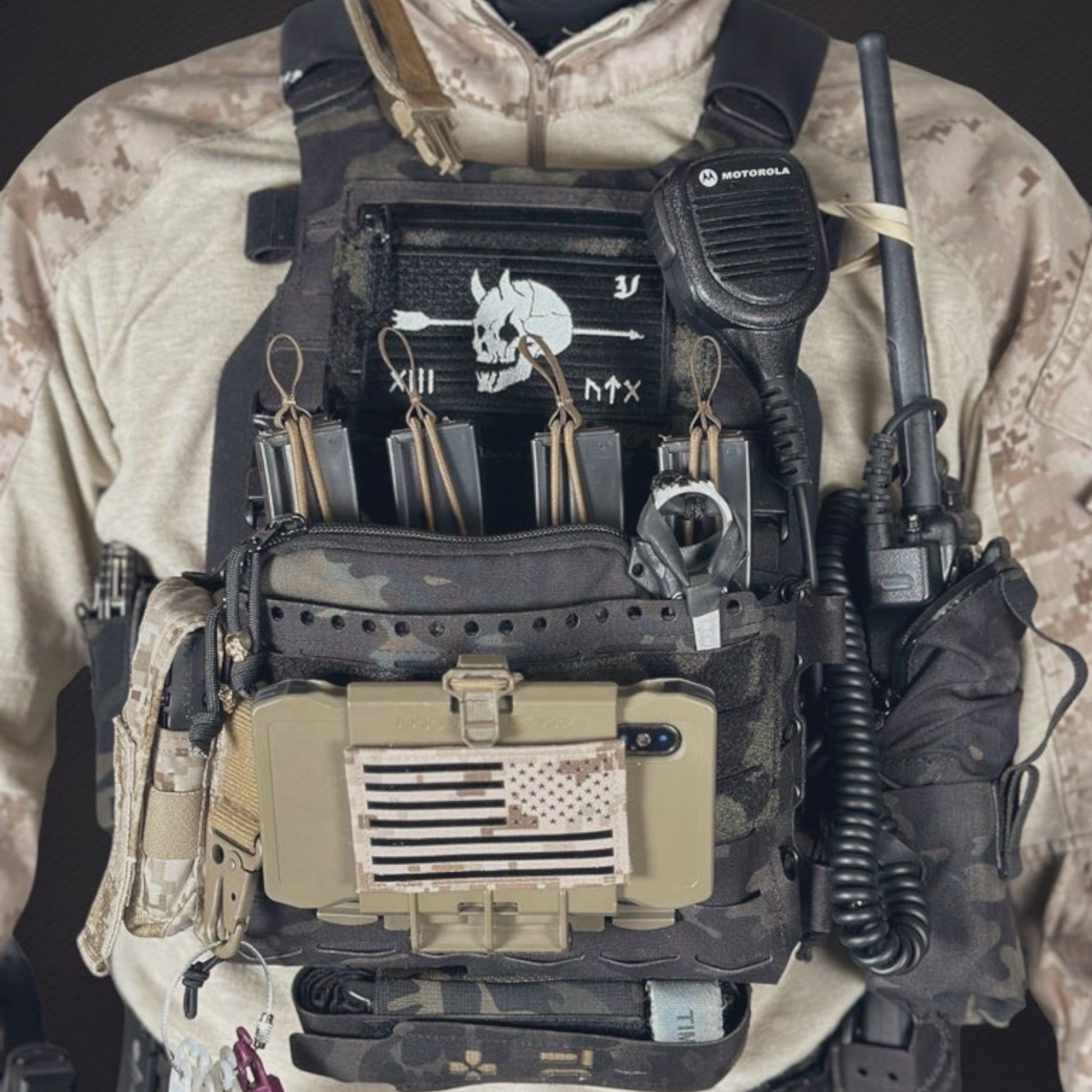 主にプレキャリ胸部やバックパネル等の目立つ場所に貼る目的で大き目サイズで製作。よく見るとベースに黒の星条旗が刺繍されているのもポイントです。
