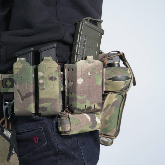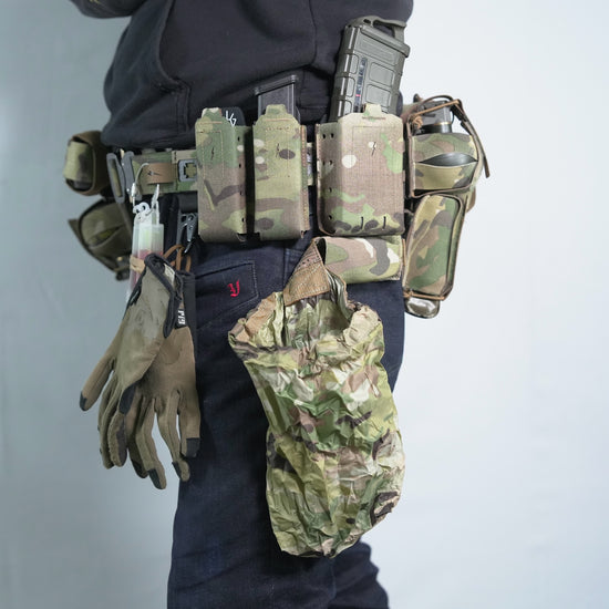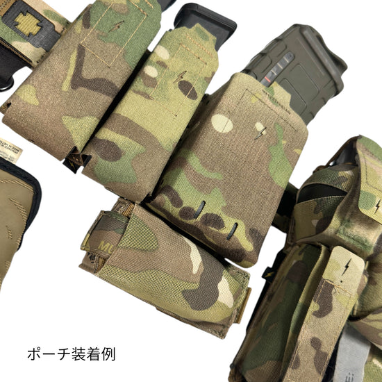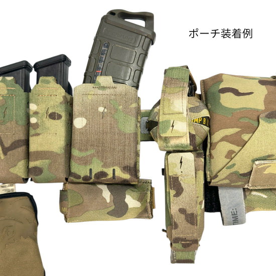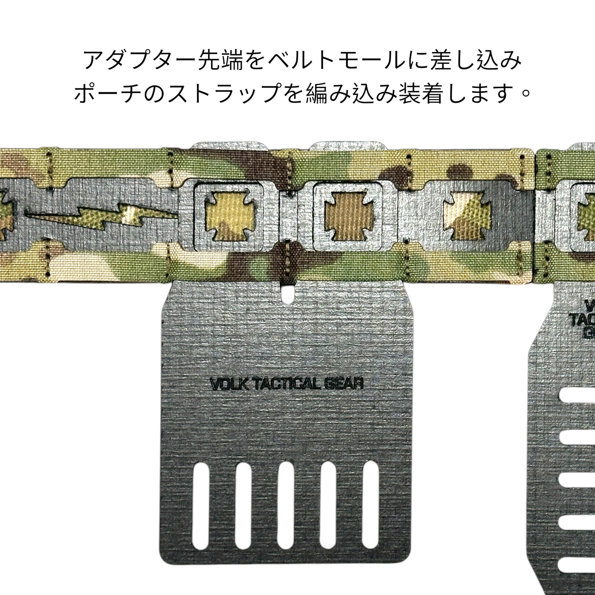 2インチ幅までのタクティカルベルトのモール部分に先端を差し込み、ポーチ装着時に同時に編み込んで固定します。装着ポーチの下部分にポーチを横向きに取り付けらます。