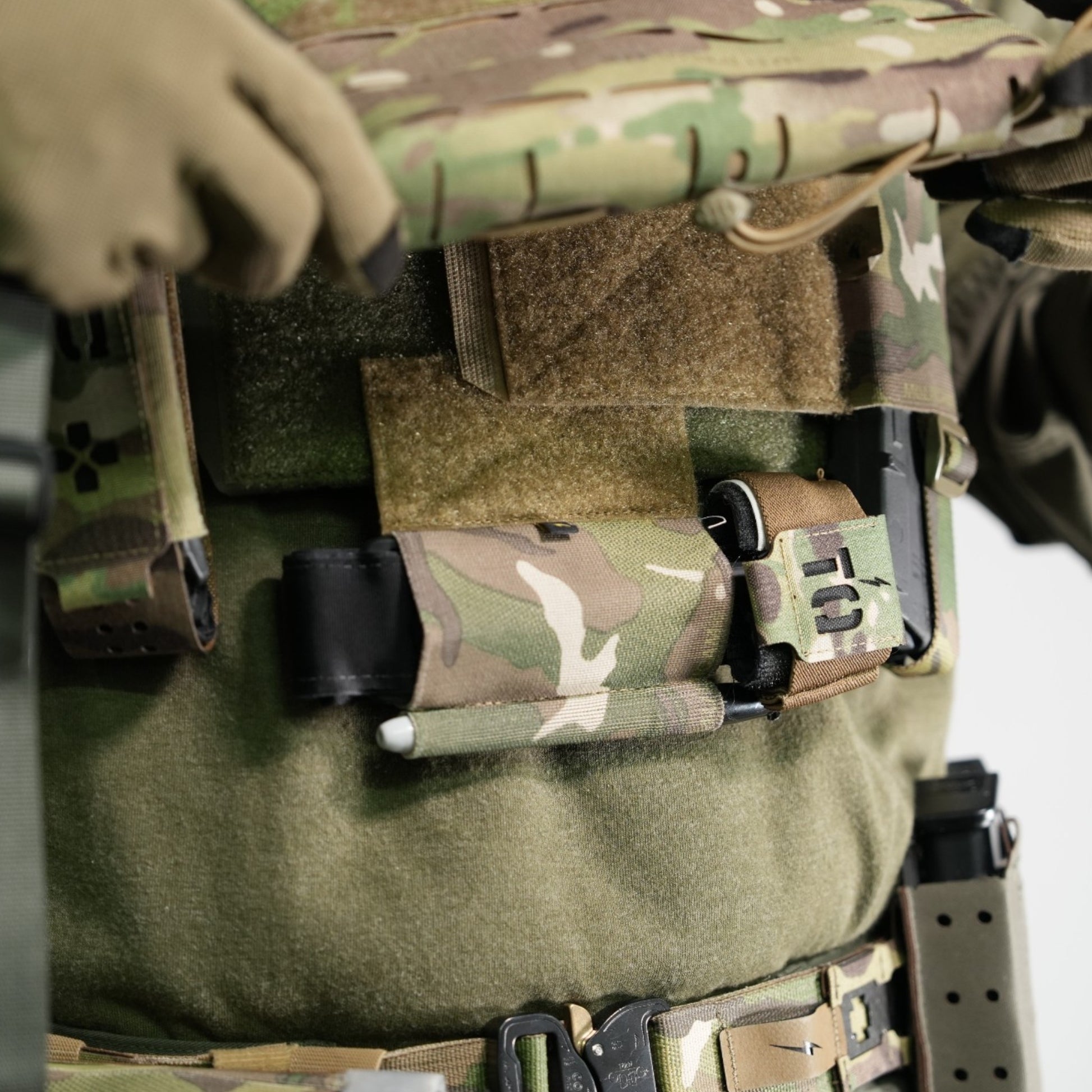 背面モールストラップはスコードロン素材使用で、止血帯ホルダー部分には伸縮性のエラスティックバンドを採用し、素早く止血帯を引き抜ける様に設計しました。可能な限りコンパクトにし、他装備との干渉を最大限軽減しています。本体ホルダー部分の横部分にはペンホルダーも配置しています。
