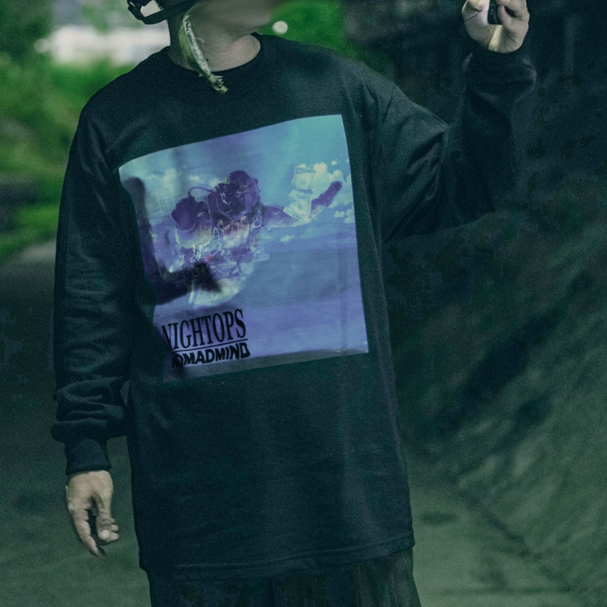 赤ん坊の代わりに描かれているのは、HALO(High Altitude Low Opening)降下する兵士。写実ではなく、どこかゲーム的なピクセルアート風のタッチで再構築しています。ロゴも「NIGHT OPS / NOMAD MIND」とアレンジされ、オリジナルへの遊び心あるオマージュに。
