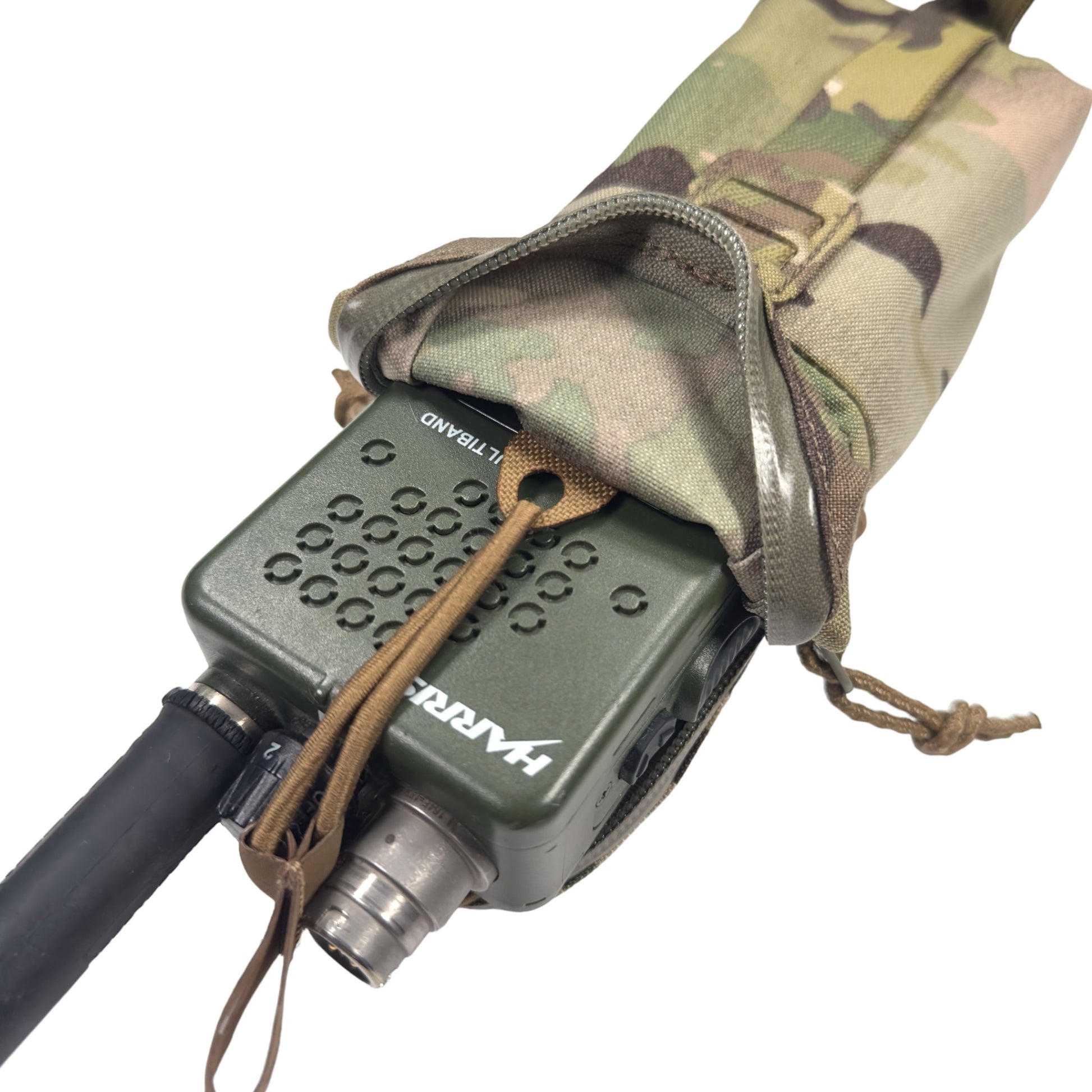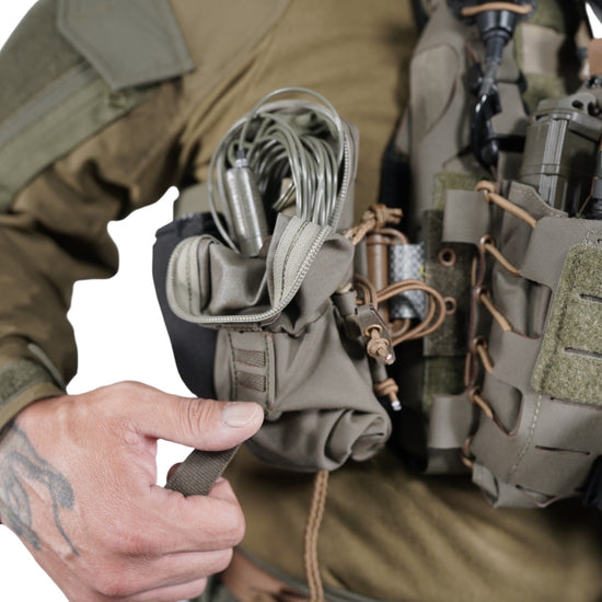ポーチ中心部辺りに内蔵したバンジーコードの絞り調節により、収納物に応じた脱落防止テンションをかける事ができる構造で、内容物をポーチ内部でしっかりと保持します。