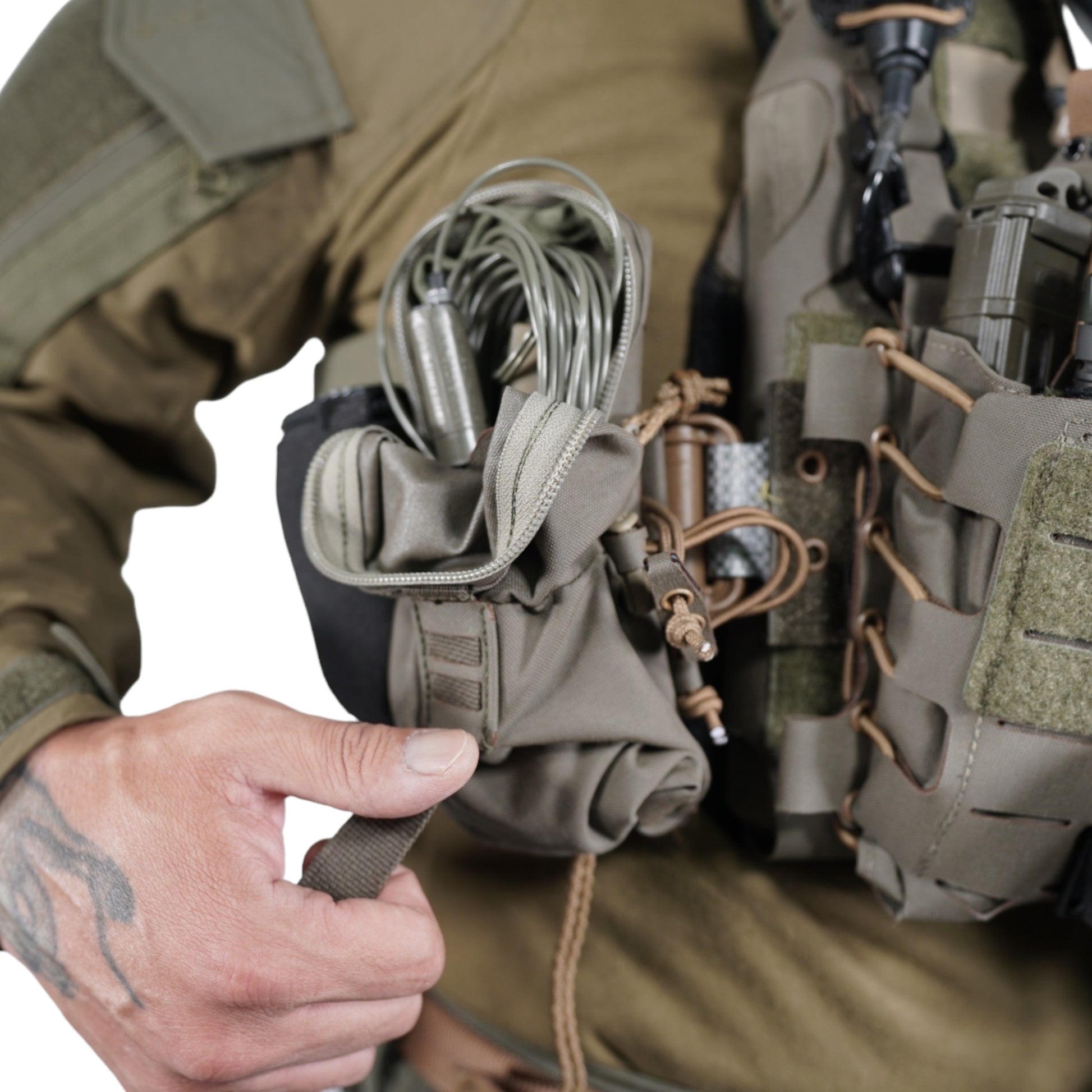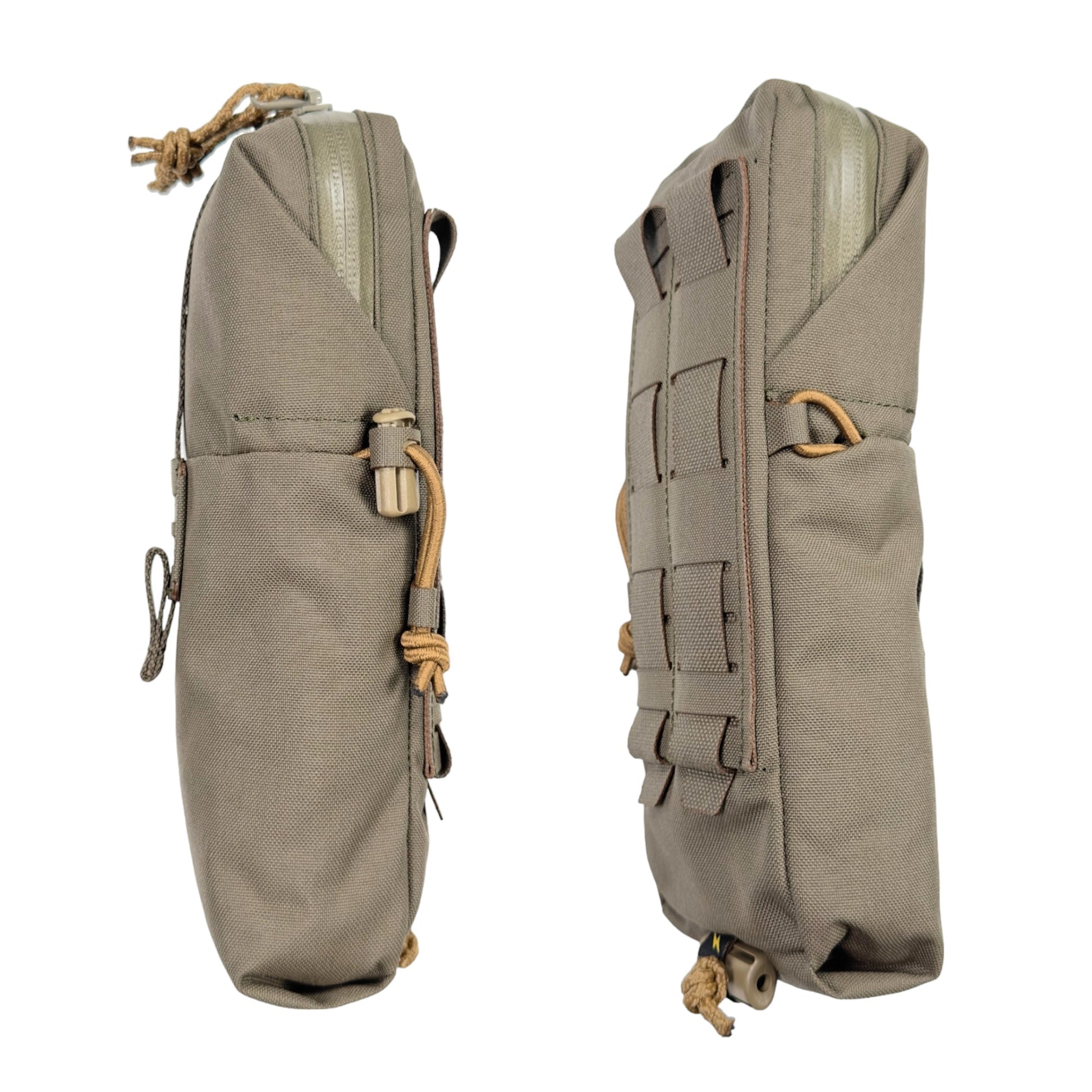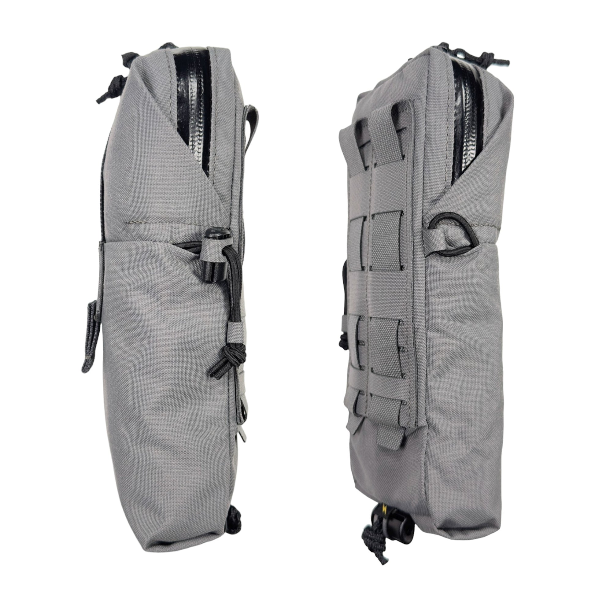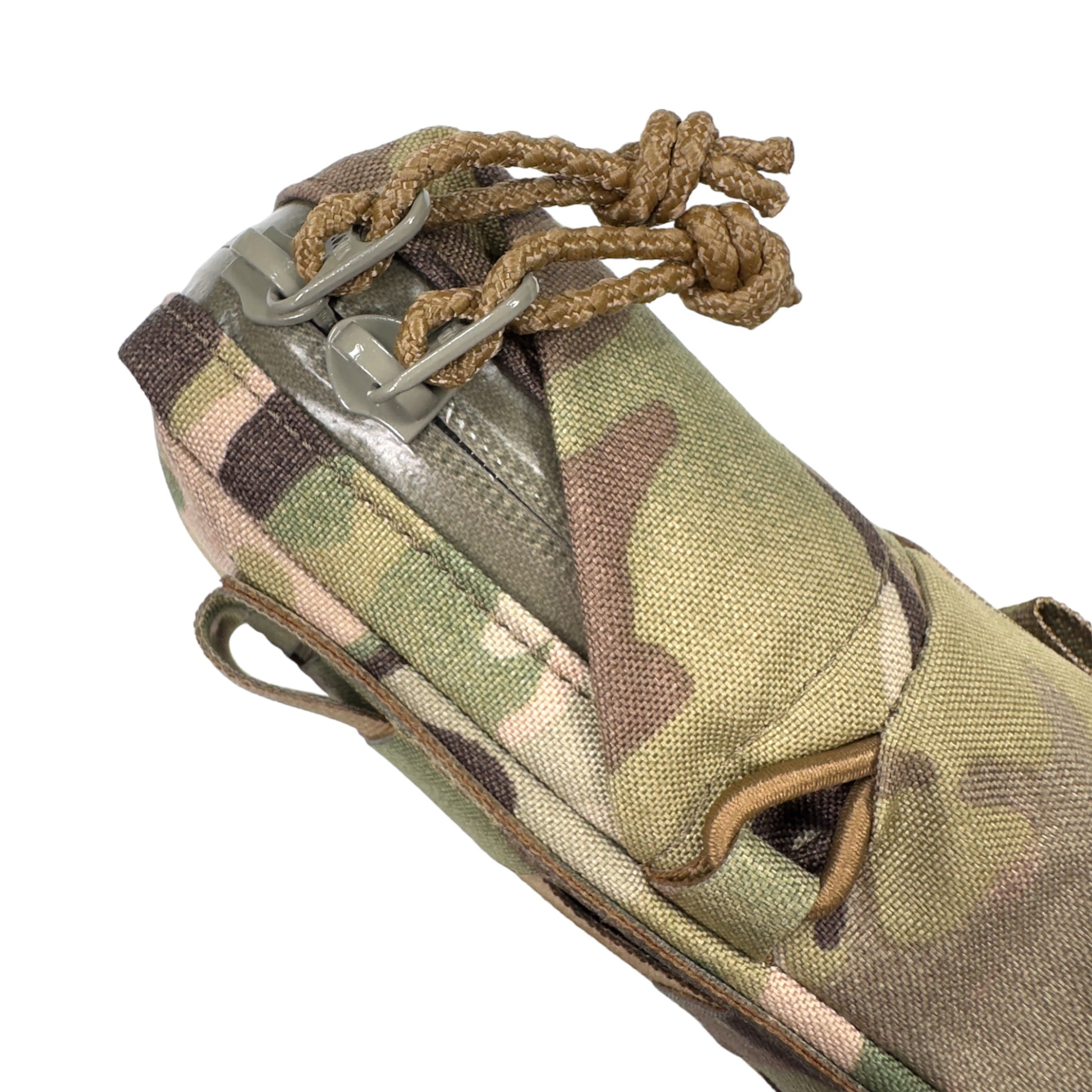 ジッパーはYKKの止水ジップで、引手には滑り止めが効く表面が凸凹したロッキングコードを使用しています。ポーチ内部体面側にはベルクロループ(メス)を配備。更に脱落防止用にバンジーコードを通して固定したり、紐などを結んでおけるスコードロン製のループも前後2箇所に配備しています。