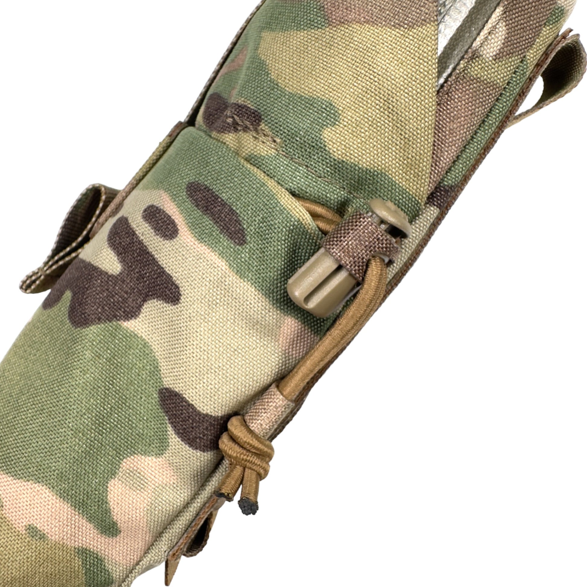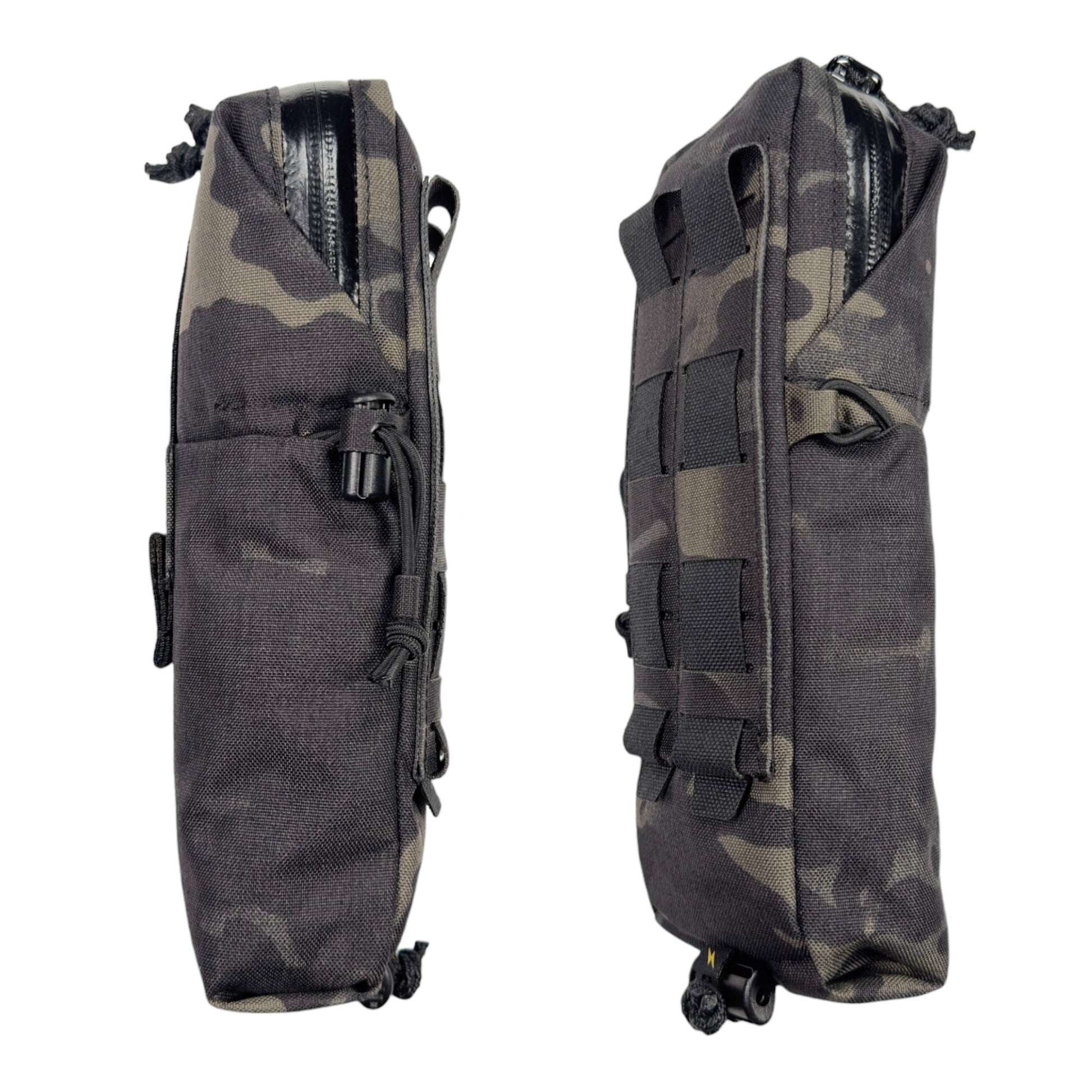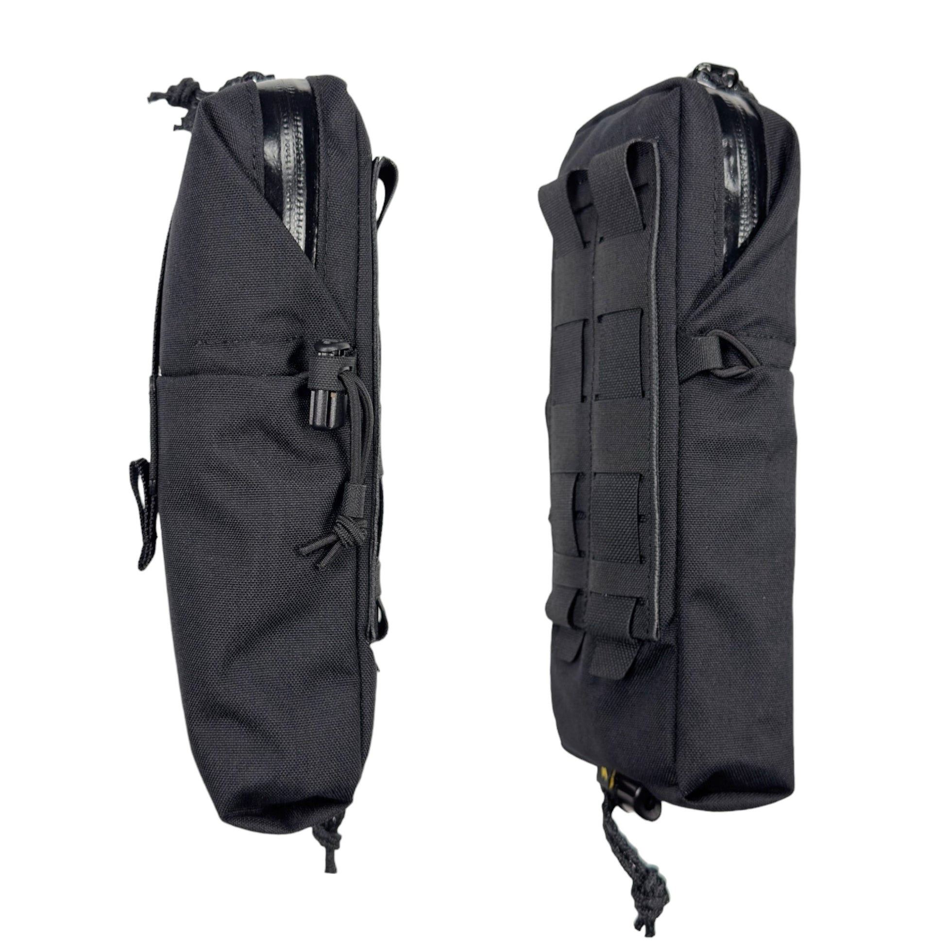 また、収納物の高さが足りず、底に埋まってしまう様な時には、ポーチ内部からドレインホールを通して外部コードロックに固定したロッキングコード絞る事で、最大9cm程のポーチの底上げ(ポーチの長さを縮める)が可能です。