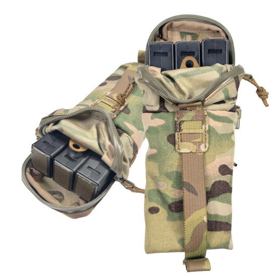 ジッパーを開けてポーチ前面のウェビングハンドルを下に引く事で、開口部が前面に大きく開き、内容物に素早くアクセスする事を可能にし、ポーチが開いた状態を保持します。この時ポーチ開口部は内容物が脱落しない程度の一定の箇所で折り曲がる様に工夫した設計にしており、一手間加えた縫製を施しています(ポーチ側面画像参照)。