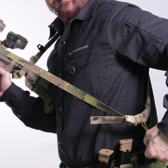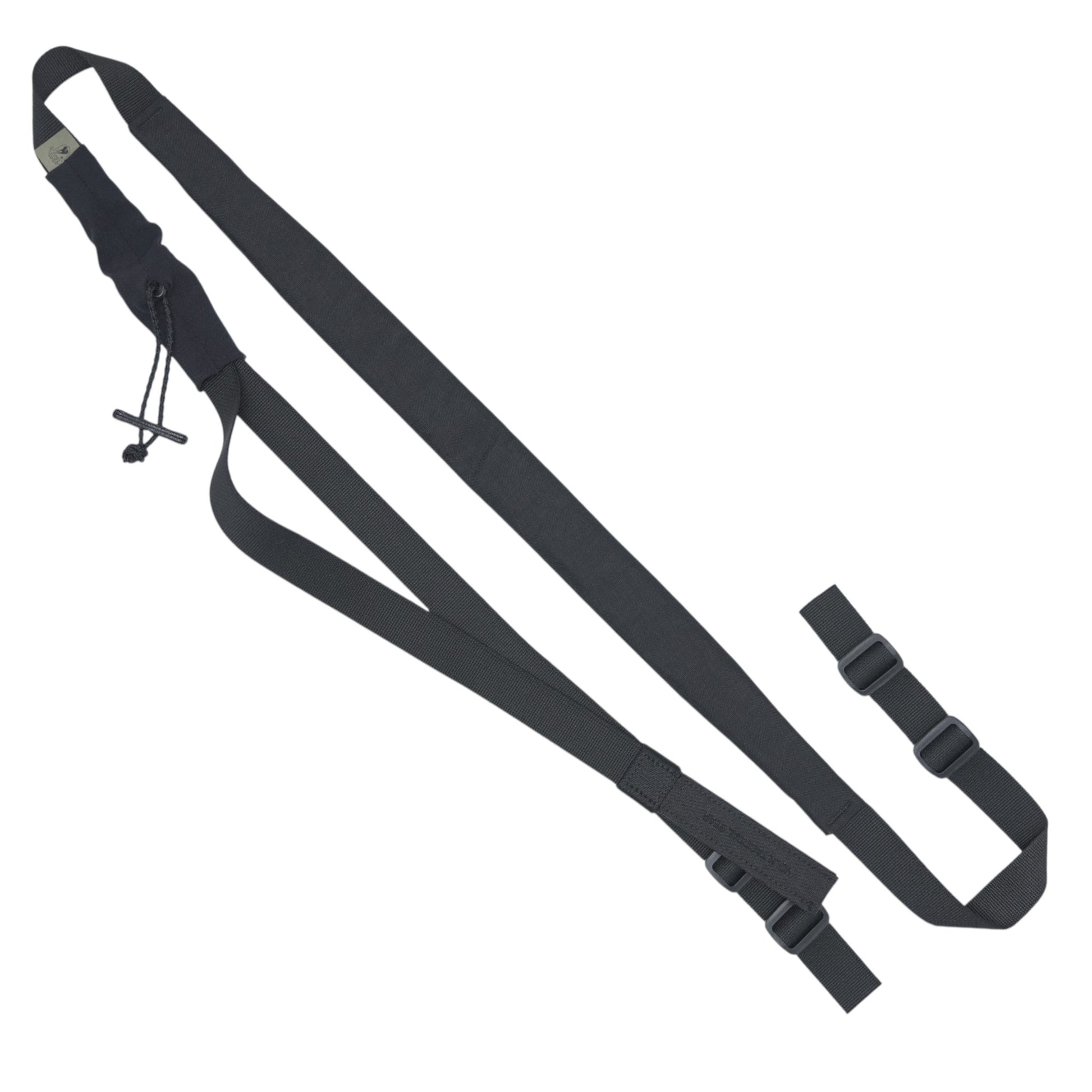 スリングを“伸ばす”側のアクションに用いられる金属パーツは、SAM1 ファブリックで外装を覆うことで、金属音の発生や装備への干渉を抑制。対して“縮める”側の操作は、レーザーカットされた SQUADRONのハンドルにより、薄型ながらしっかりとした剛性と扱いやすさを両立しています。