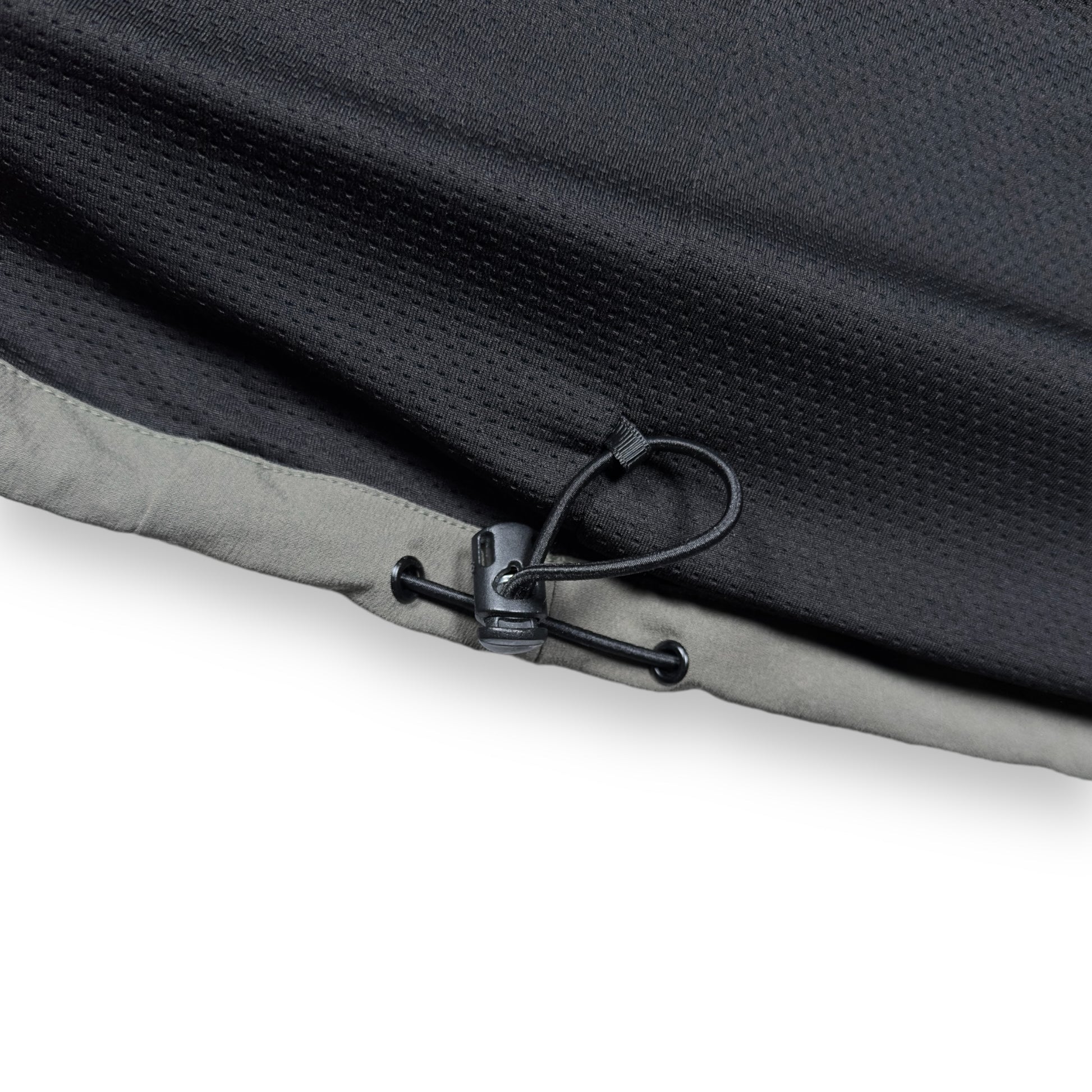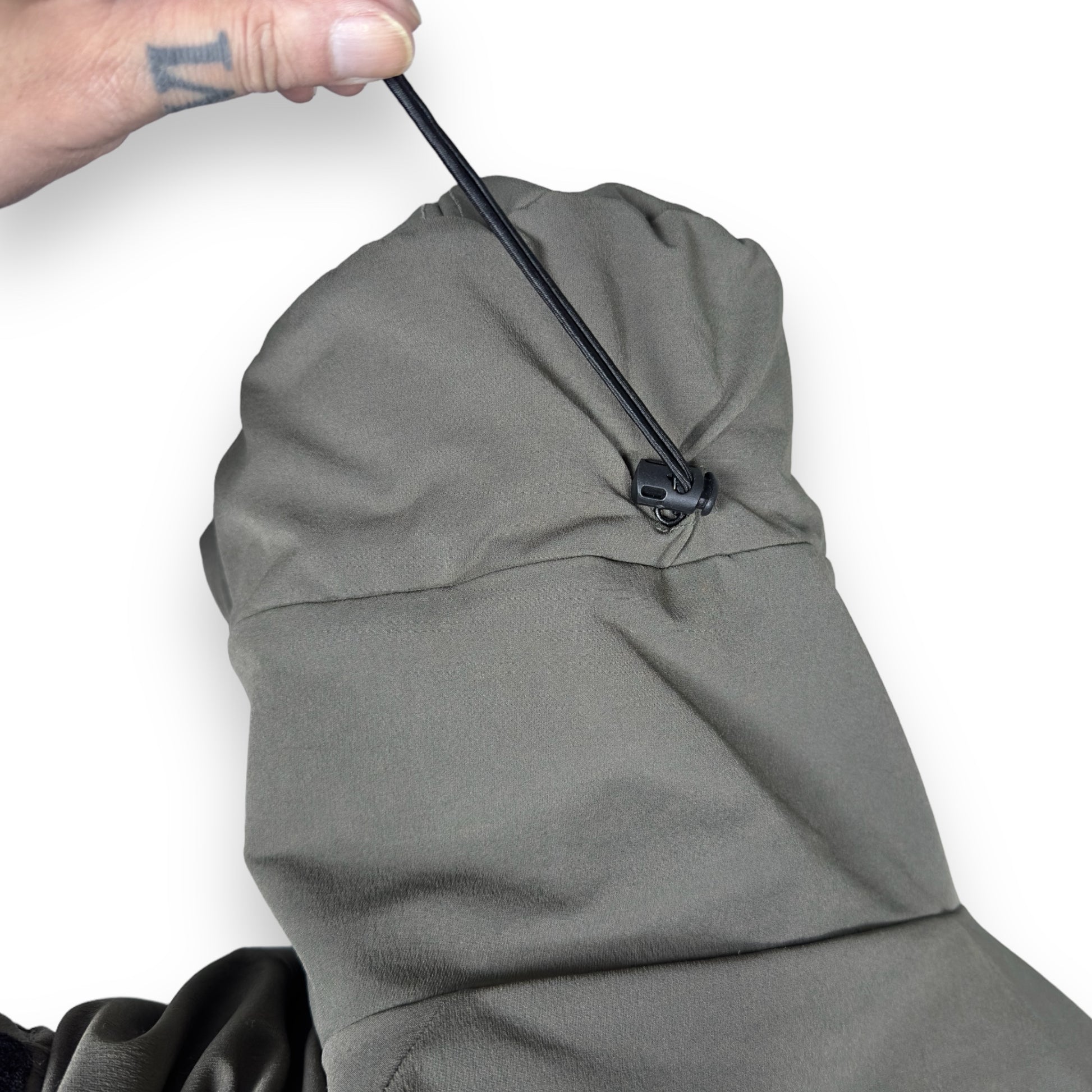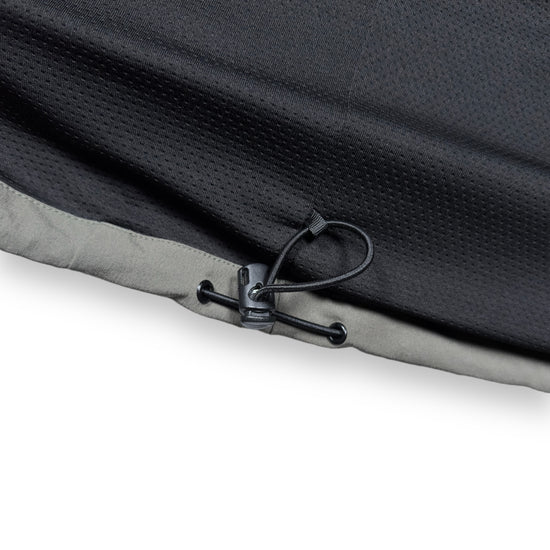 裾部分と立体裁断のフード部分の内部にはそれぞれ裾部分、フード部分を絞って固定出来る様にショックコードとコードロックを配備しています。裾部分は風の侵入を防ぎ、フード部分は絞る事でフードが頭部に完全に密着し、両サイドの視界が広がる様に設計しています。
