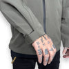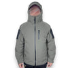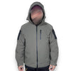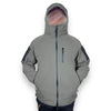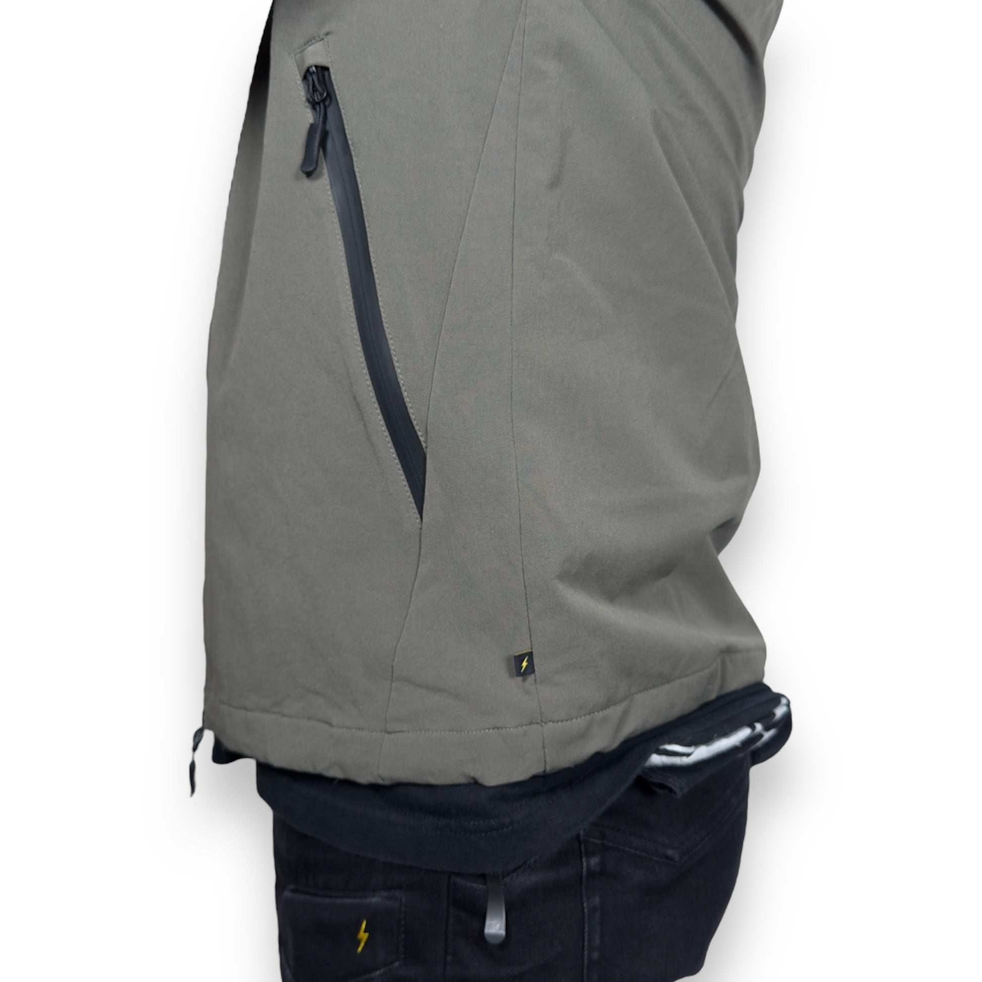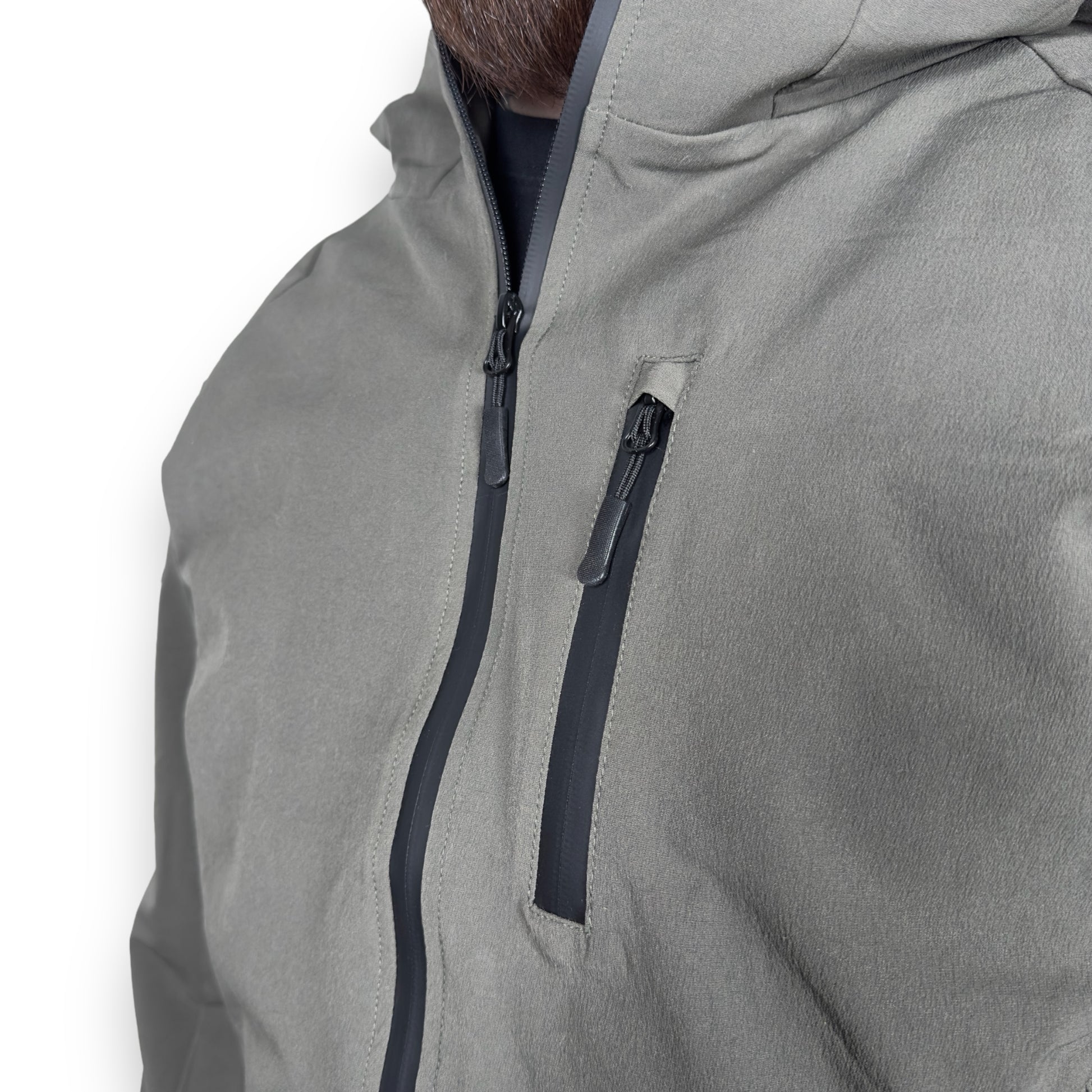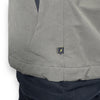 落ち着いた雰囲気のモスグレーのメイン素材は、表面は少しザラついたシャークスキンっぽい手触り。反射が少なく弱撥水性能もあり、更にストレッチも効いた柔軟性も併せ持ちます。ナイロンジャケット特有の、生地通しの擦れるシャカシャカ音もありません。