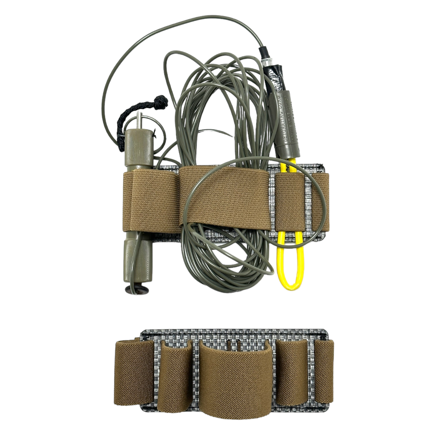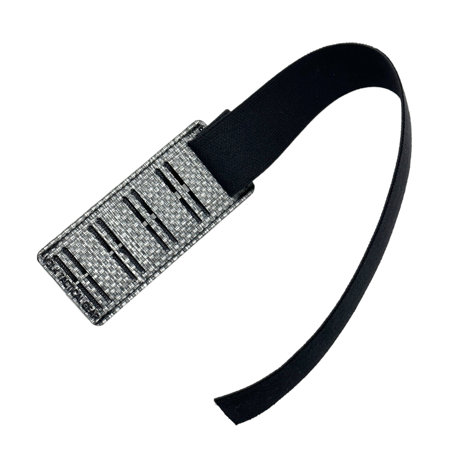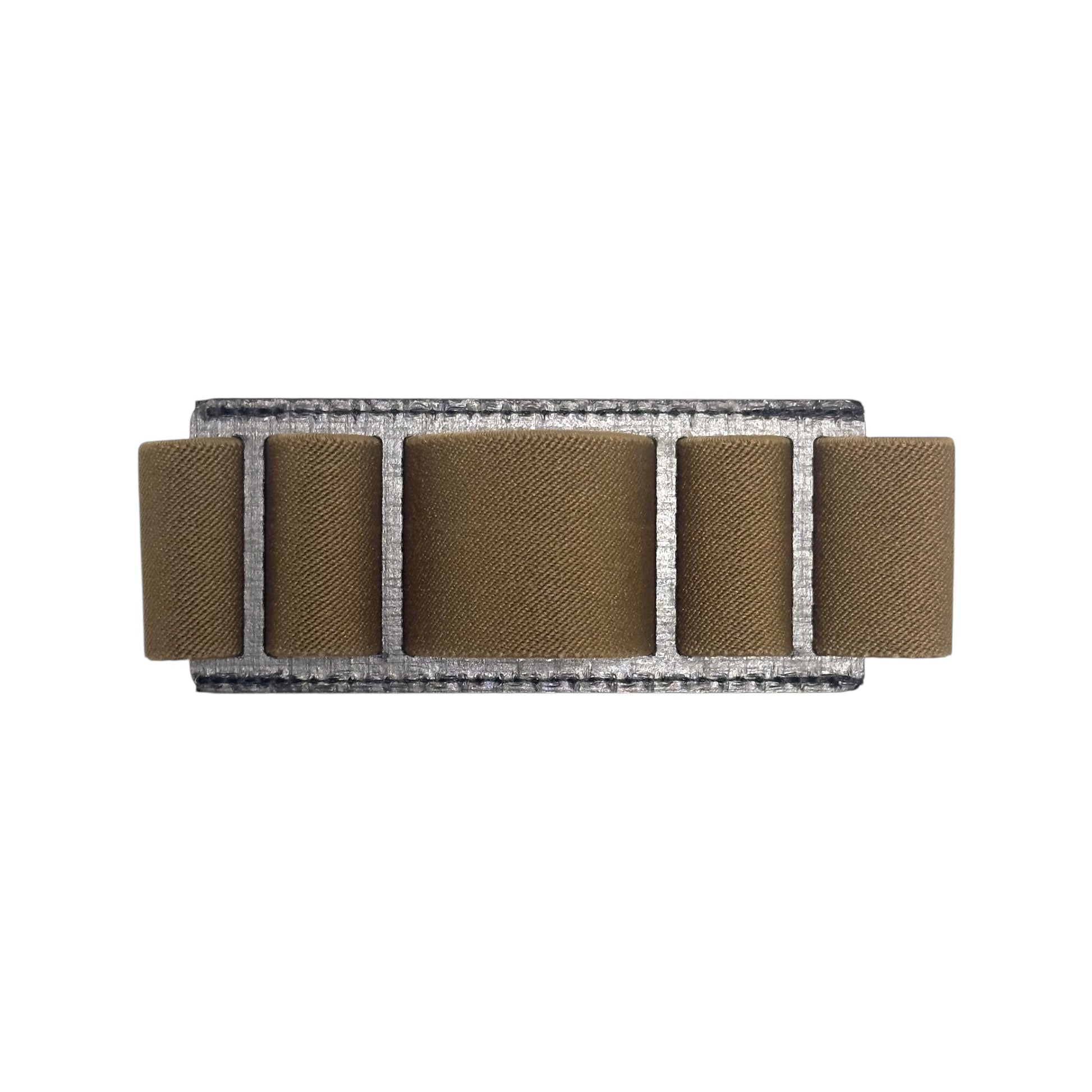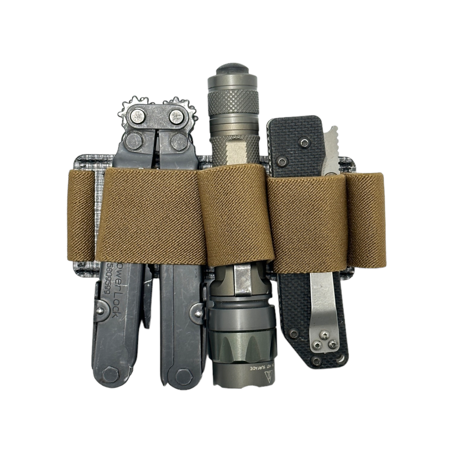 カーヴプレートにレーザーカットしたスリット部分に1.5インチ幅のエラスティックバンドを交互に通し、好きなサイズのループを作りアイテムを固定、携行します。余ったエラスティックは背面部に折り畳み、上からベルクロフックのフラップでフタをします。