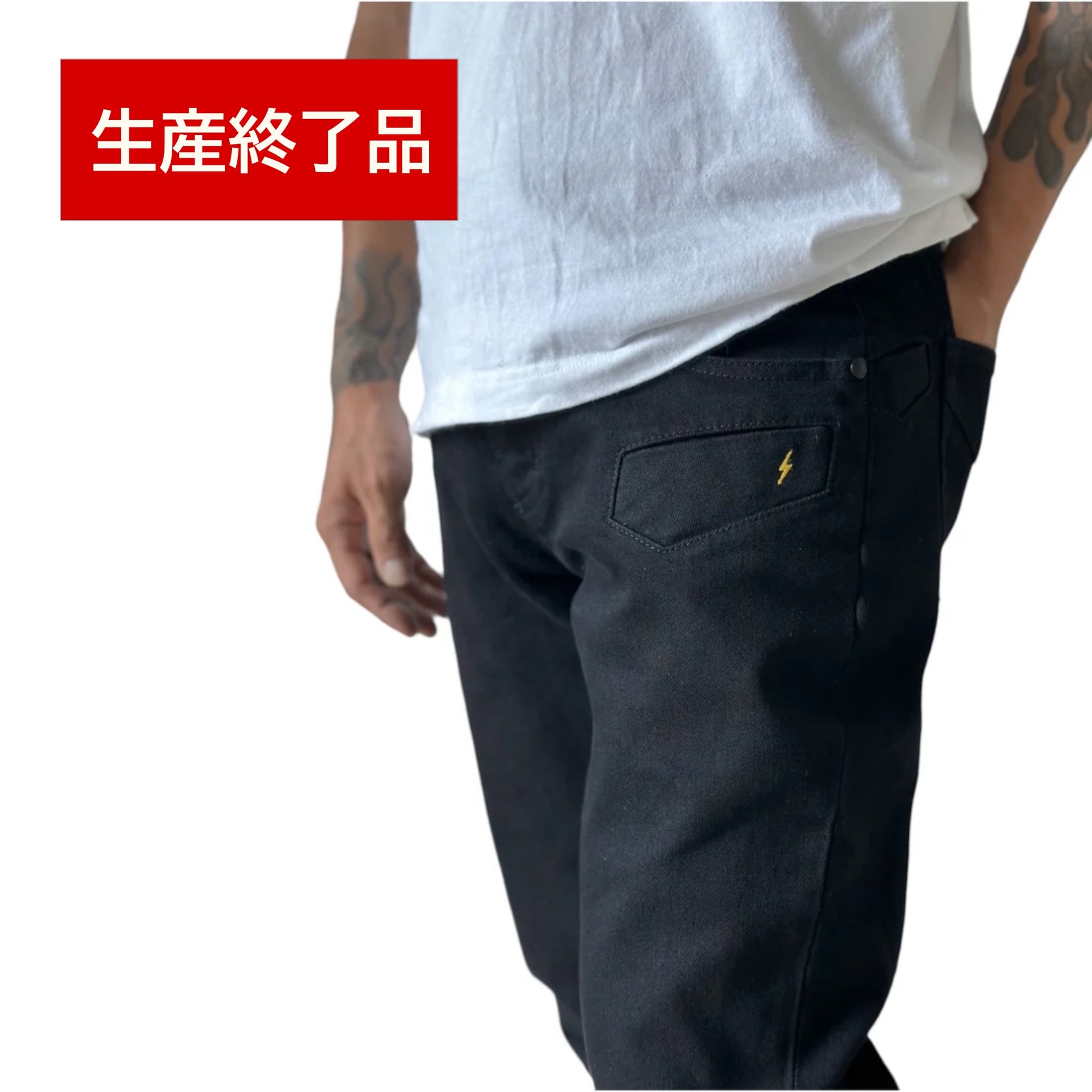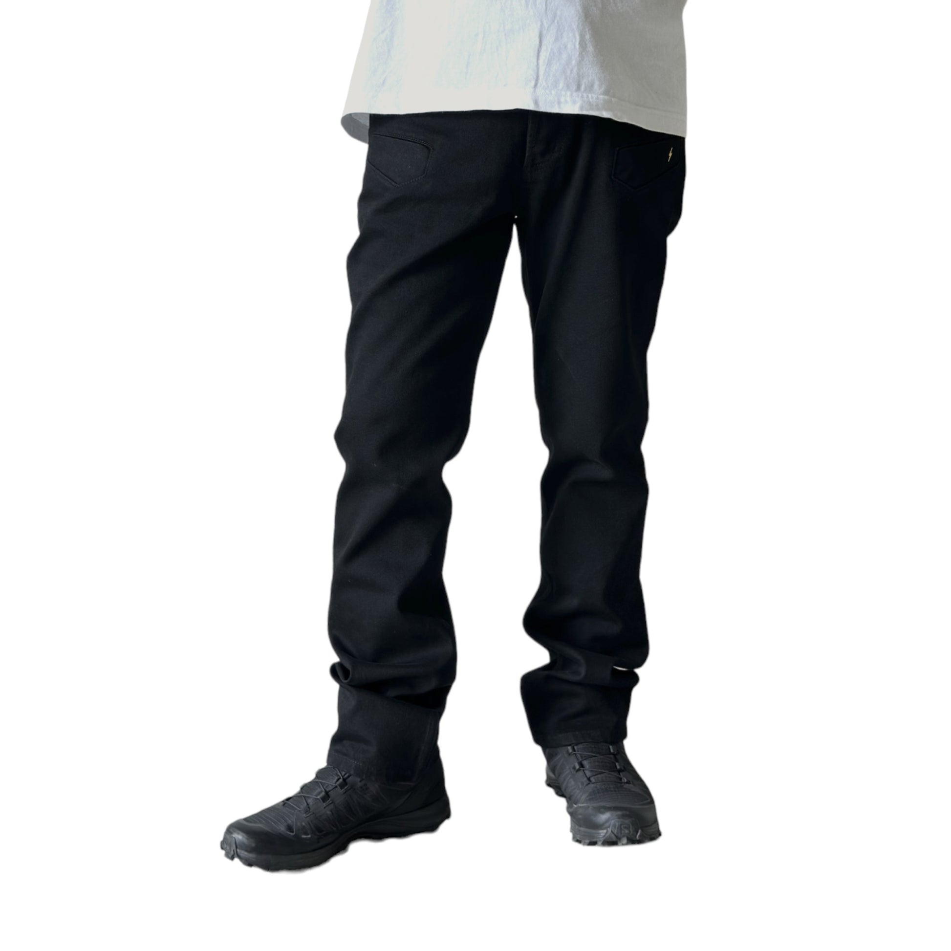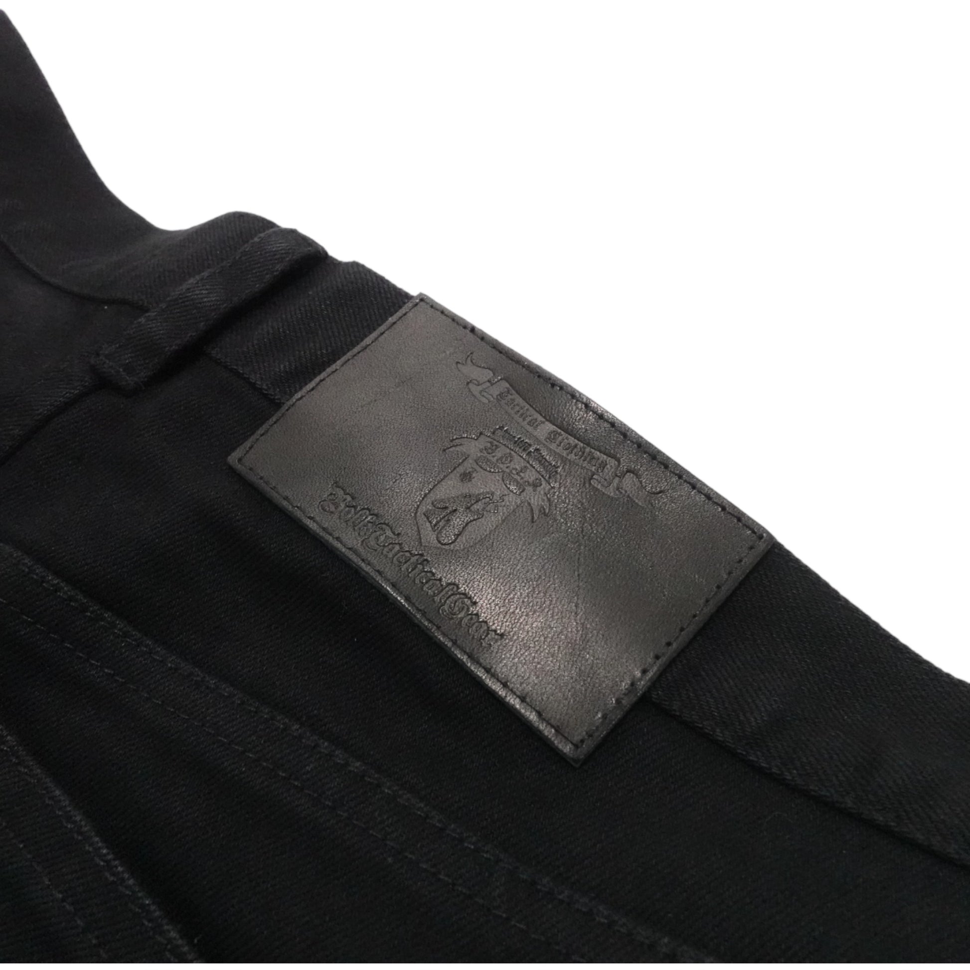 一般的なデニムパンツは全て横糸が白色となっておりますが、本品は縦糸、横糸の両方をブラックにする事でより深みのあるブラック(真っ黒)に仕上げています。