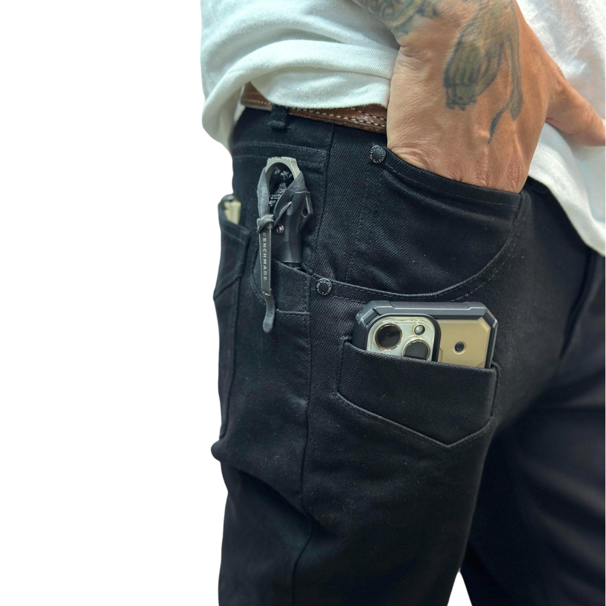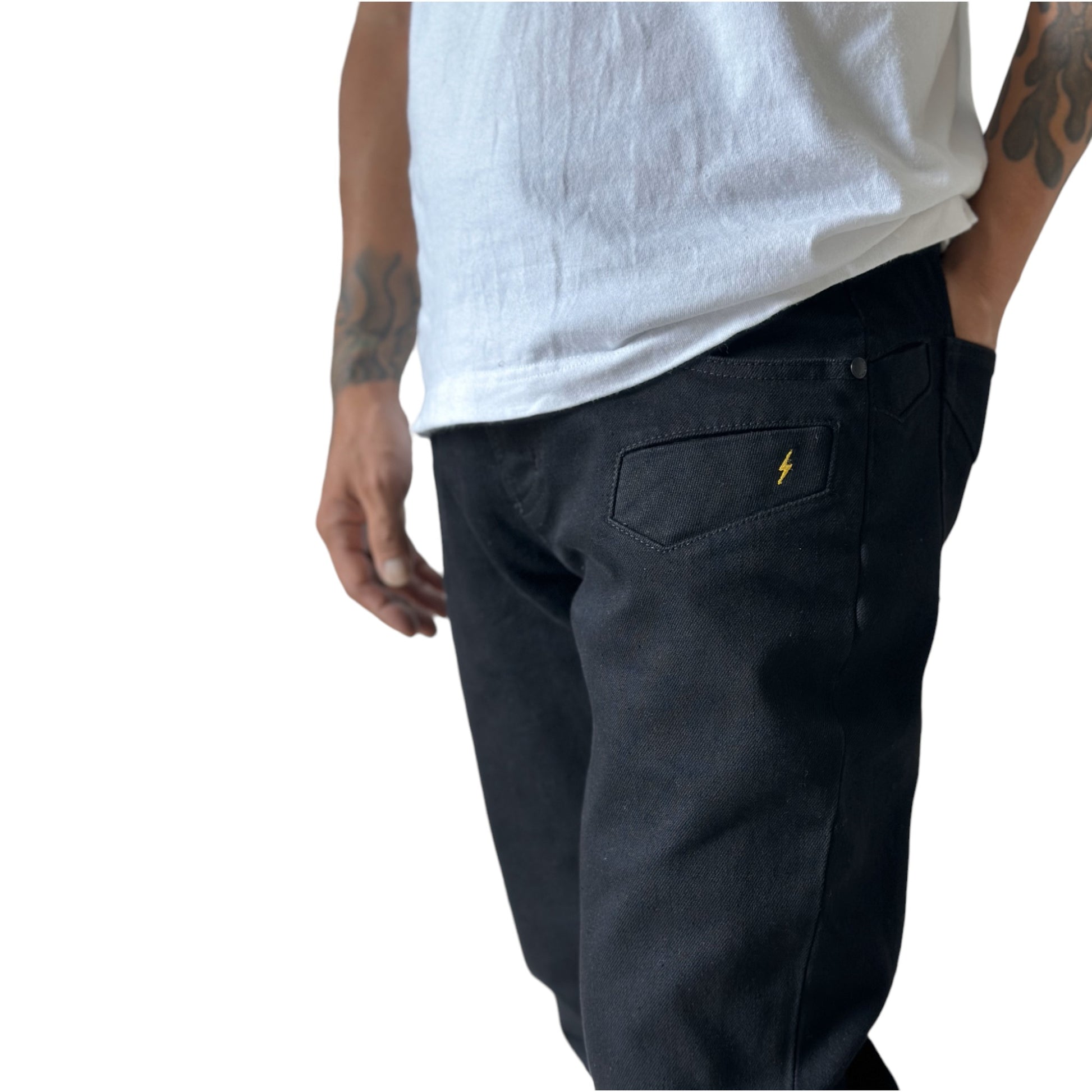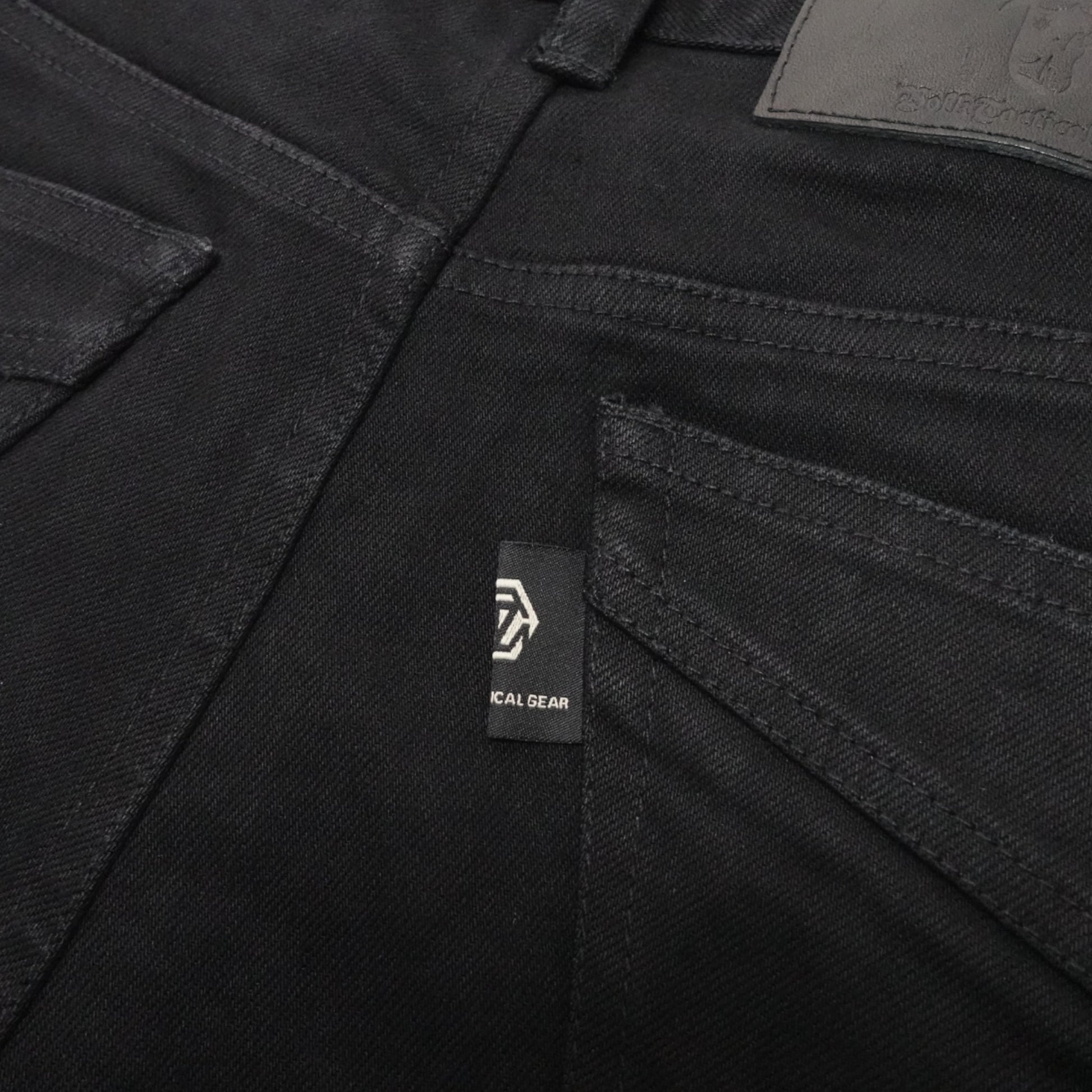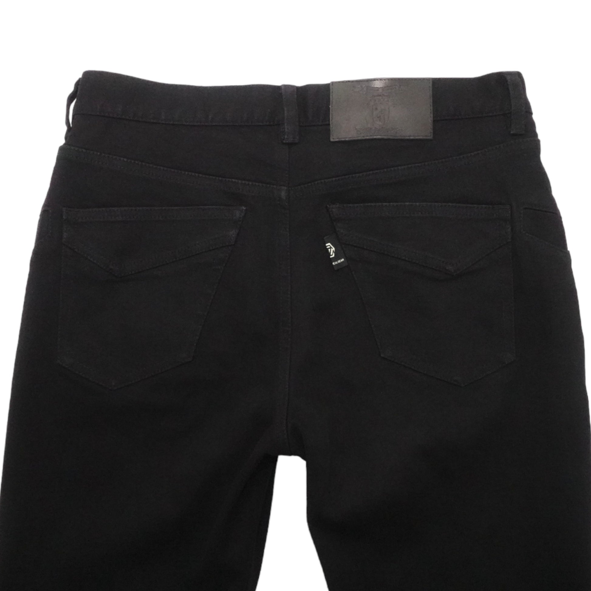 一般的なデニムパンツは全て横糸が白色となっておりますが、本品は縦糸、横糸の両方をブラックにする事でより深みのあるブラック(真っ黒)に仕上げています。