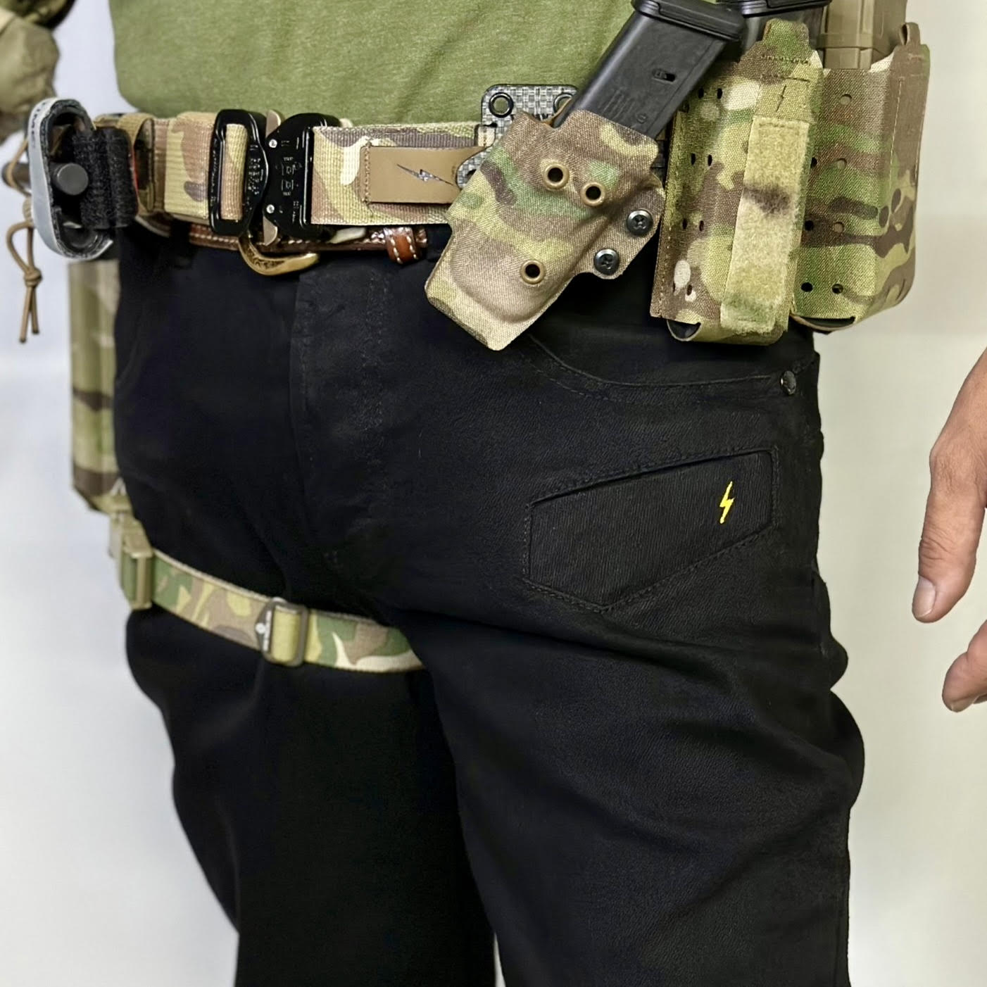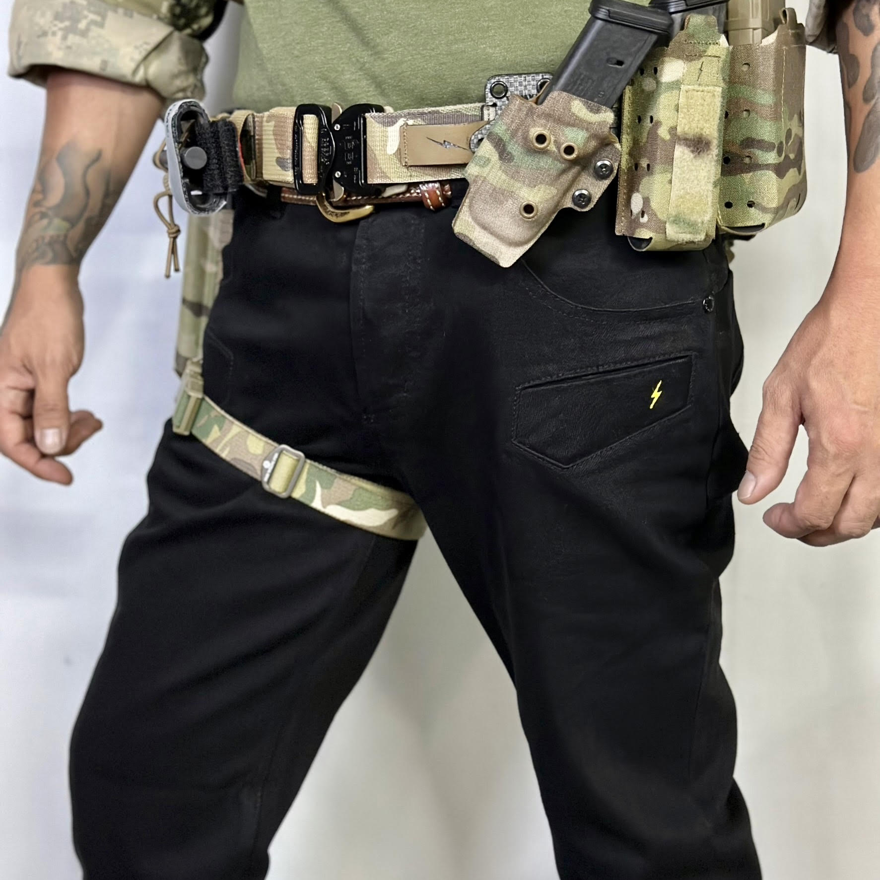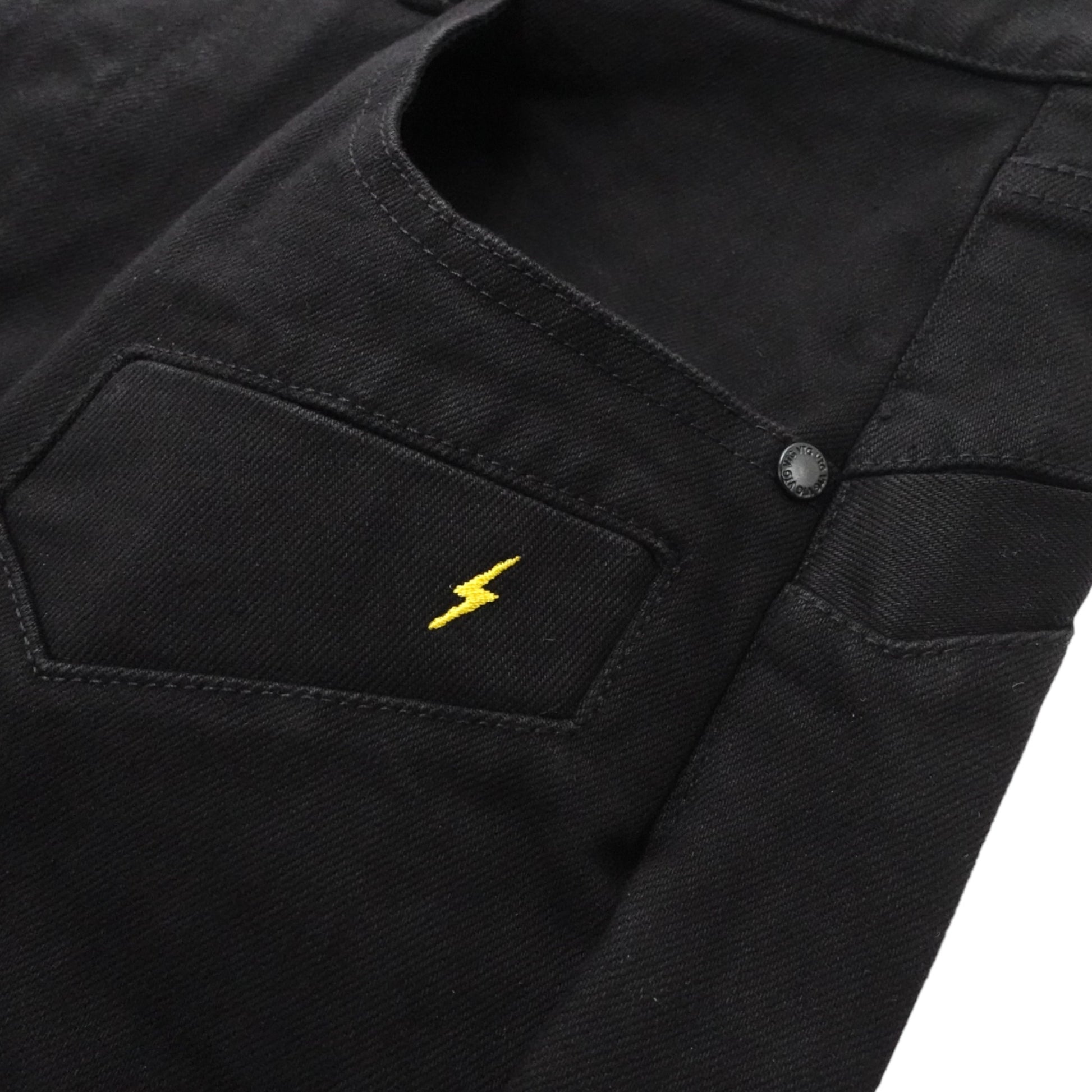 スマホやマガジンを入れるのにピッタリな太ももポケットの刺繍は濃いブラックの中に強いアクセントとなるイナズマロゴに。